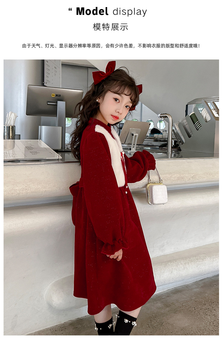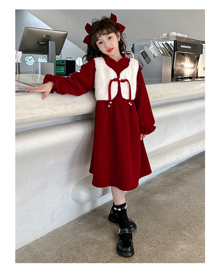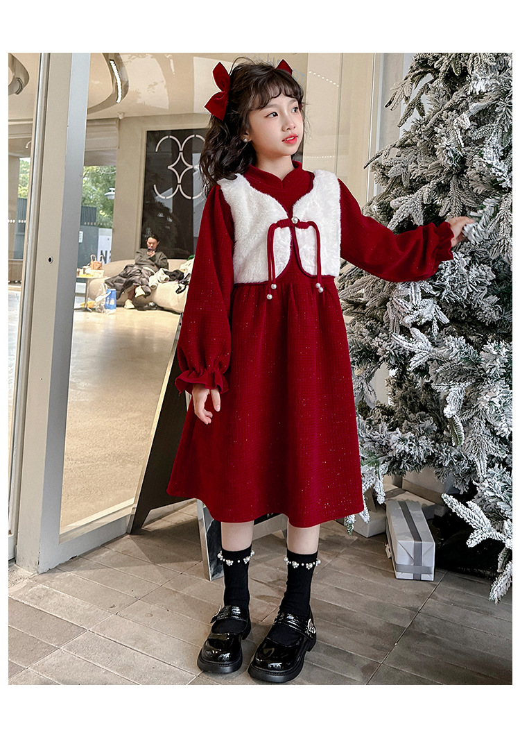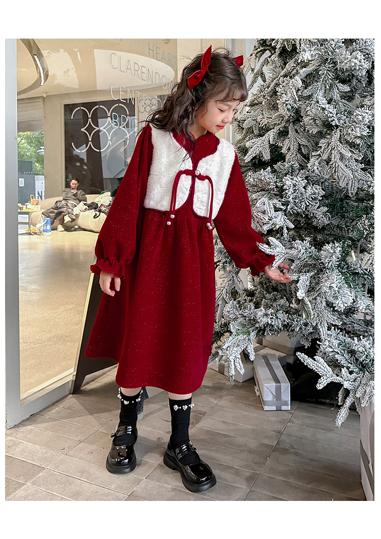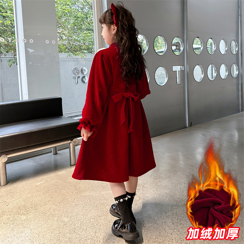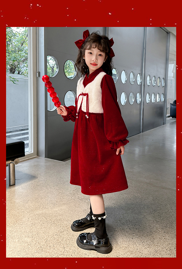 女童冬季年服裙连衣裙2023新款儿童加绒加厚保暖新年马甲公主裙子