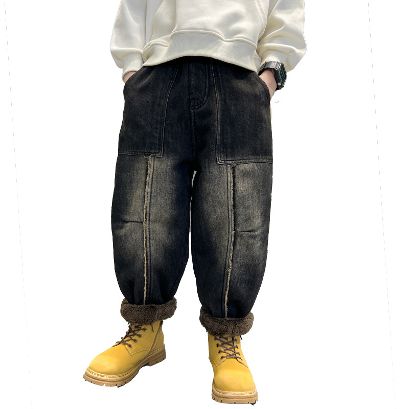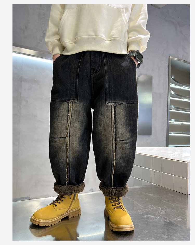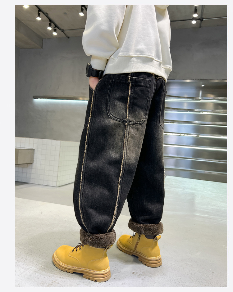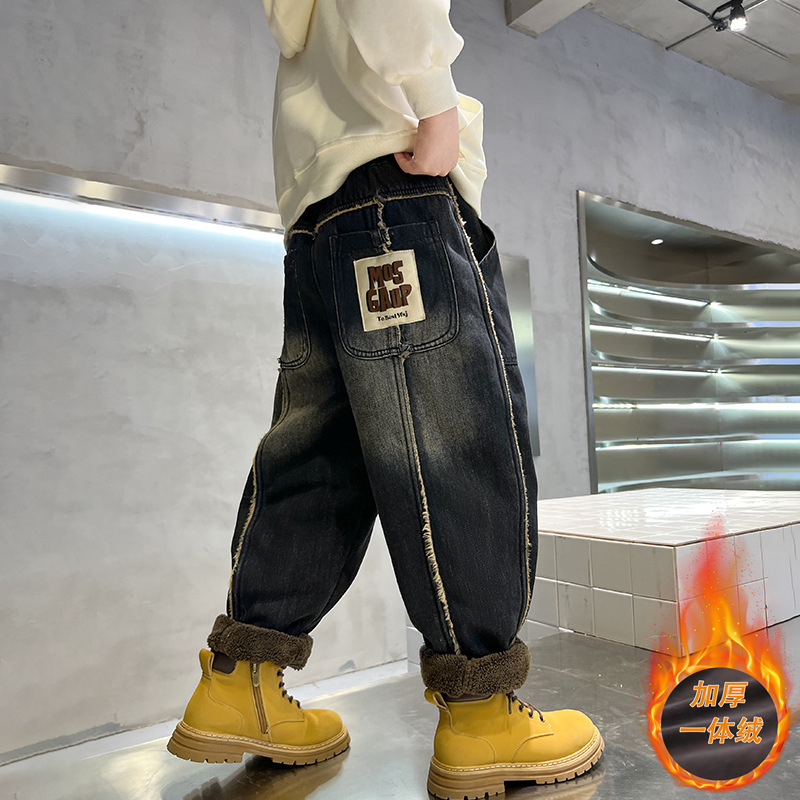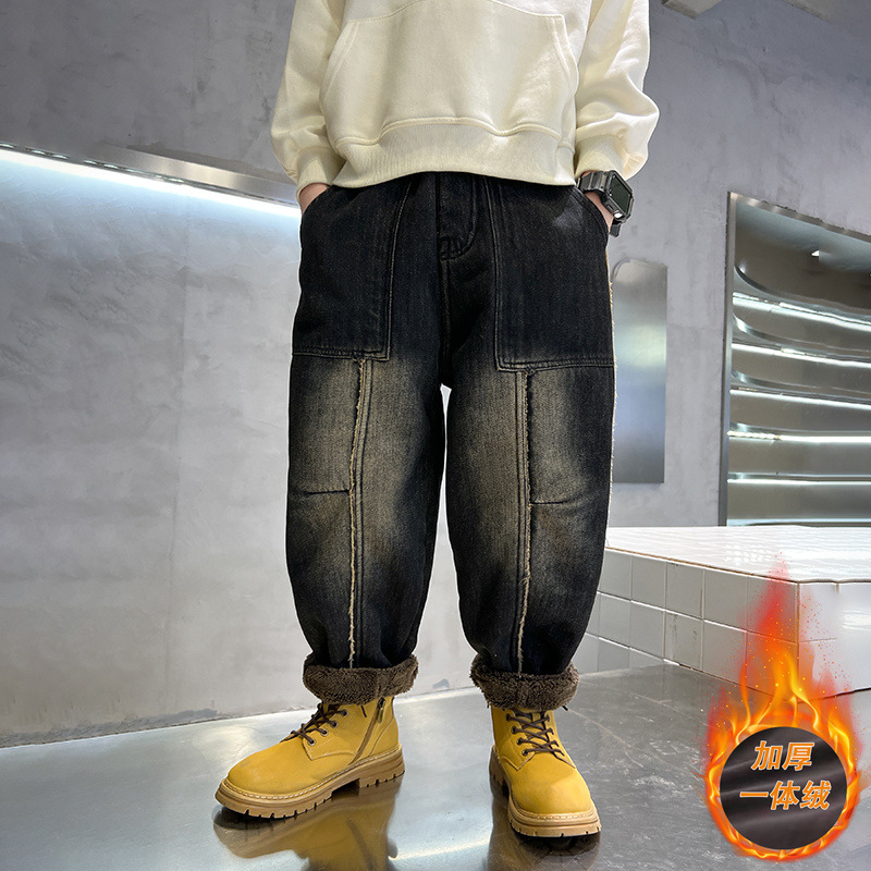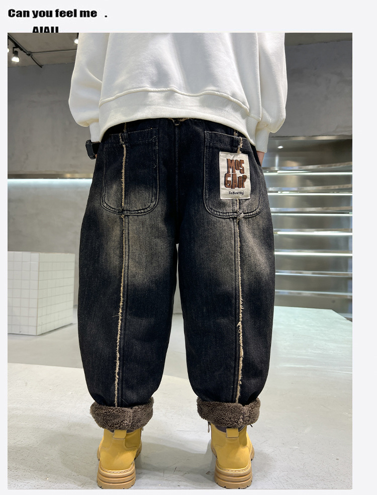 男童冬季拼接毛边牛仔裤2023新款大儿童加绒加厚保暖休闲裤长裤子