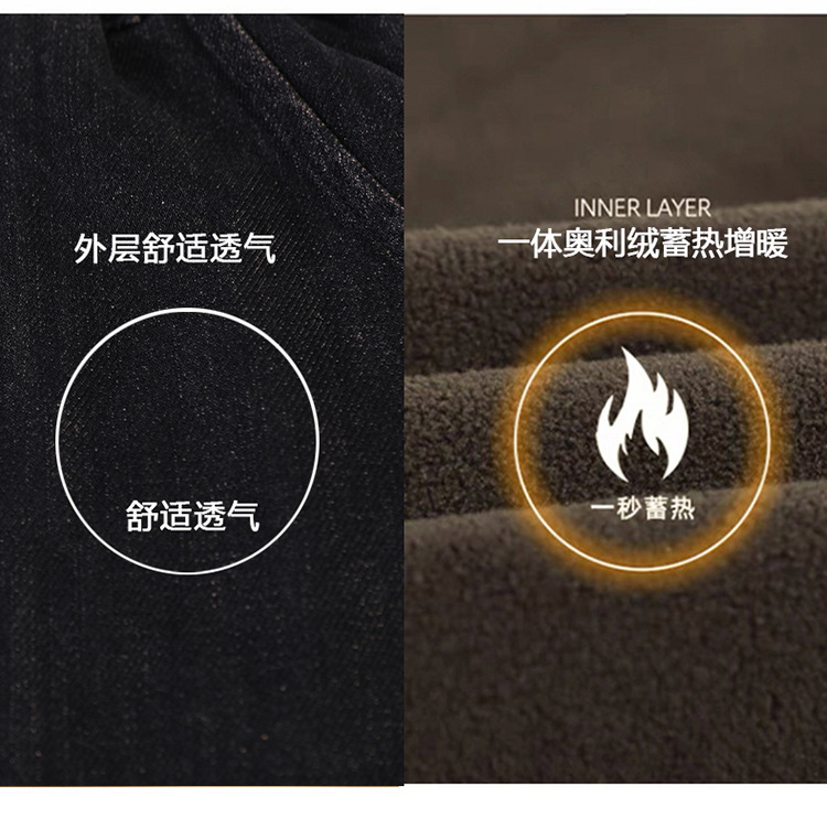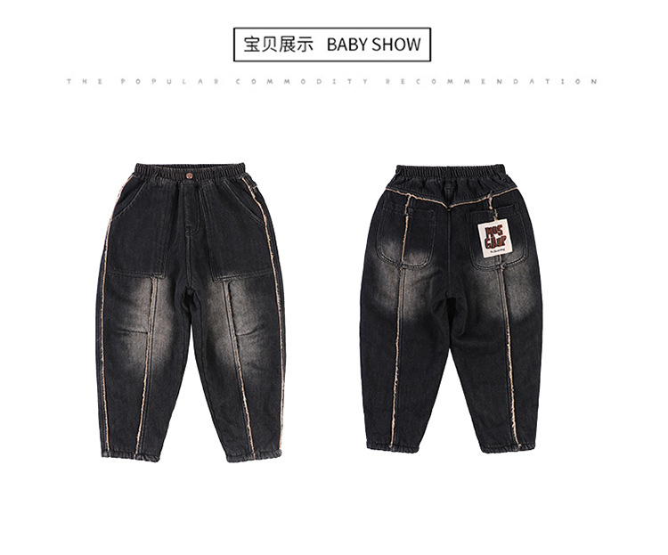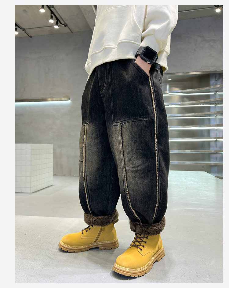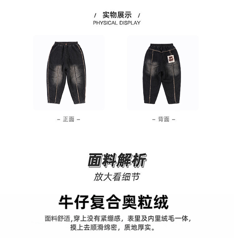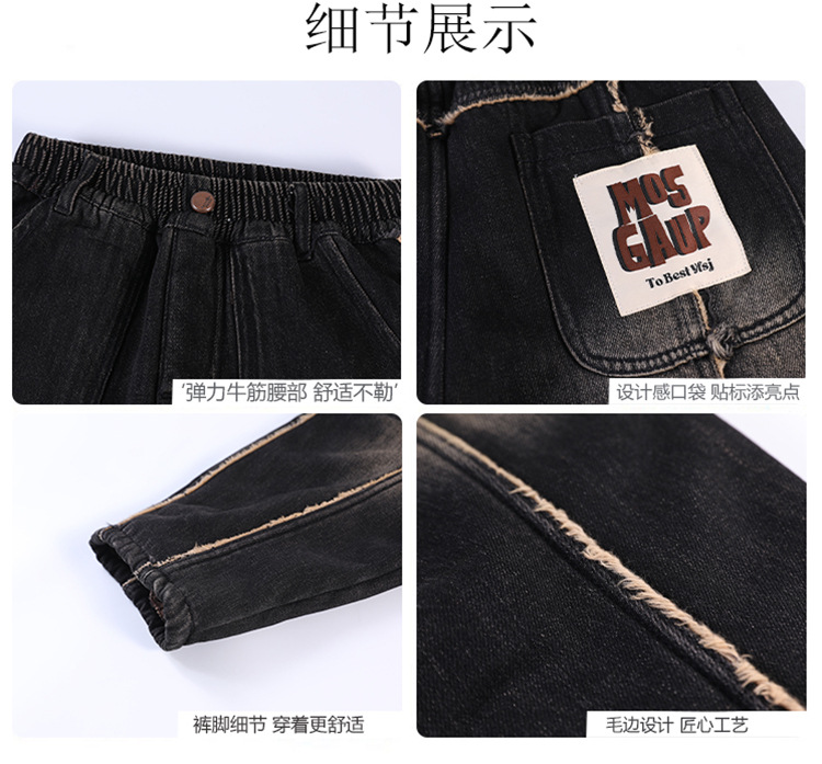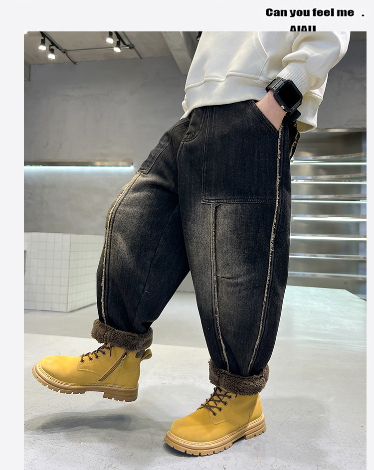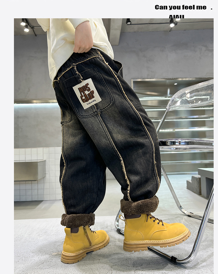 男童冬季拼接毛边牛仔裤2023新款大儿童加绒加厚保暖休闲裤长裤子
