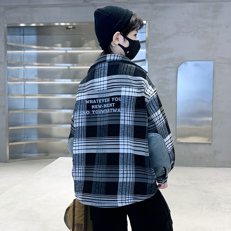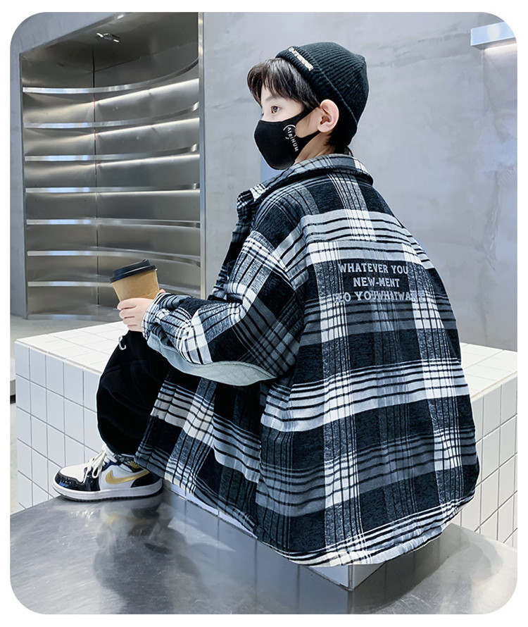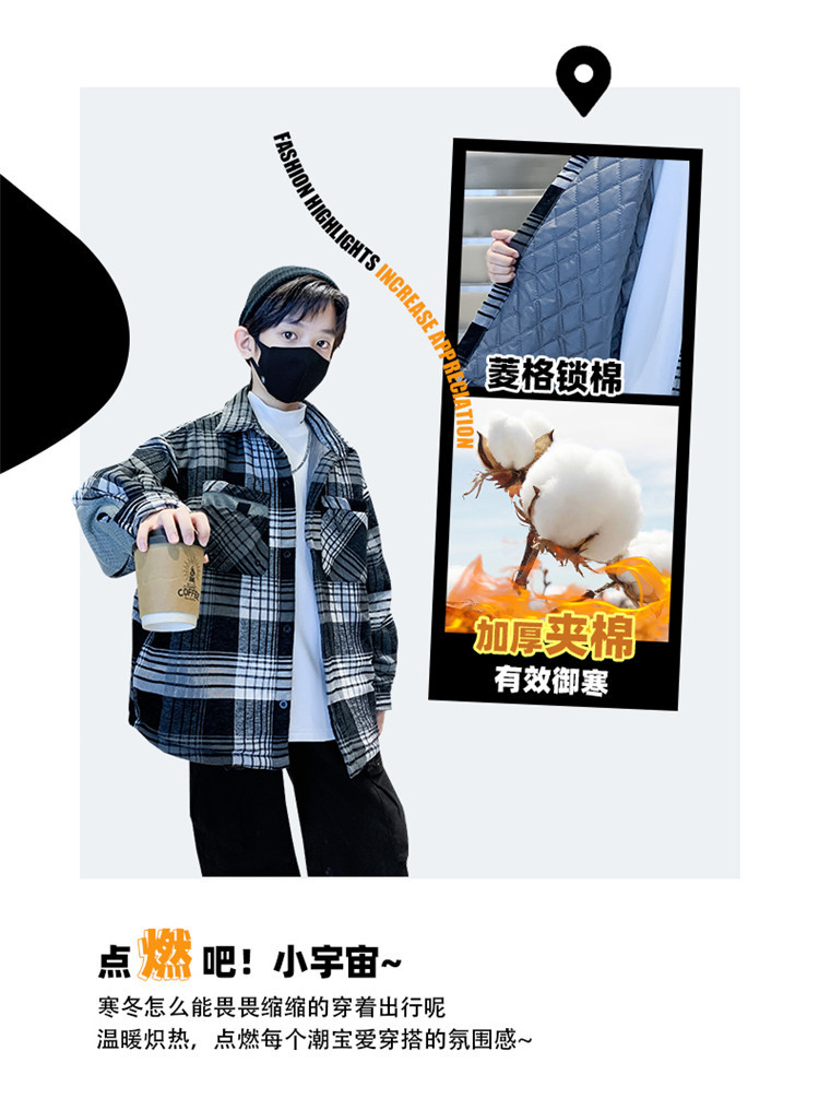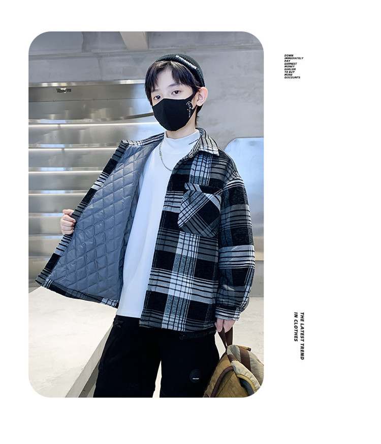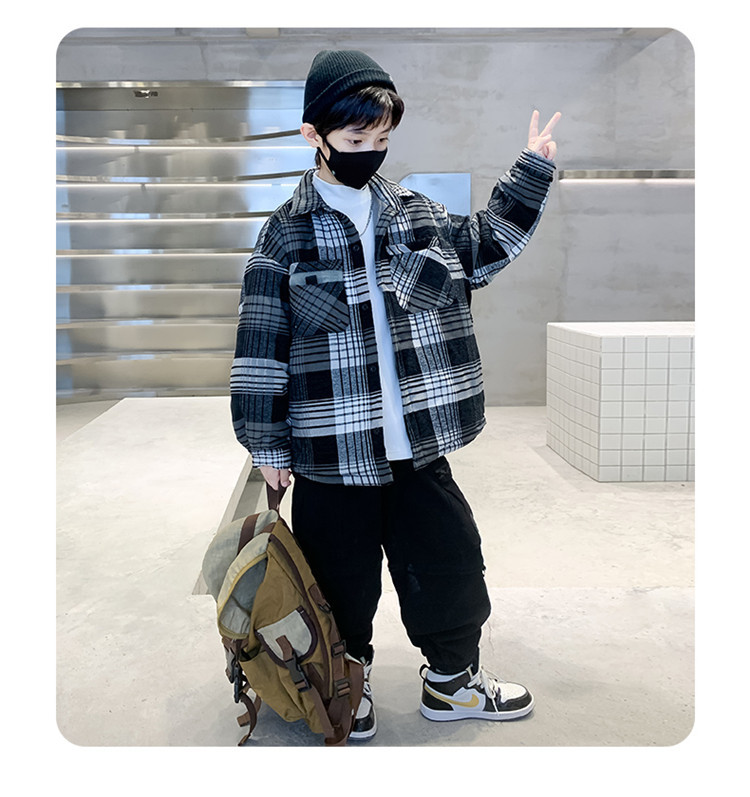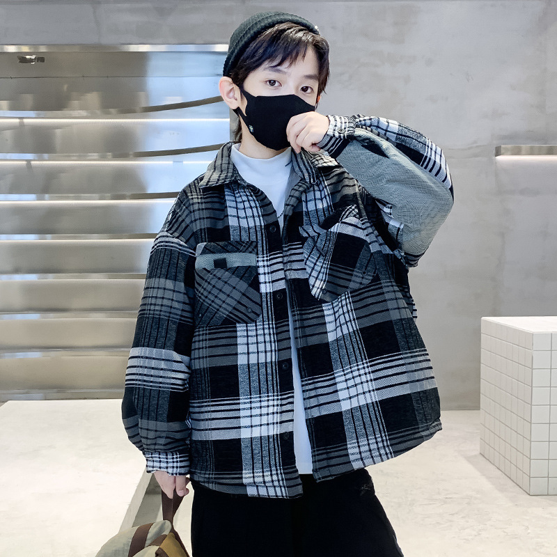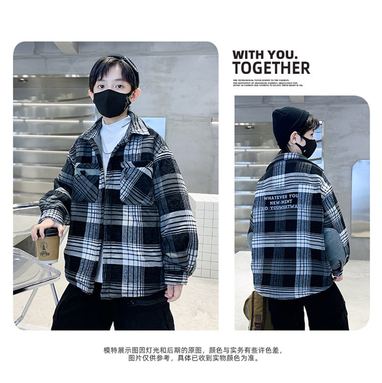 男童冬季格子加棉衬衫外套2023新款中大儿童加厚保暖夹克风衣冬装
