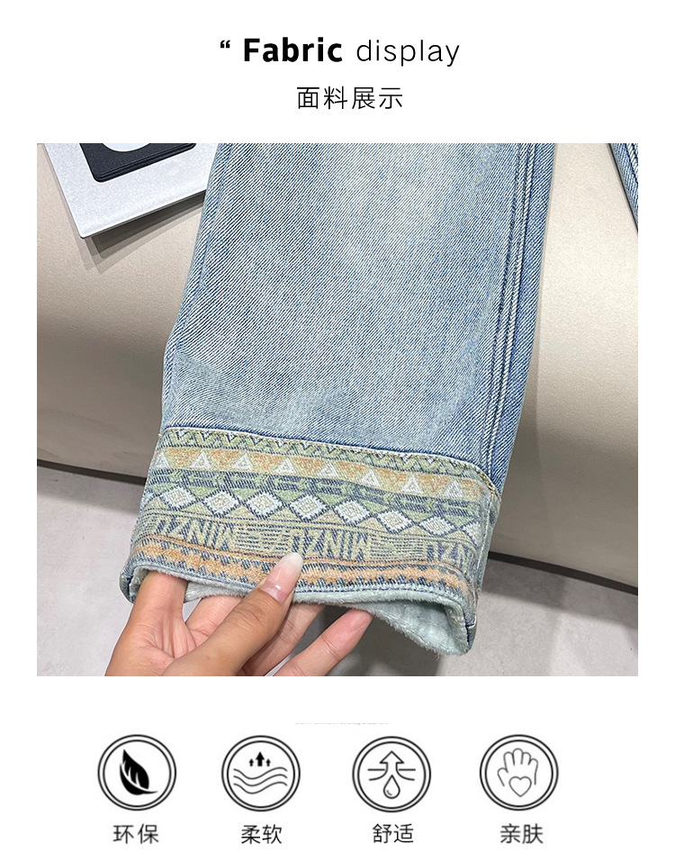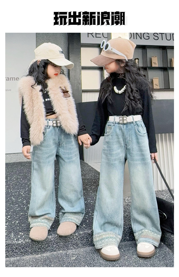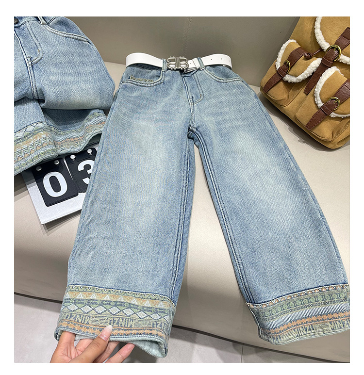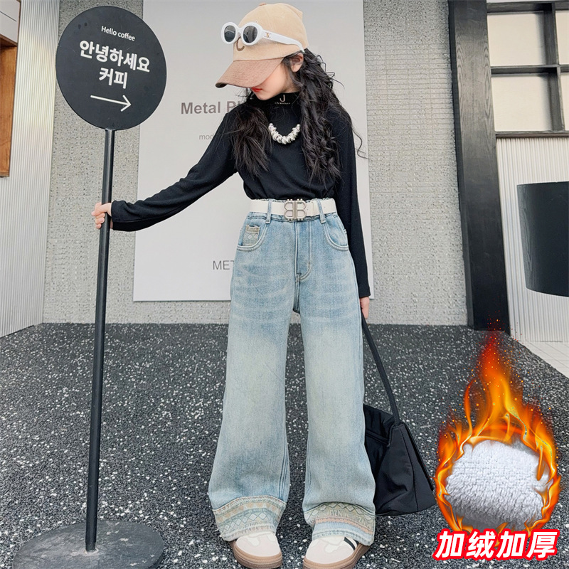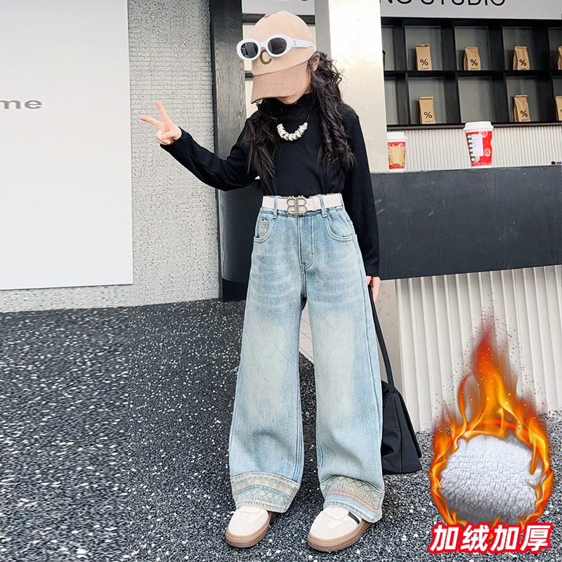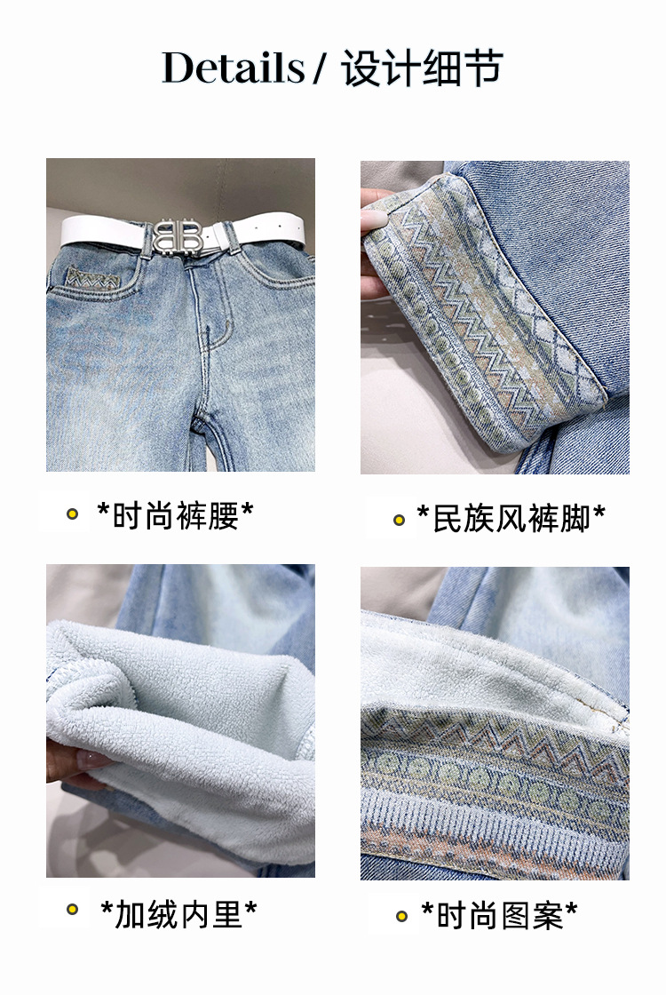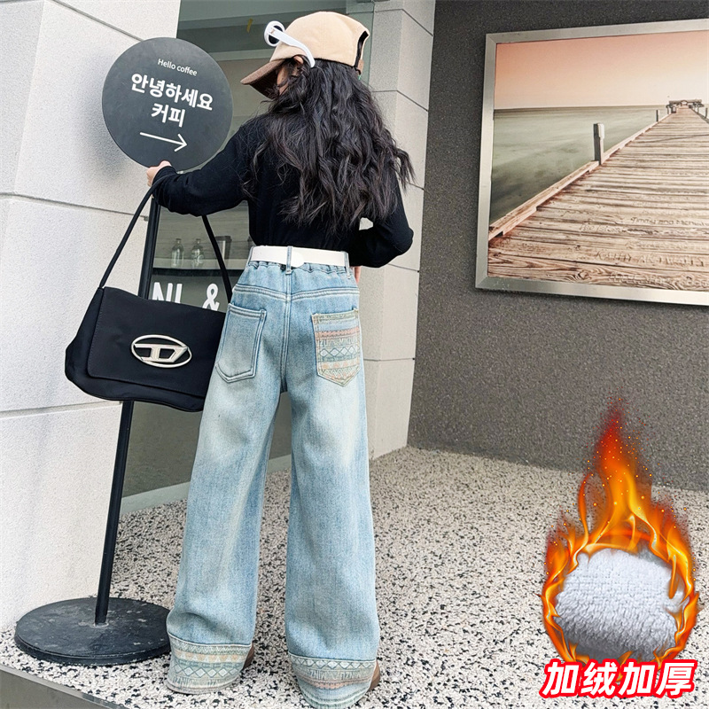 女童冬季加绒民族风牛仔裤2023新款中大儿童加厚保暖休闲裤长裤子
