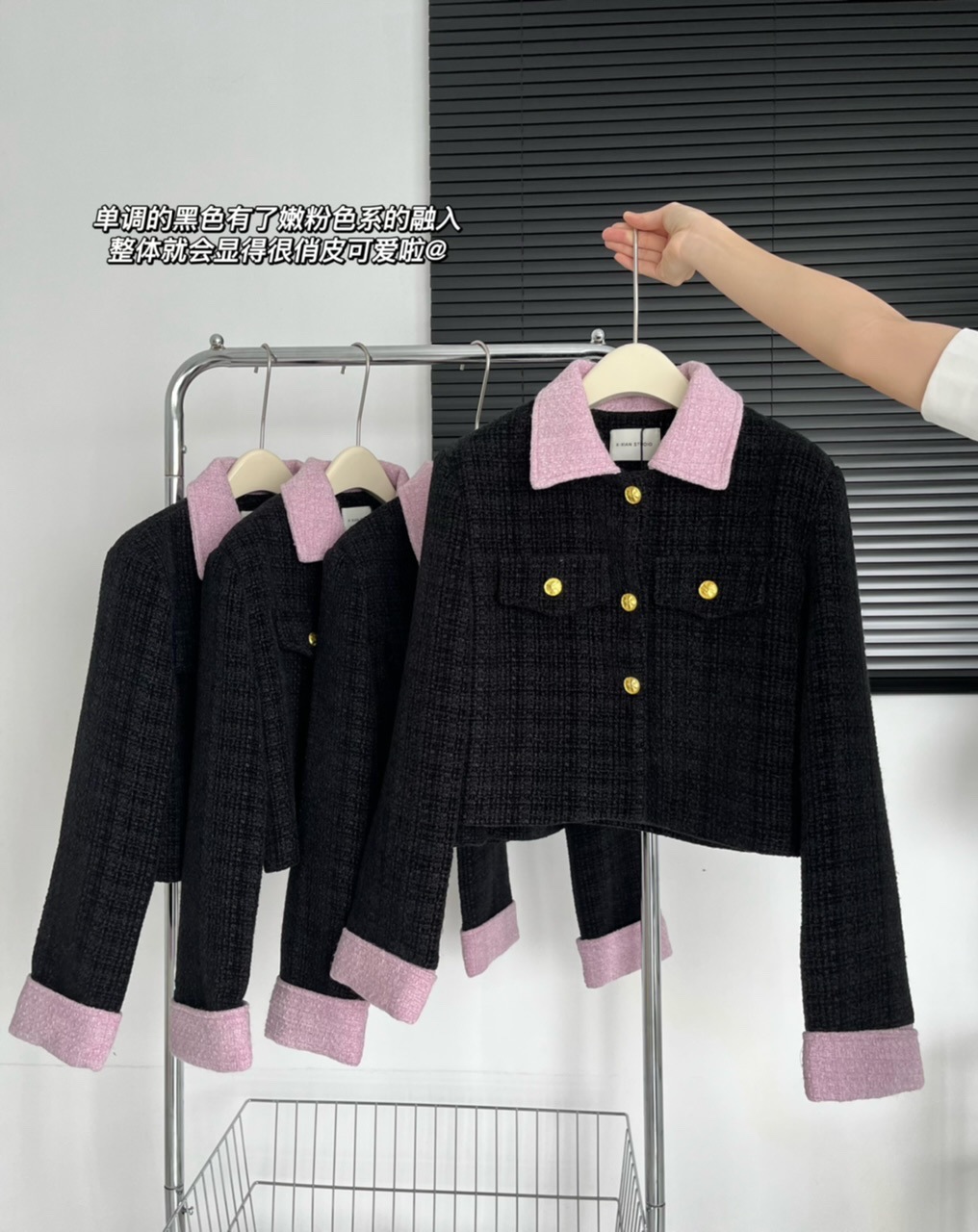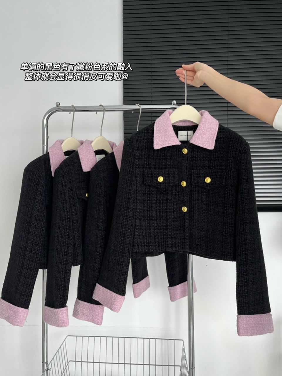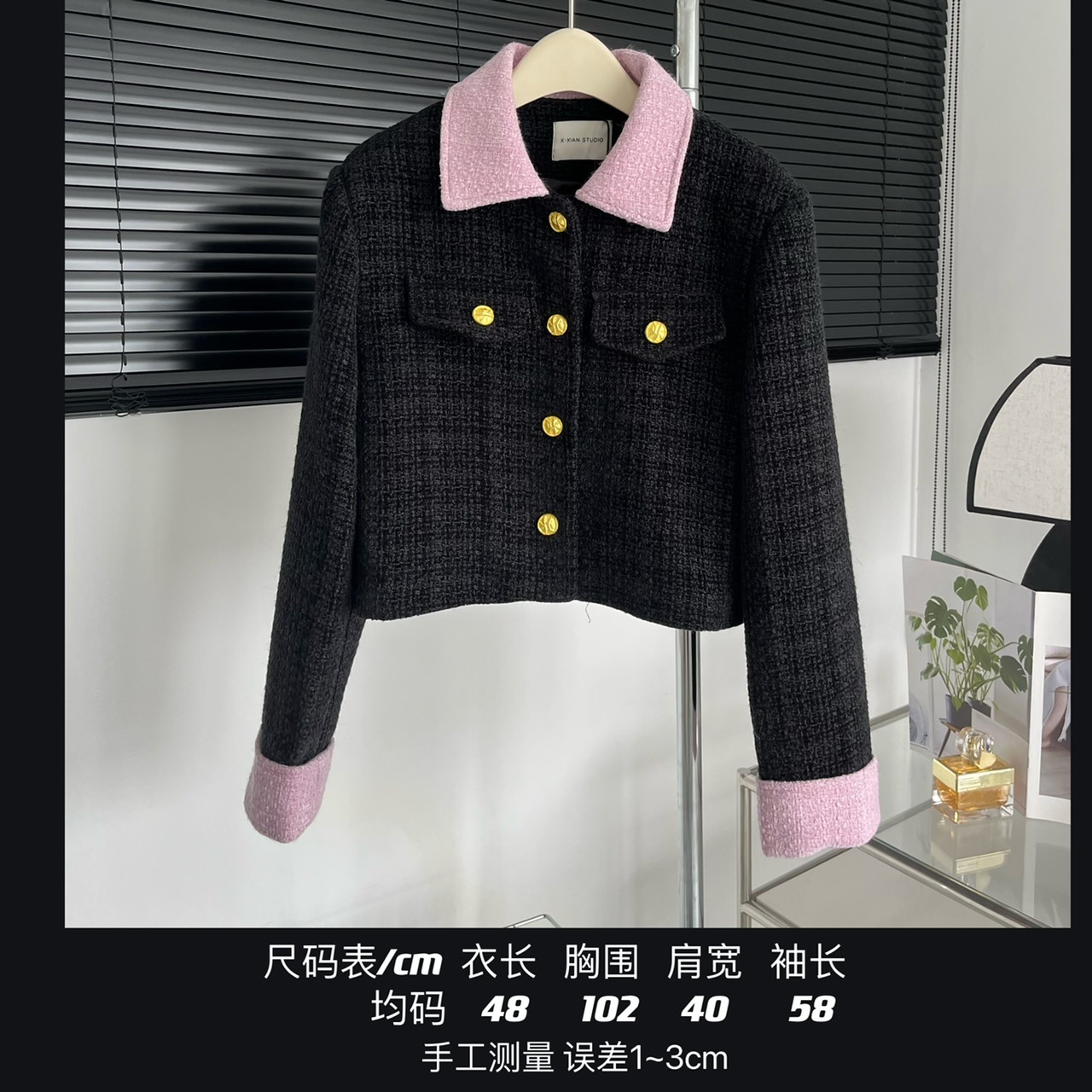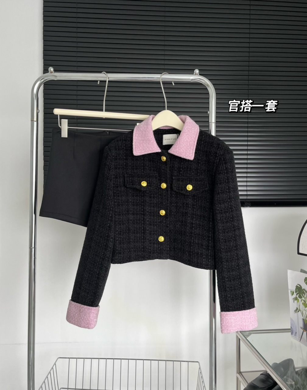 2023新款小香风黑粉拼色短款外套女宽松显瘦气质粗花呢上衣早秋