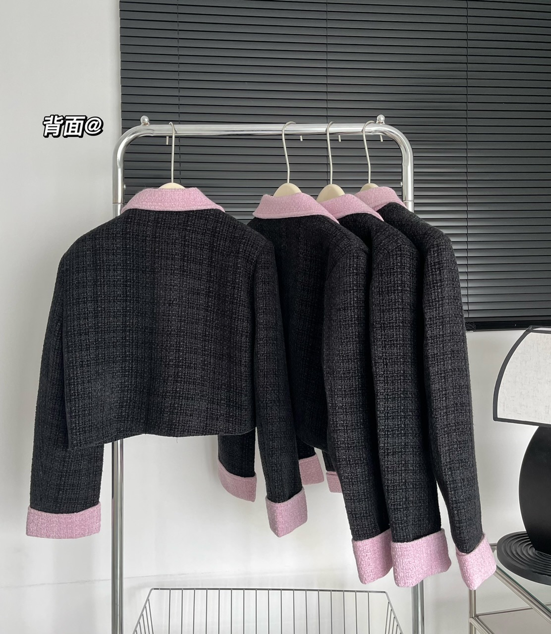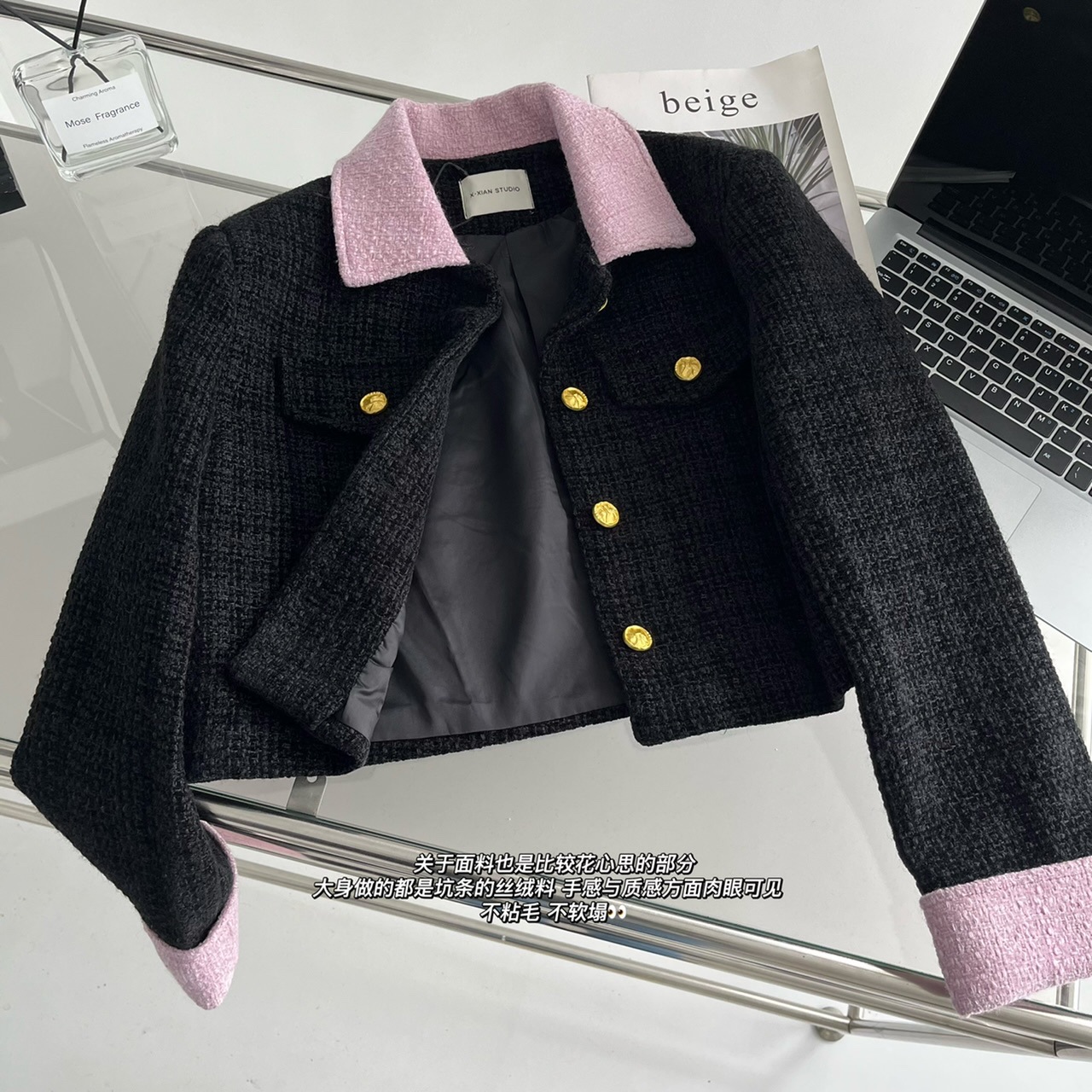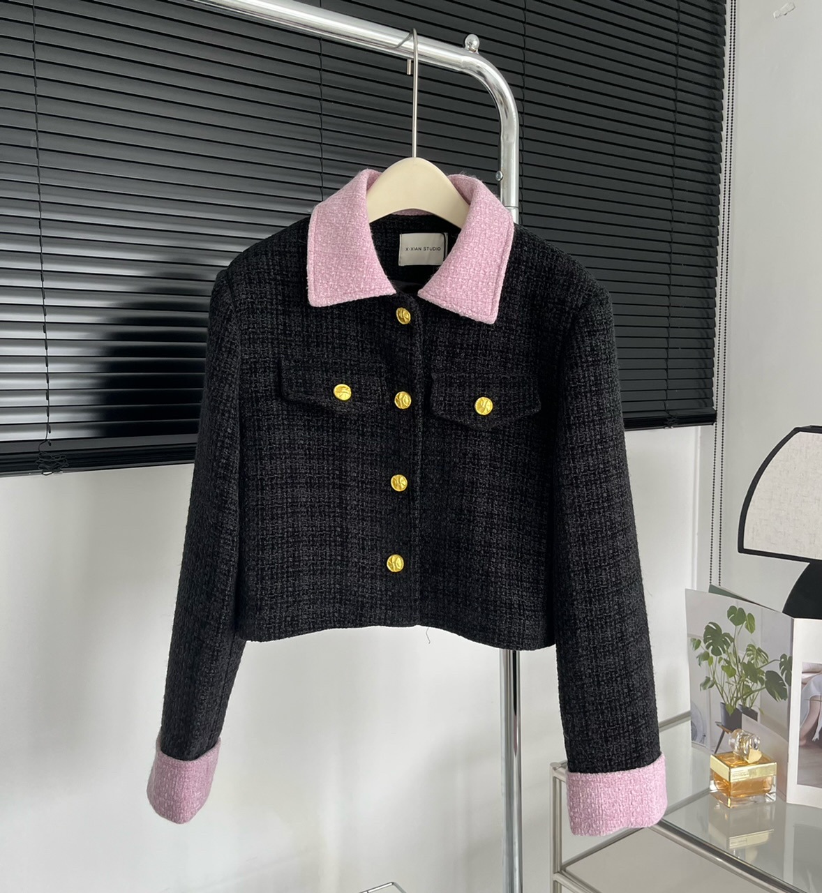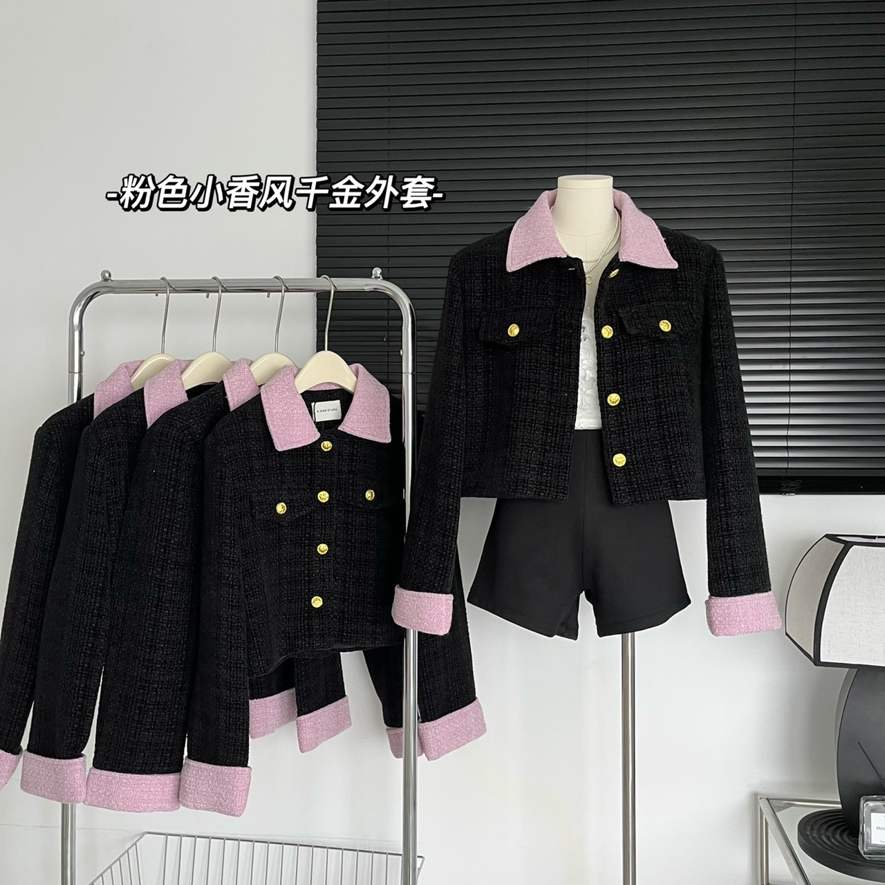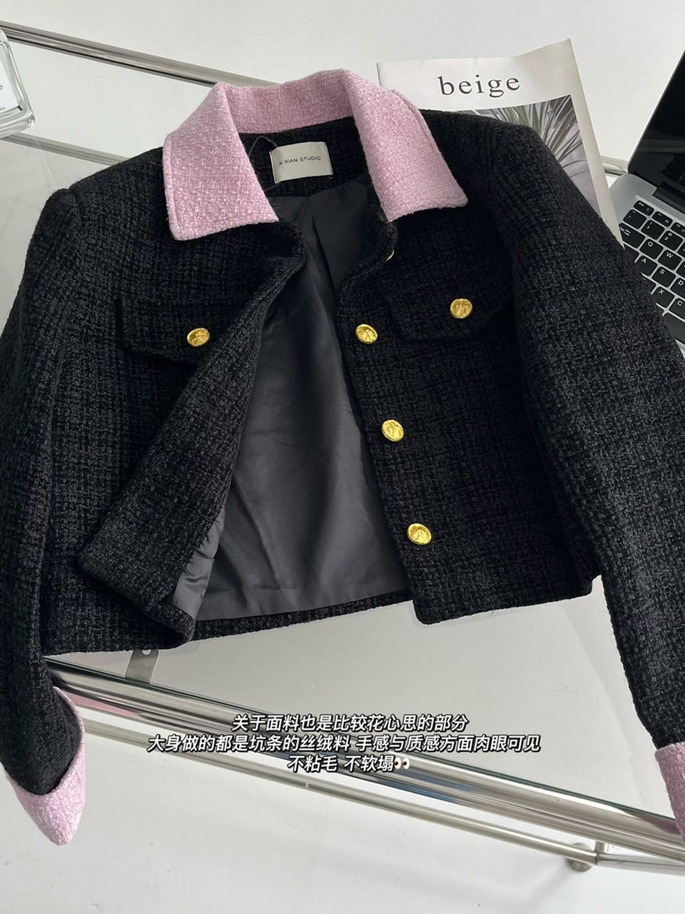 2023新款小香风黑粉拼色短款外套女宽松显瘦气质粗花呢上衣早秋