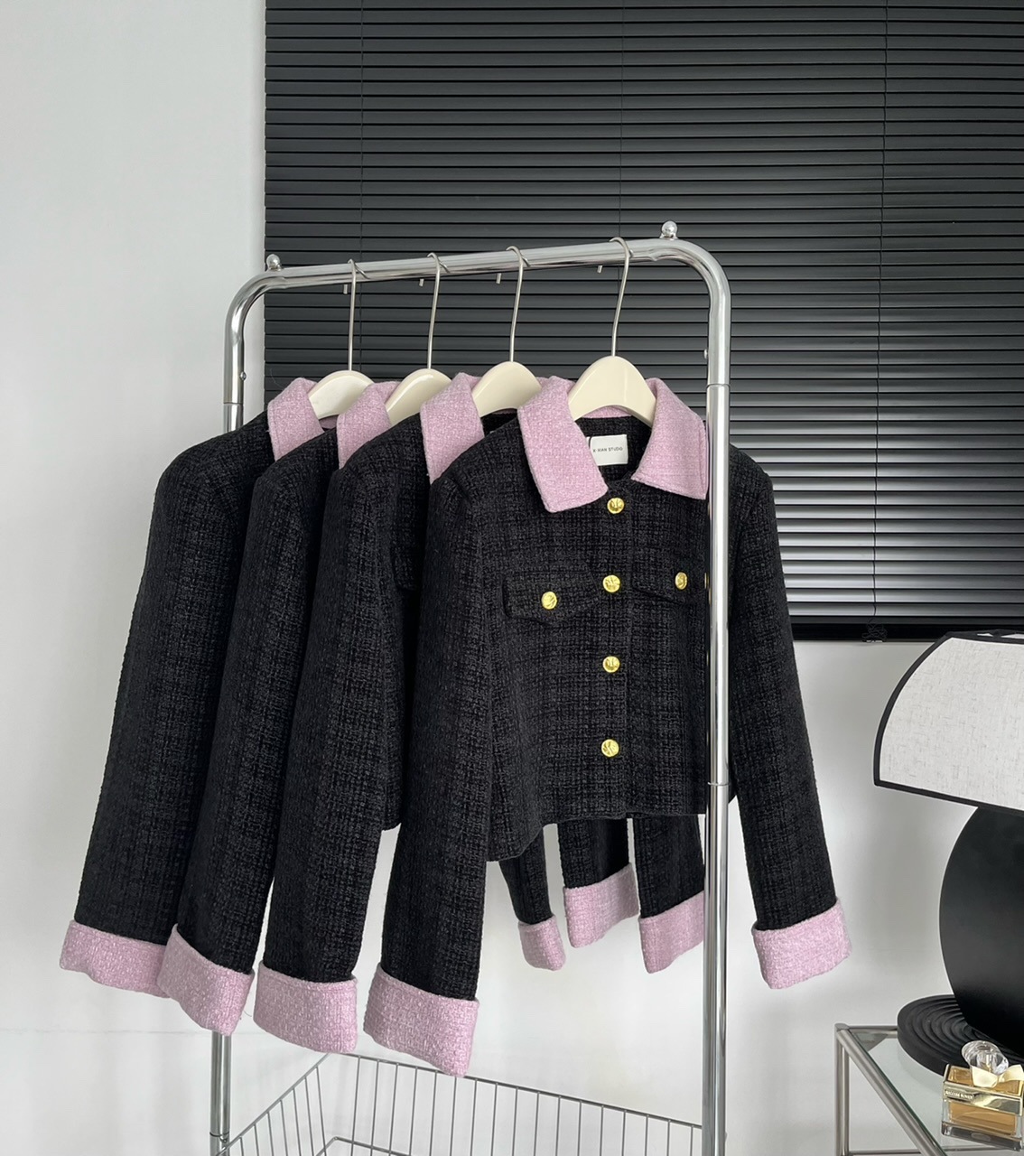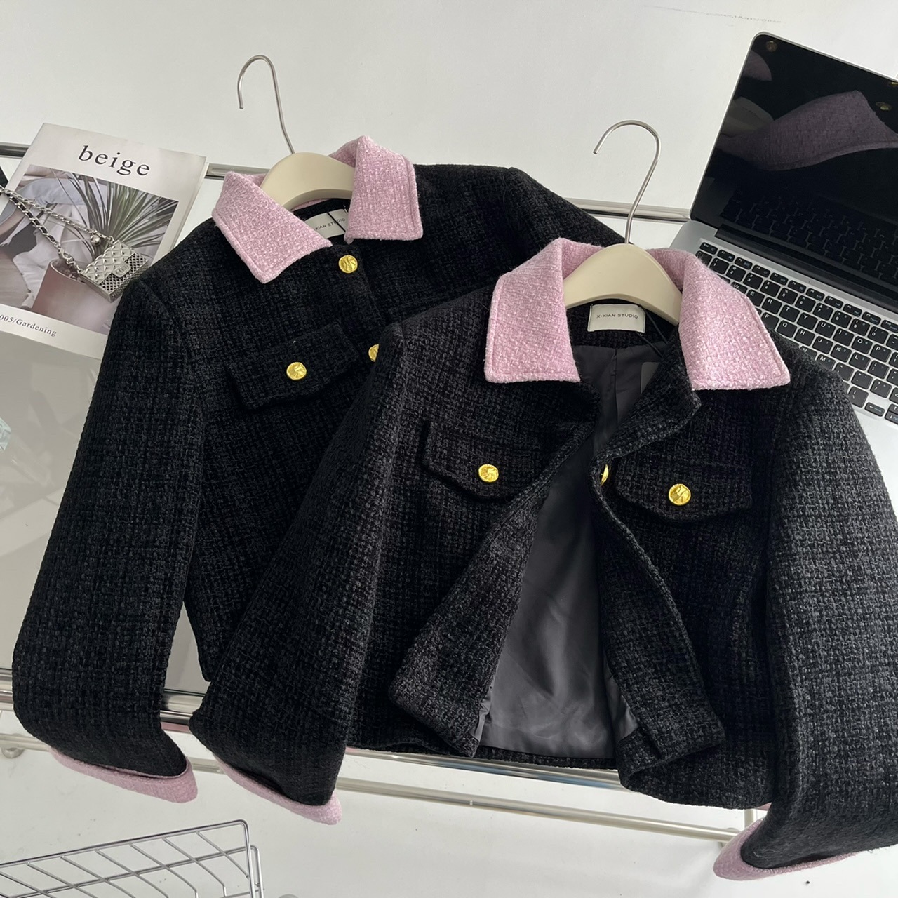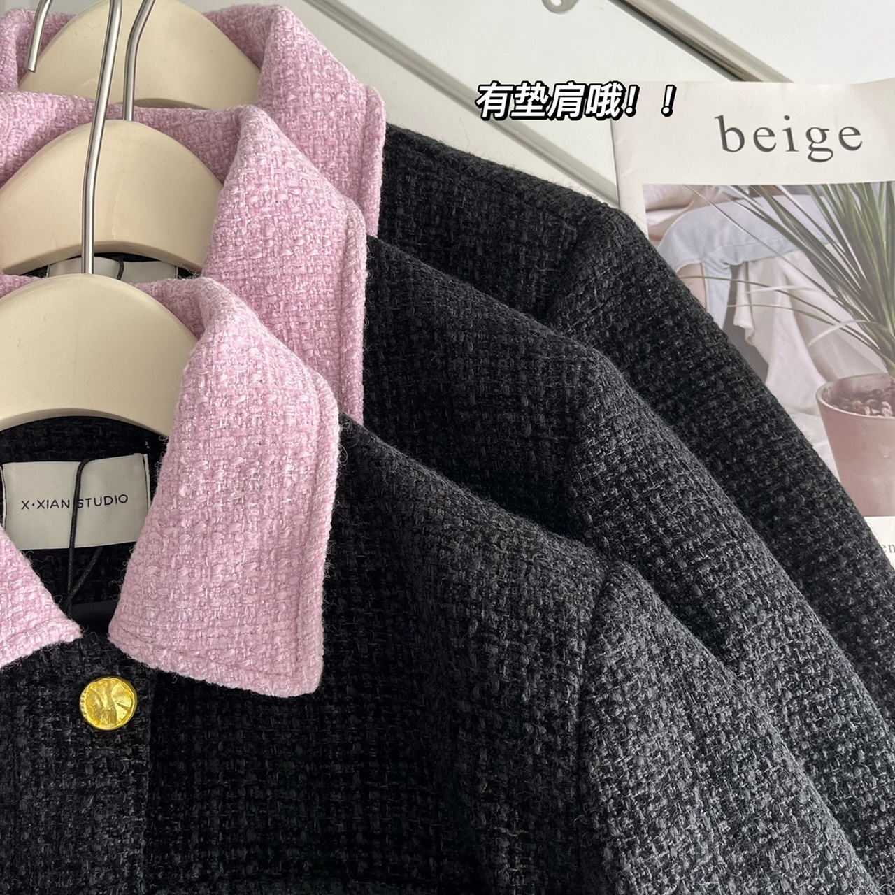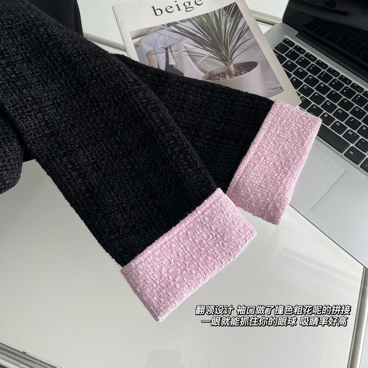 2023新款小香风黑粉拼色短款外套女宽松显瘦气质粗花呢上衣早秋