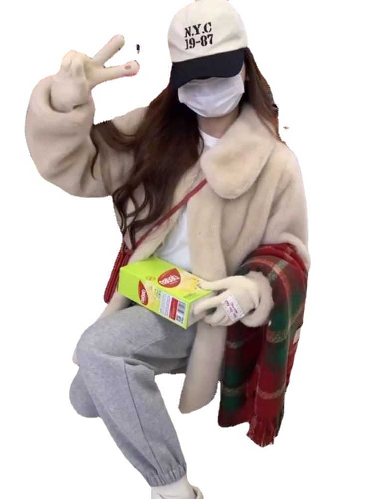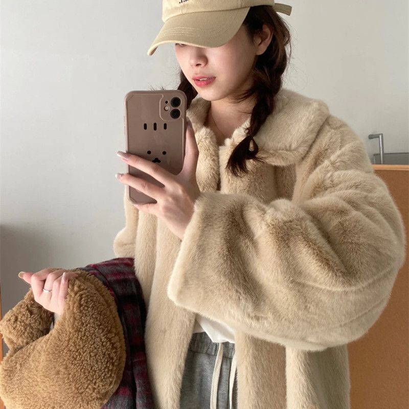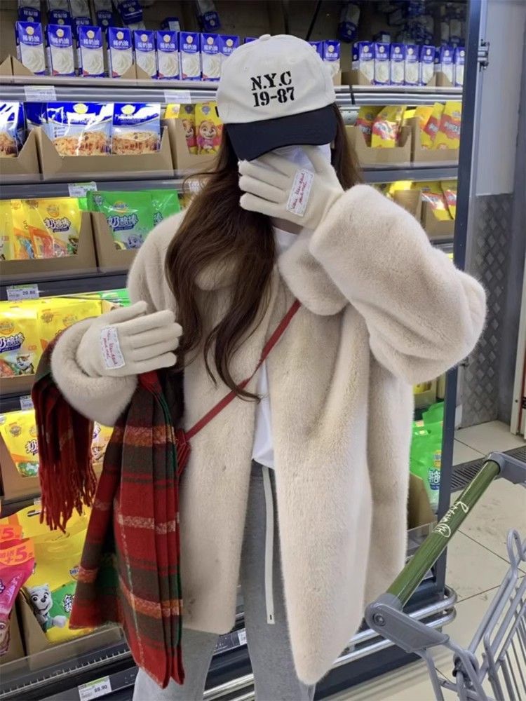 冬季小白熊仿水貂毛皮毛一体外套女中长款宽松加厚翻领毛绒大衣潮
