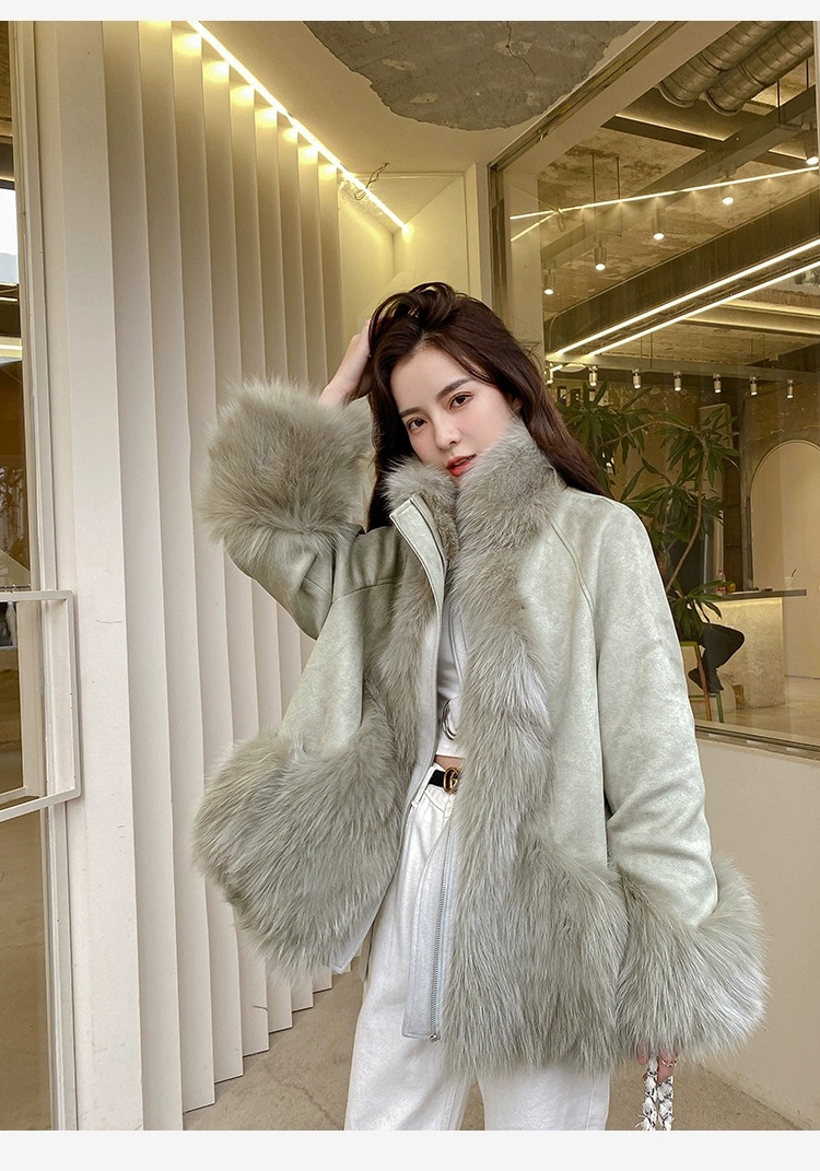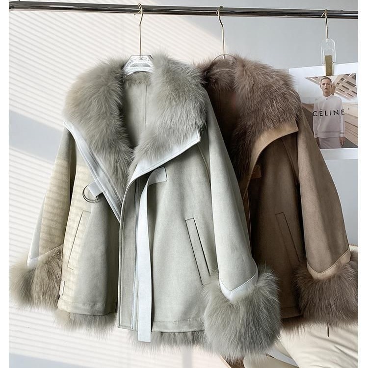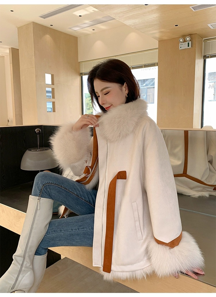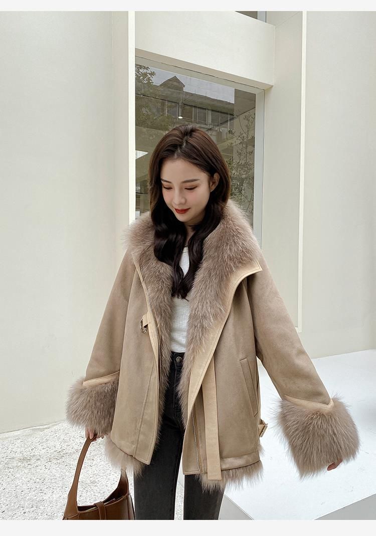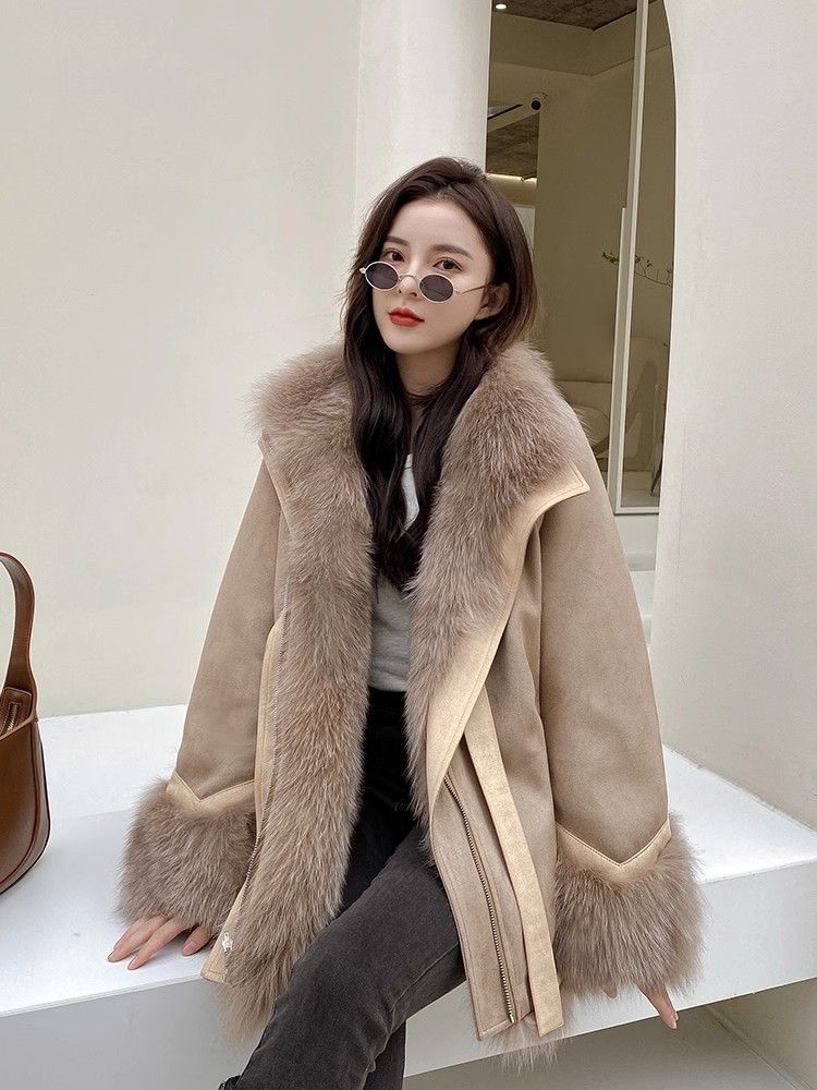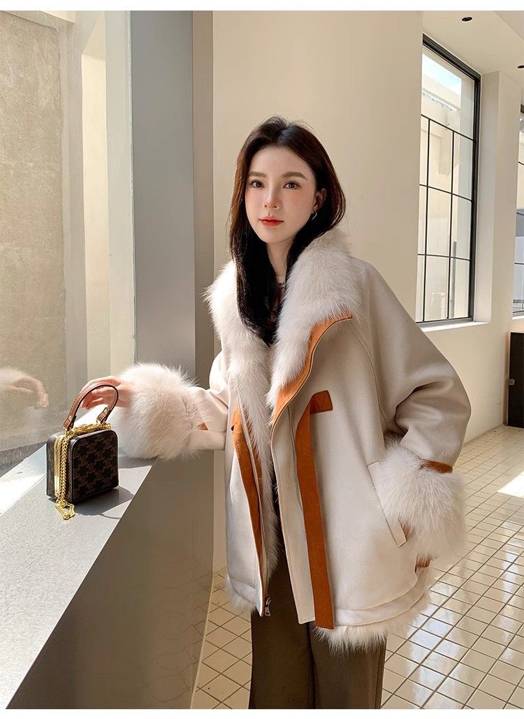 麂皮绒拼接狐狸毛皮草内胆派克服外套女中长款2023新款小个子年轻