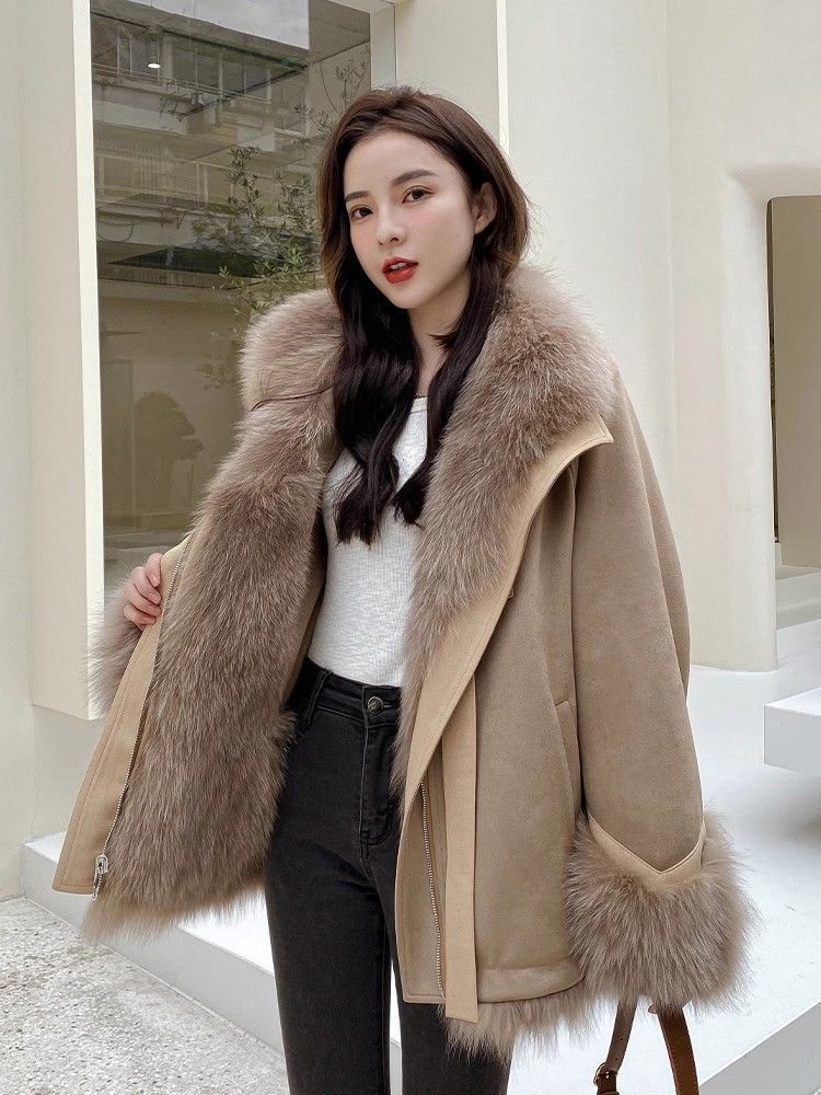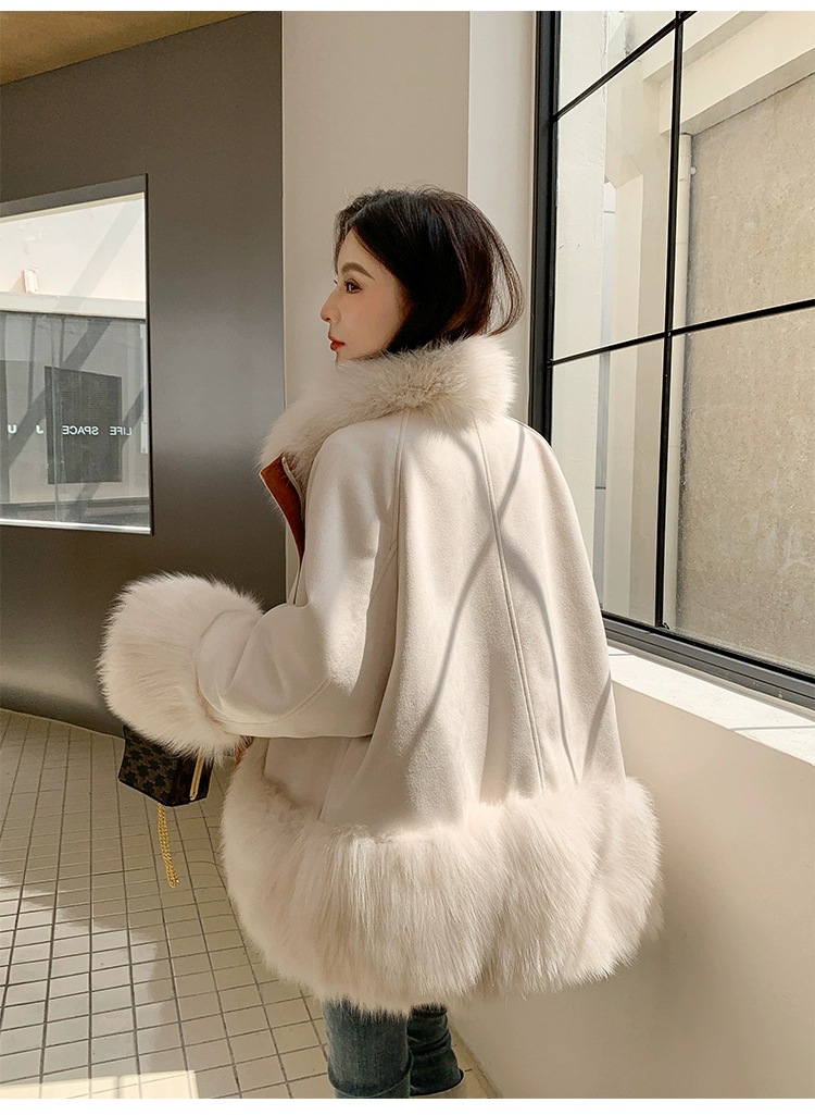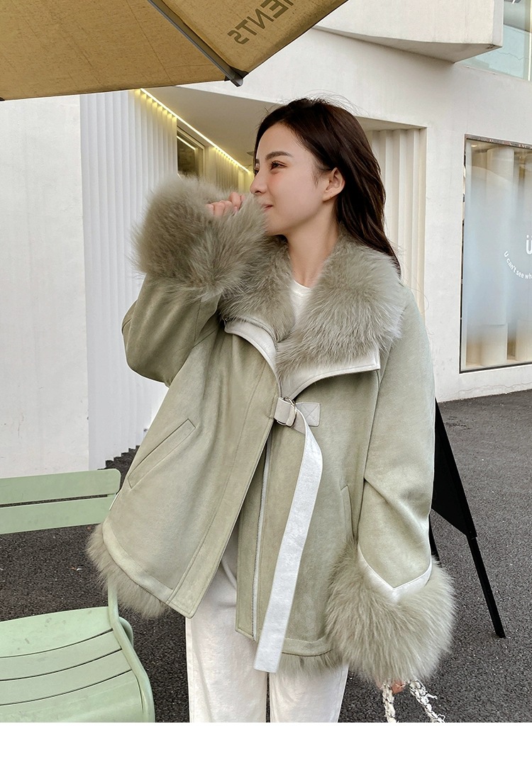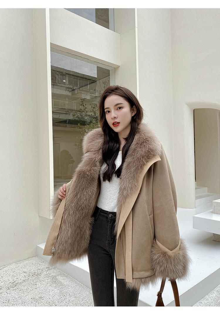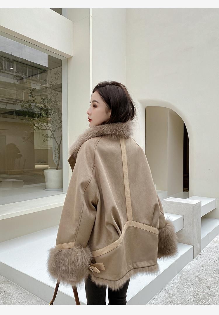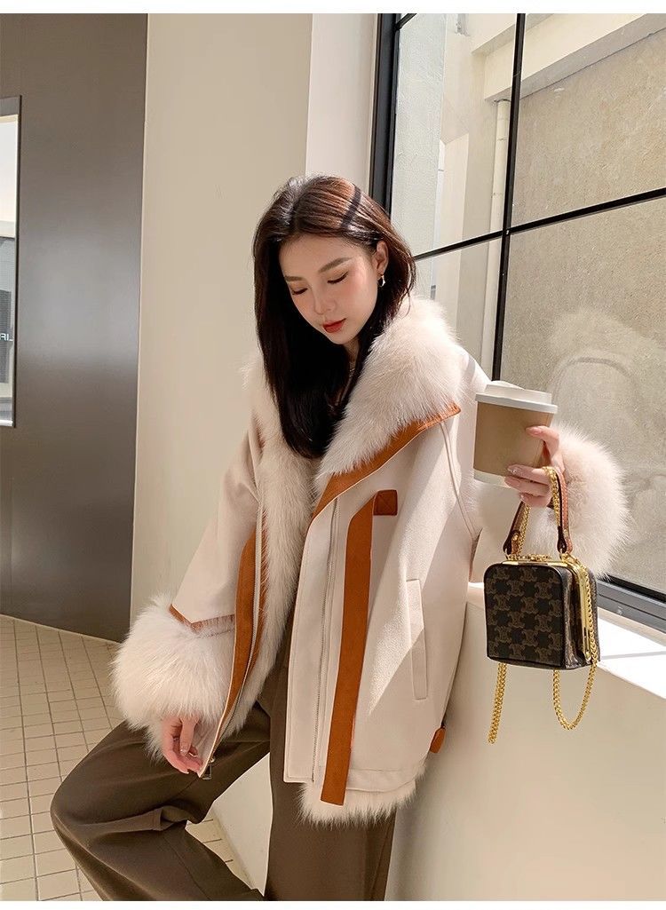 麂皮绒拼接狐狸毛皮草内胆派克服外套女中长款2023新款小个子年轻