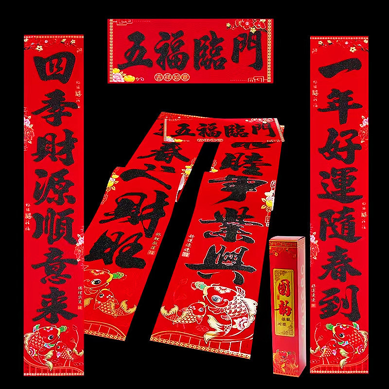 2024龙年高档铜版纸对联植绒撒金春联春节福字灯笼中国结挂件厂家