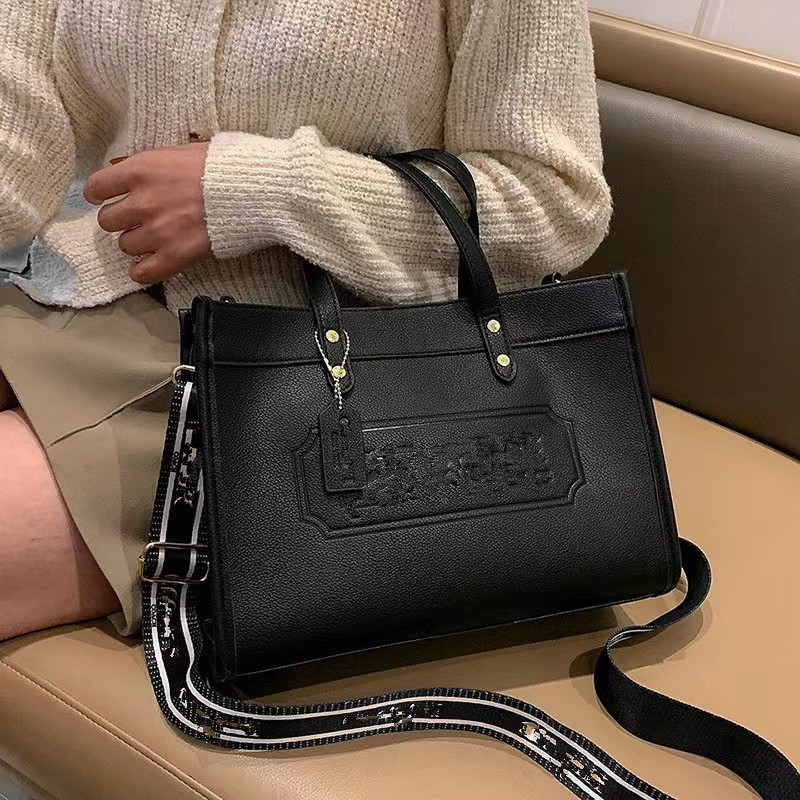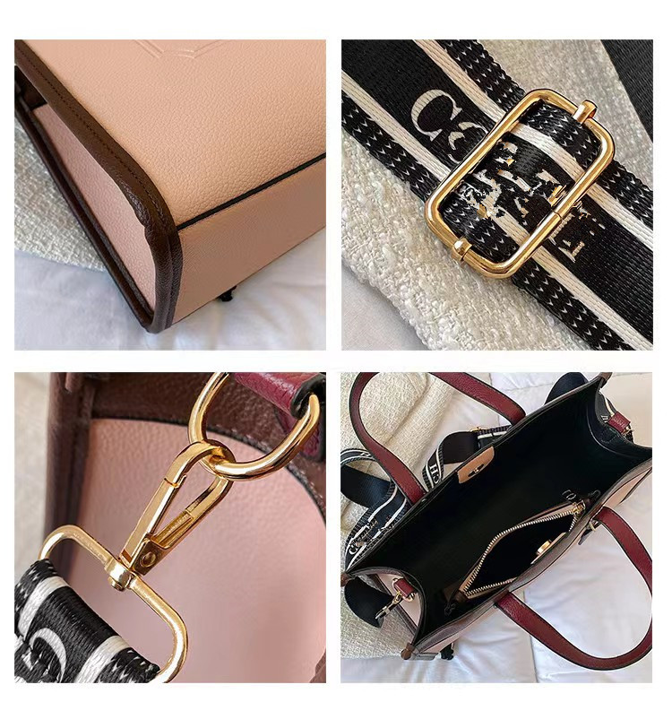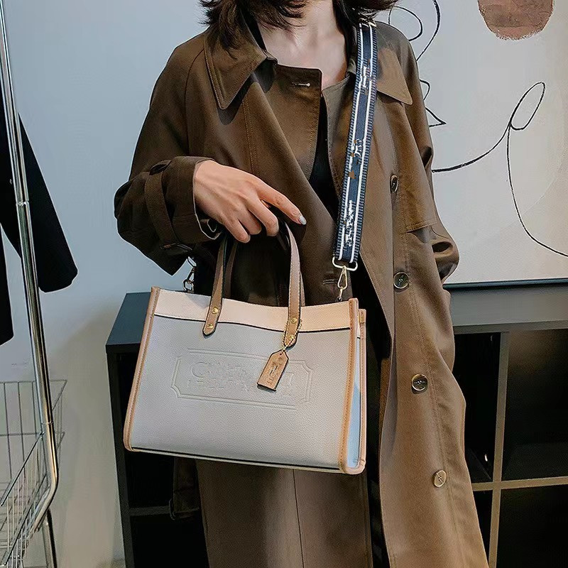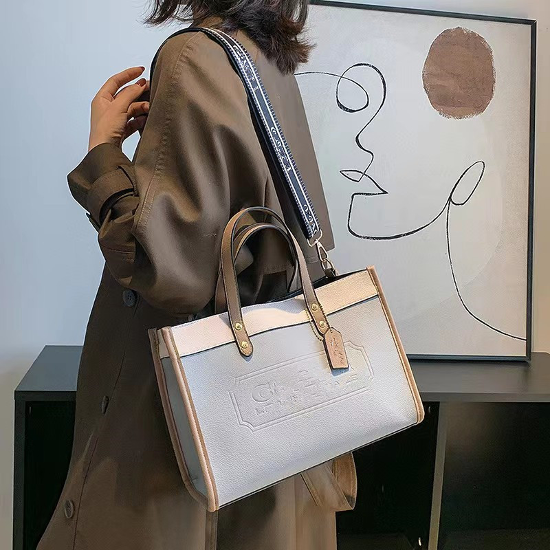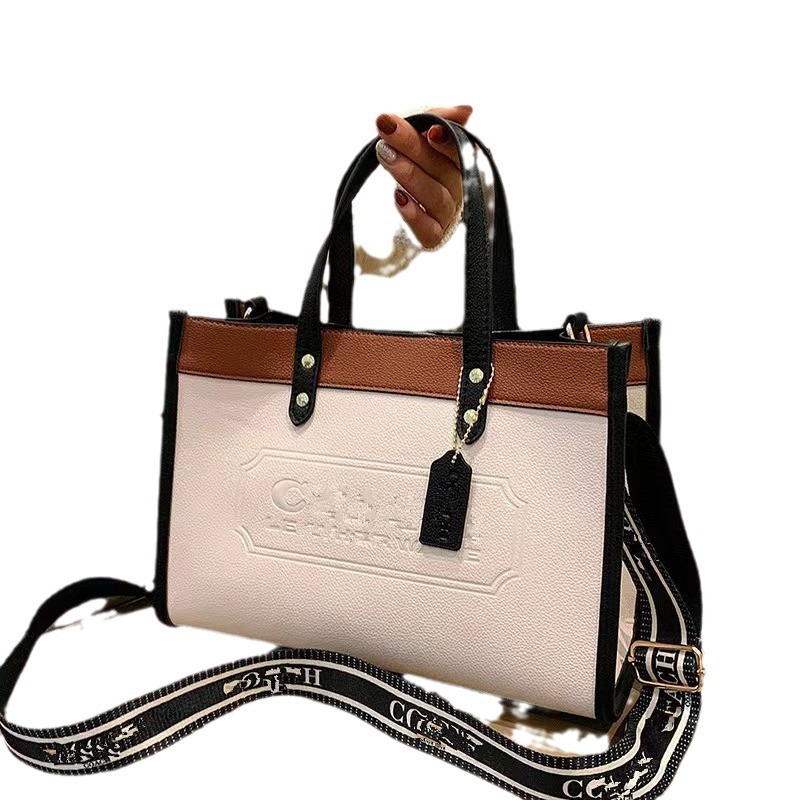 外贸蔻家拼接pu托特包logo压痕时尚单肩斜挎包欧美复古包批发