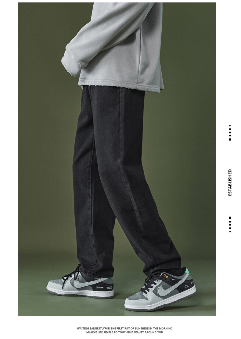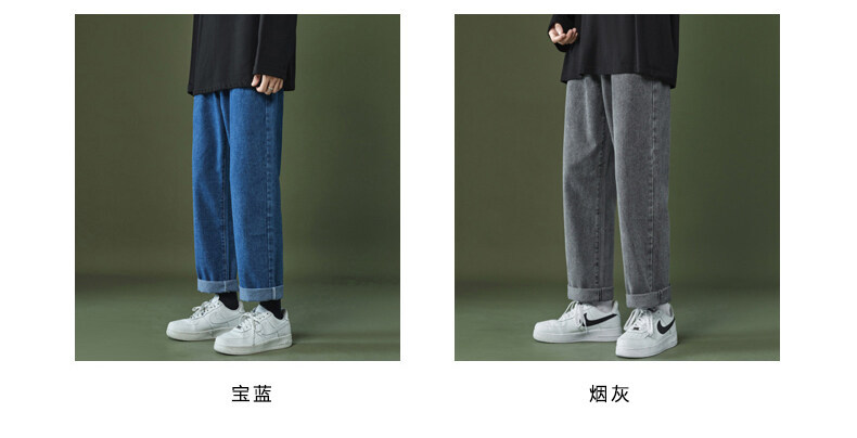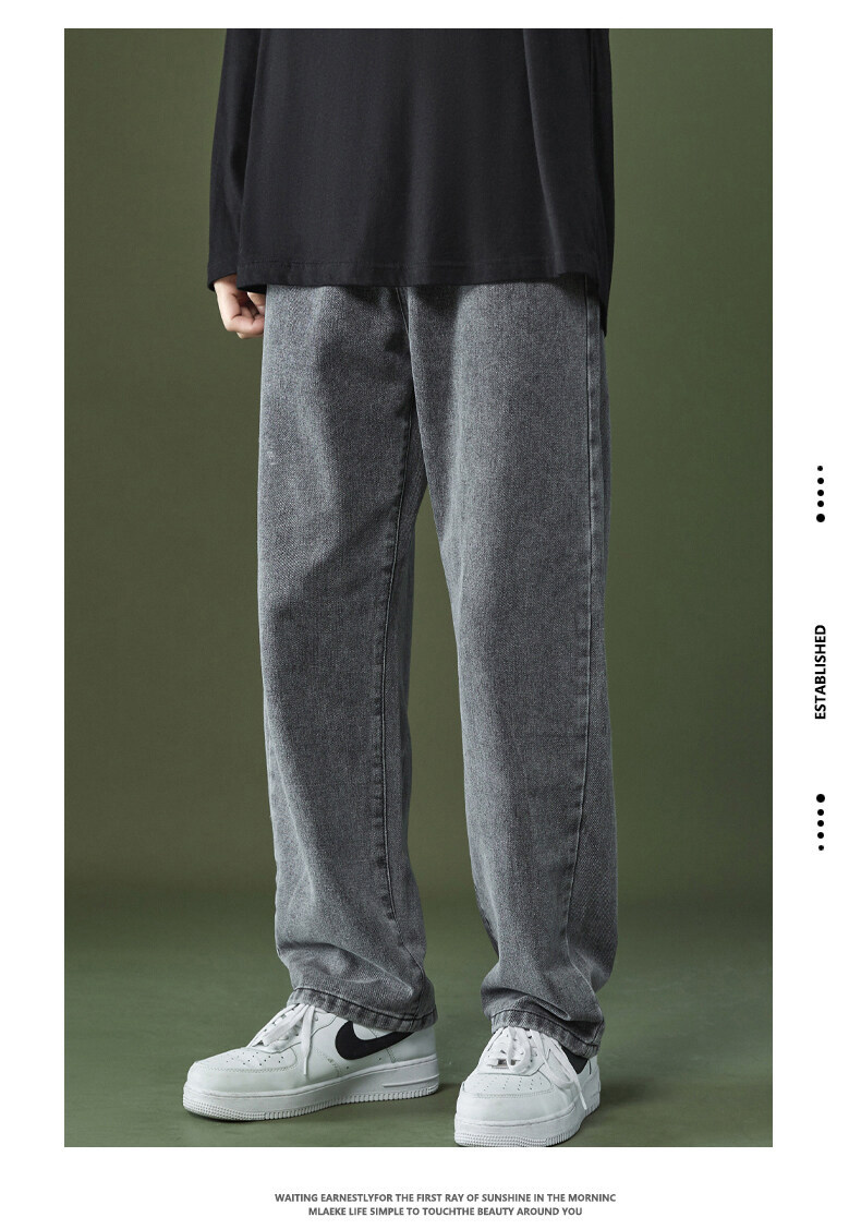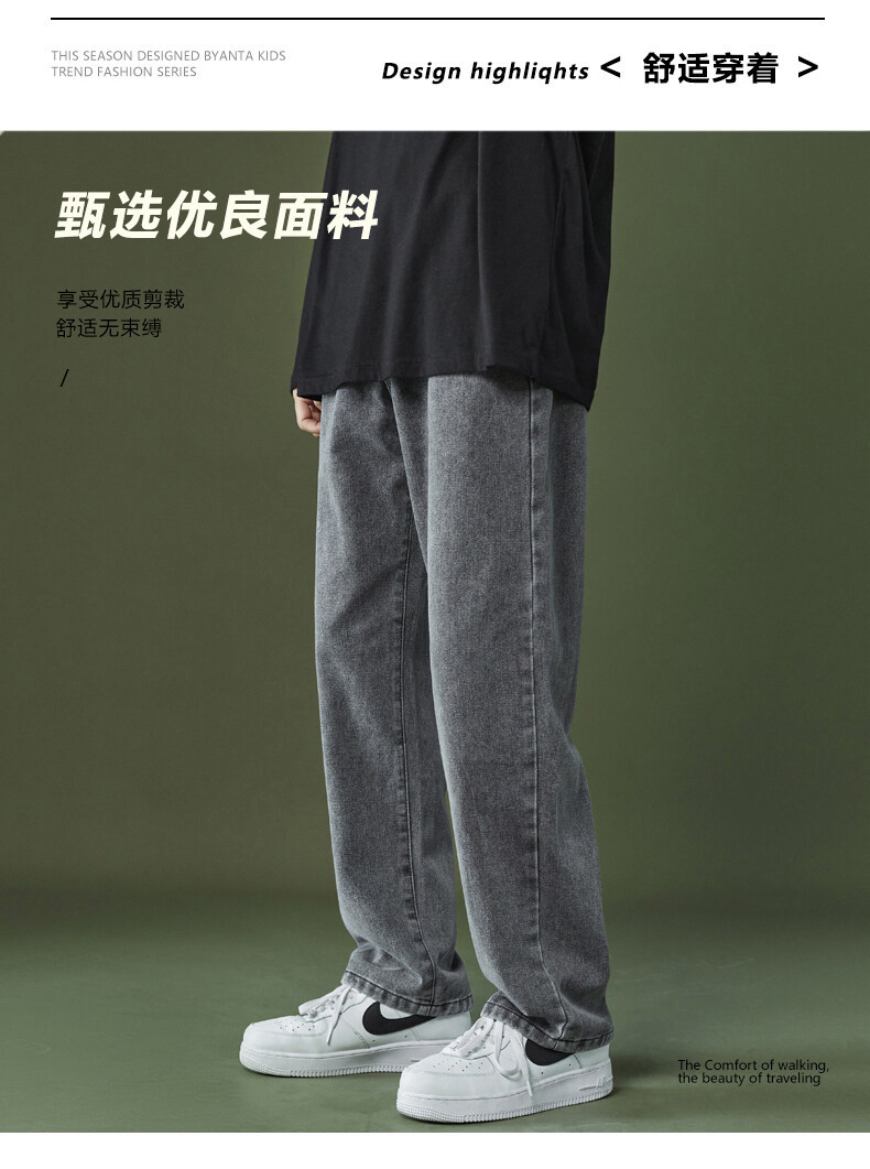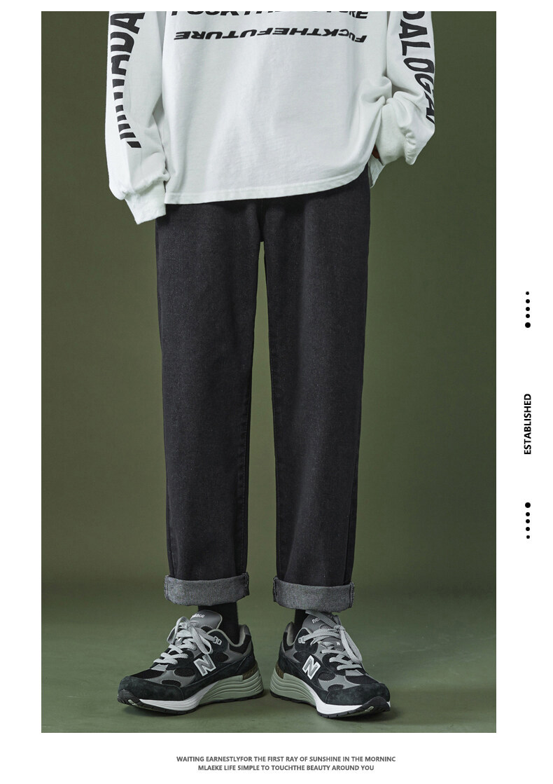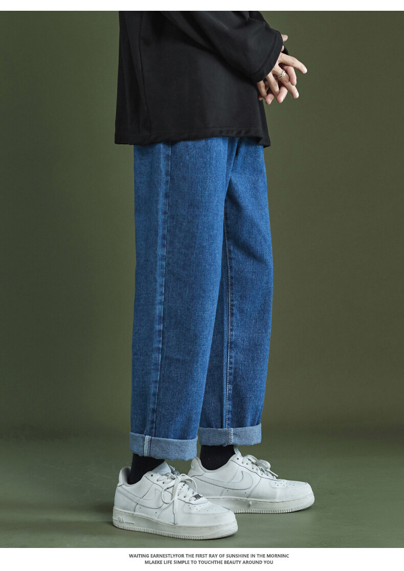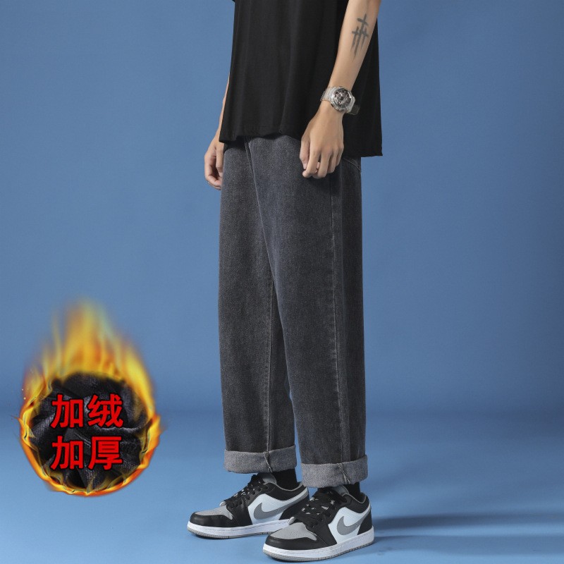 港风直筒加绒牛仔裤男士宽松休闲韩版潮流九分休闲阔腿长裤子男