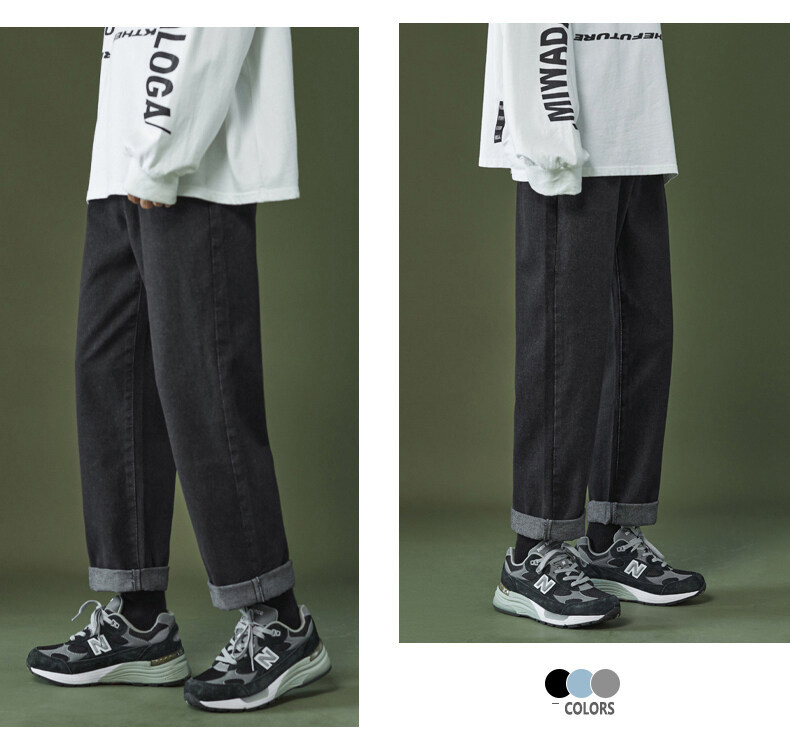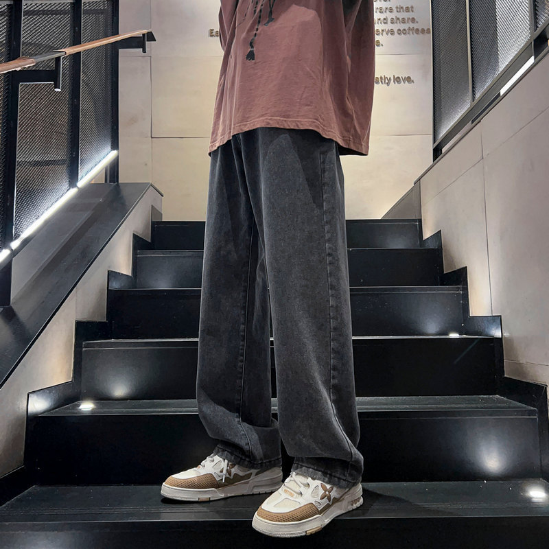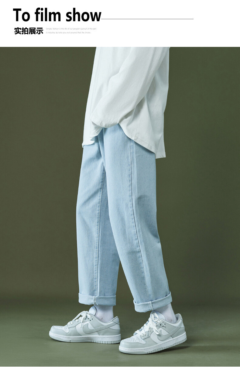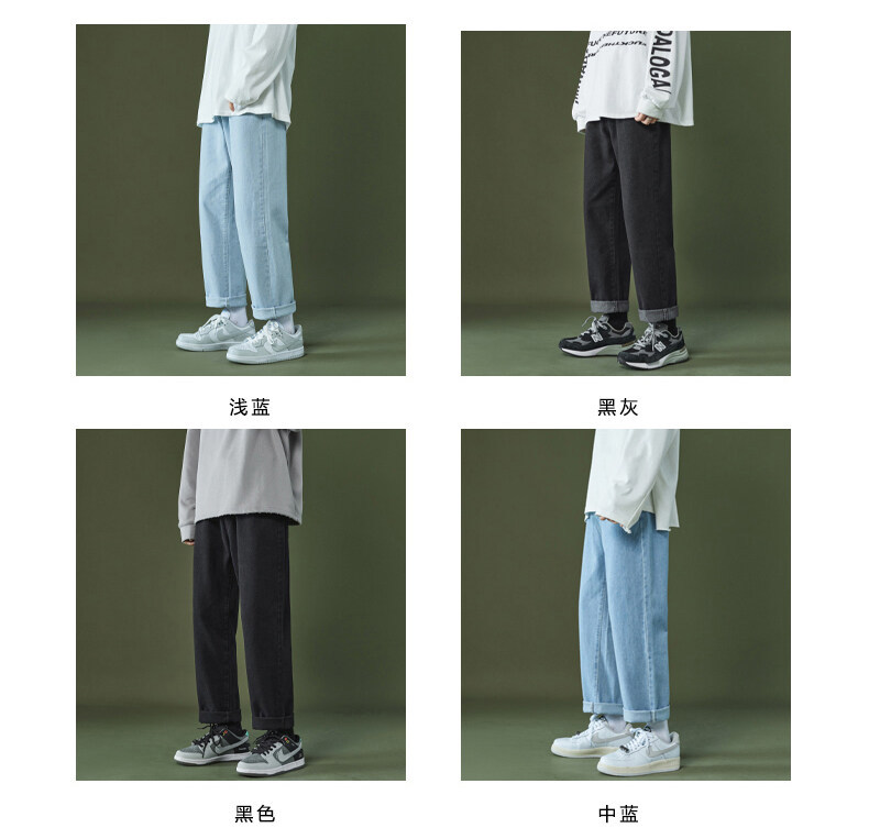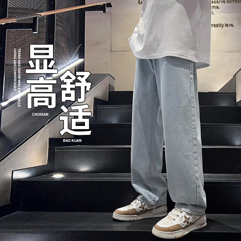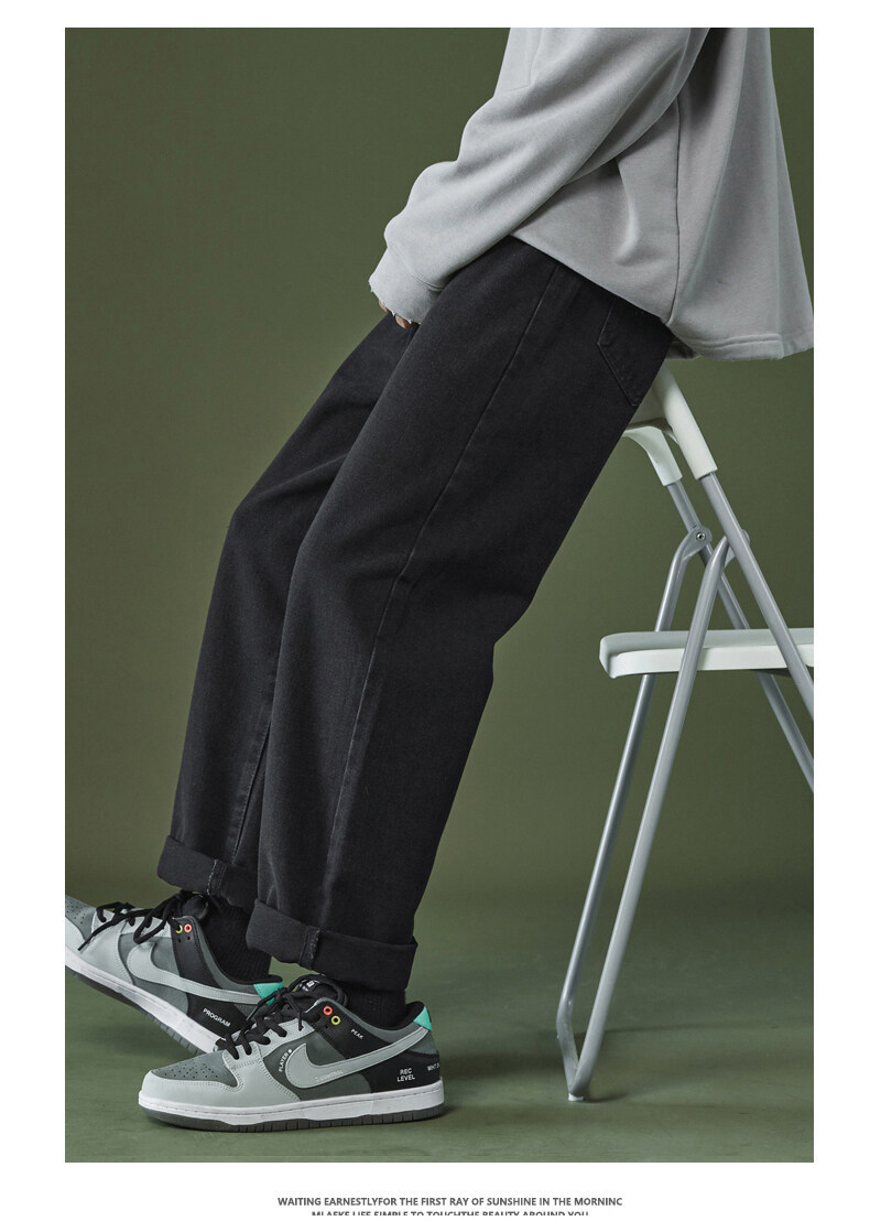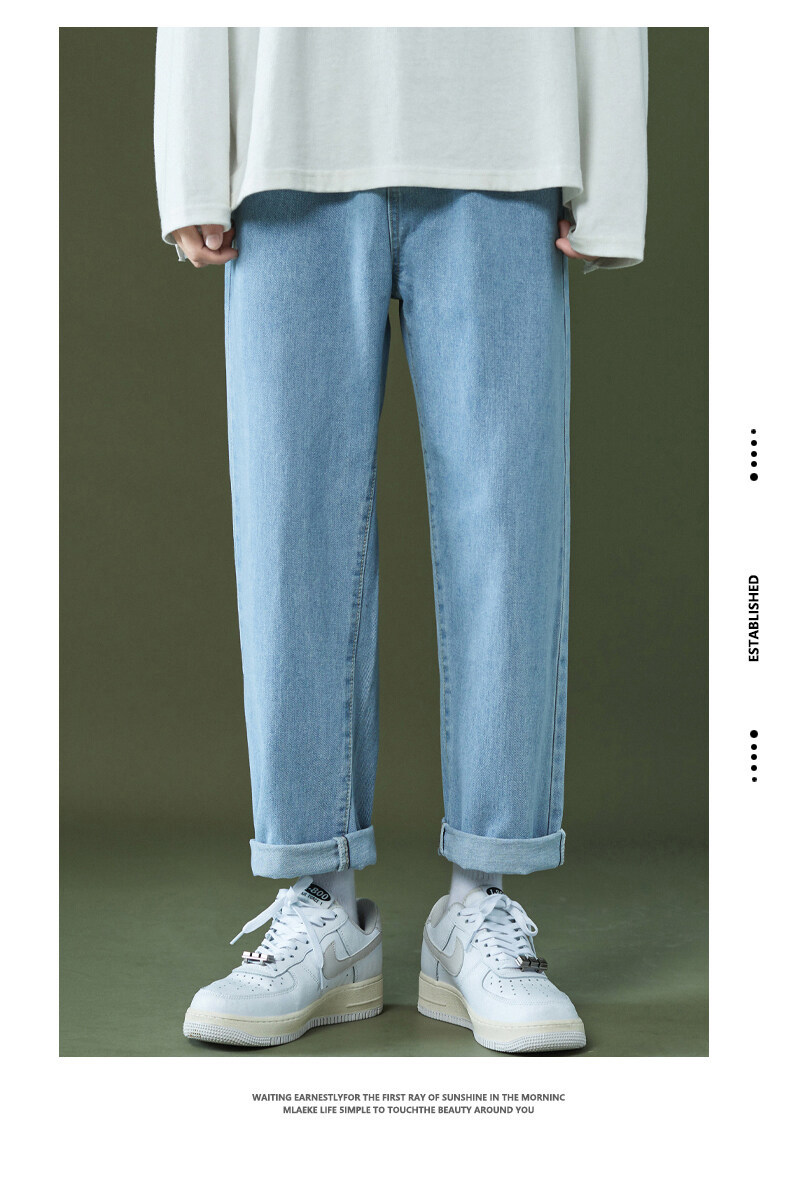 港风直筒加绒牛仔裤男士宽松休闲韩版潮流九分休闲阔腿长裤子男