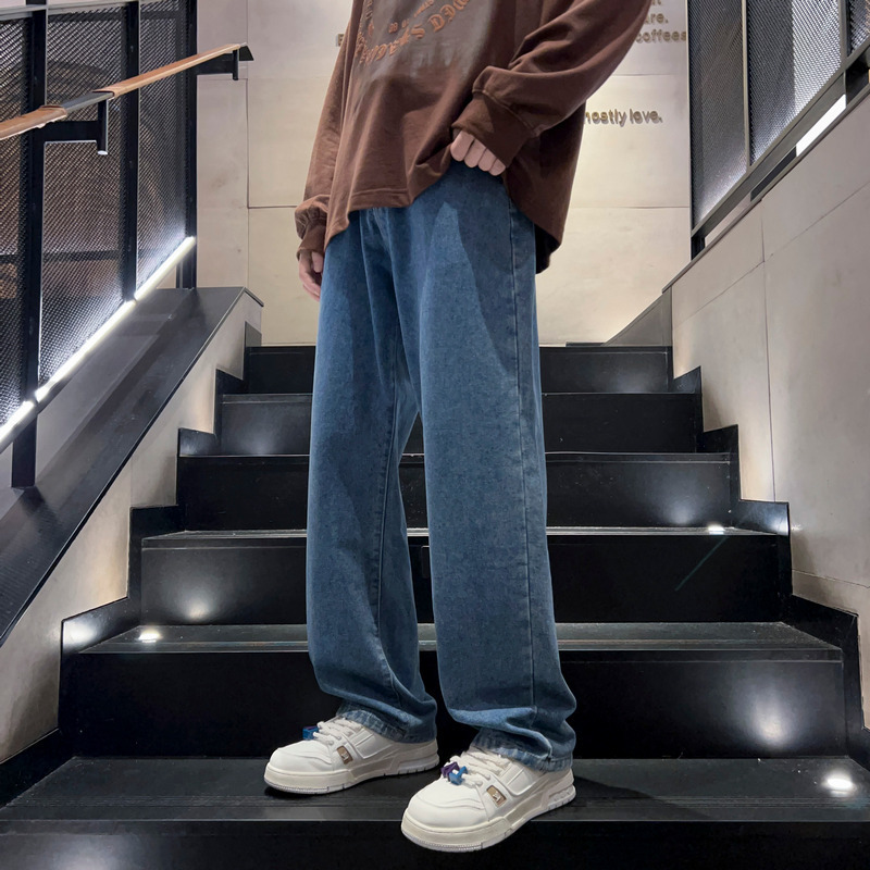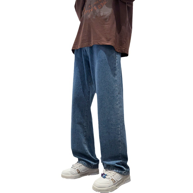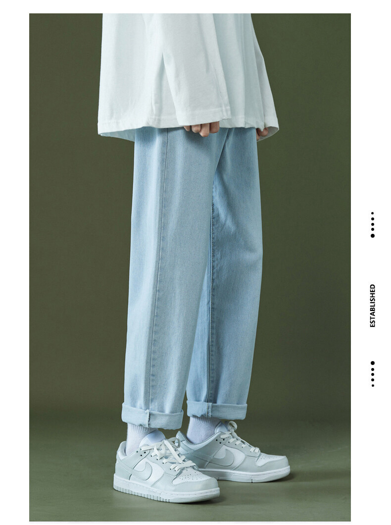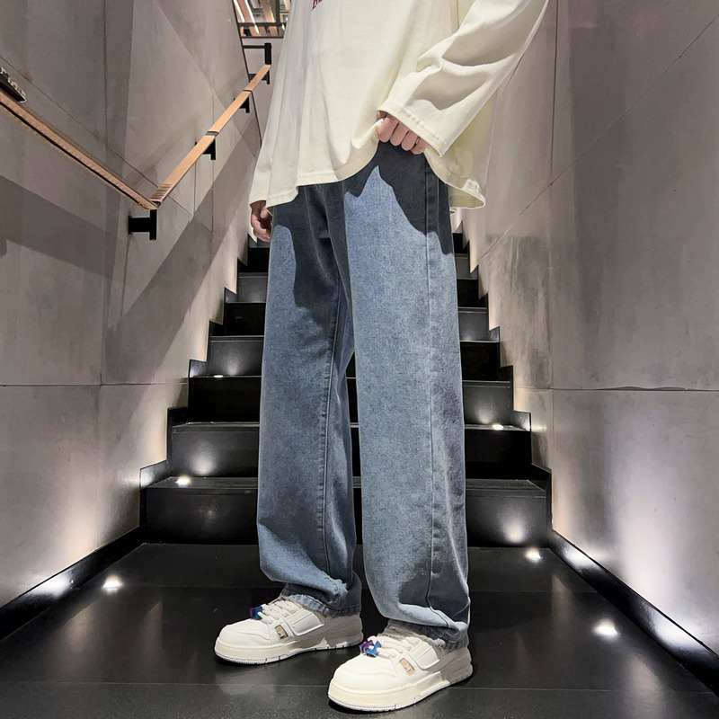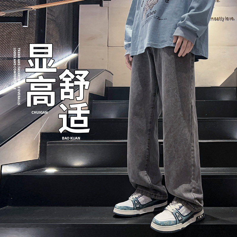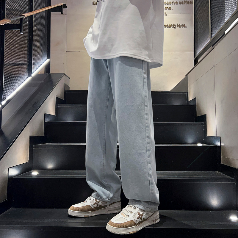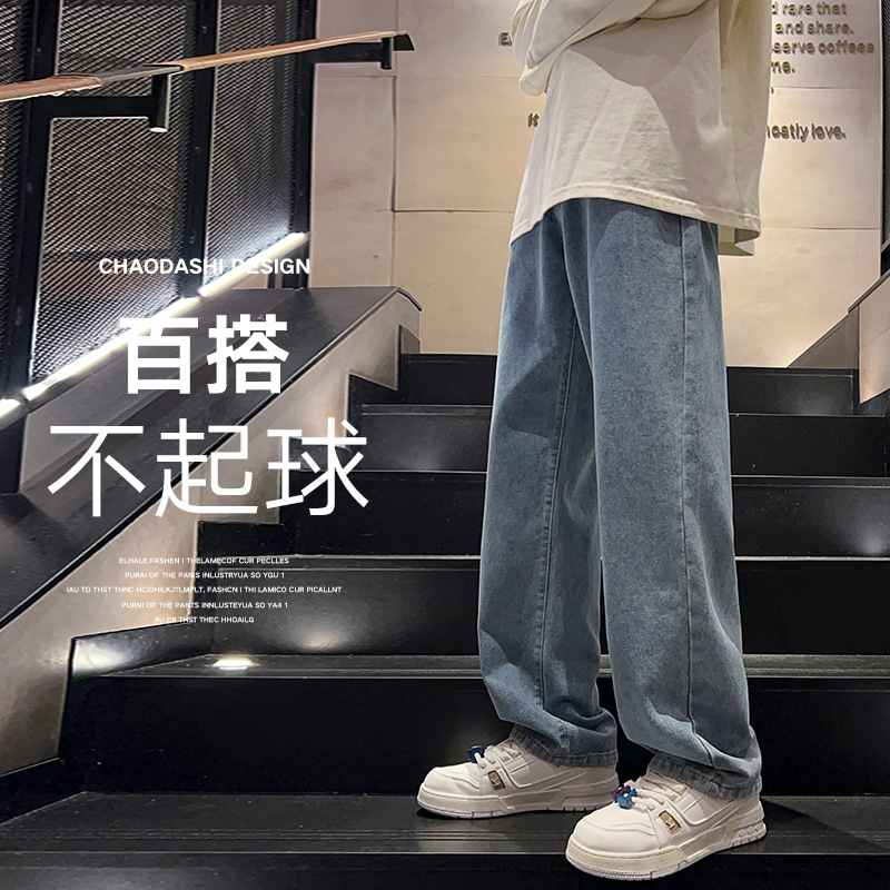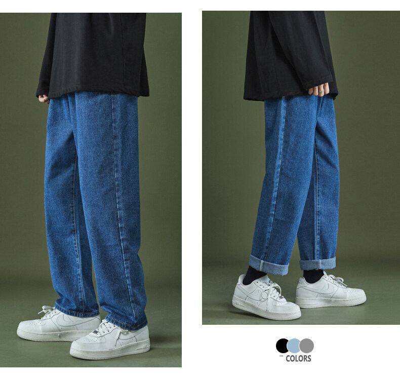 港风直筒加绒牛仔裤男士宽松休闲韩版潮流九分休闲阔腿长裤子男