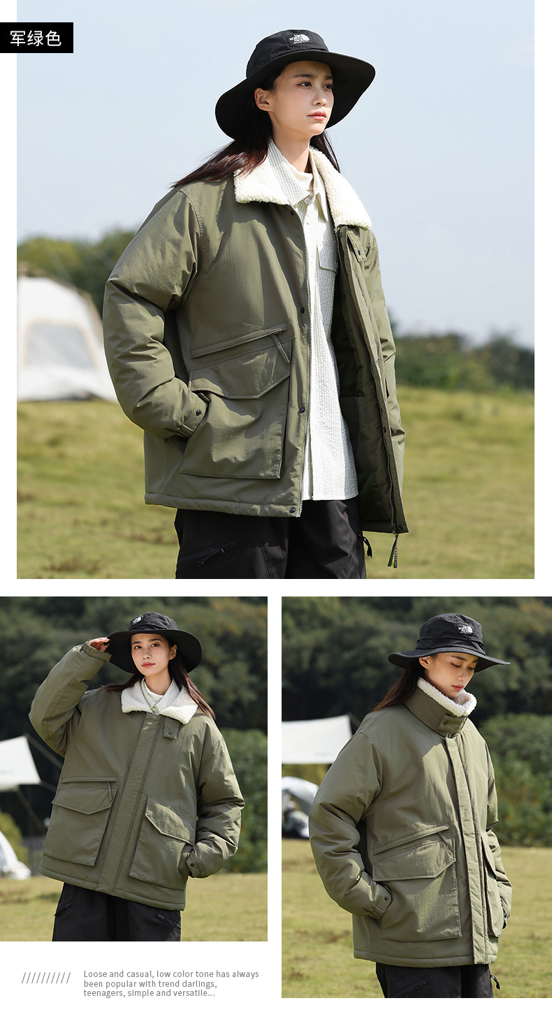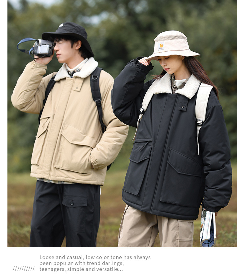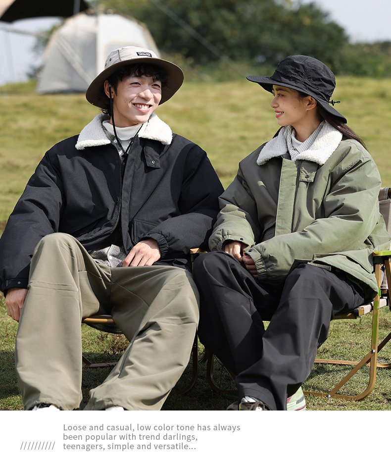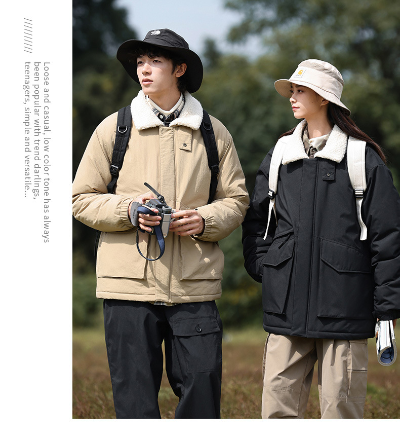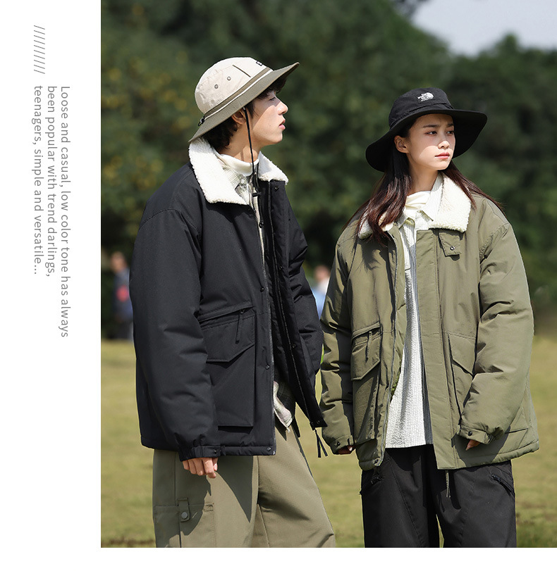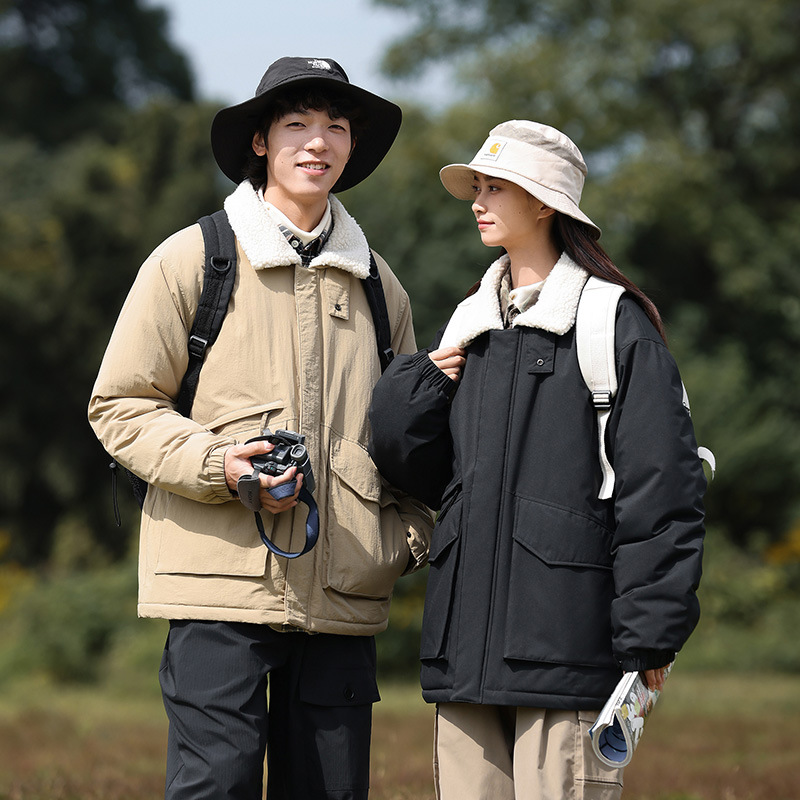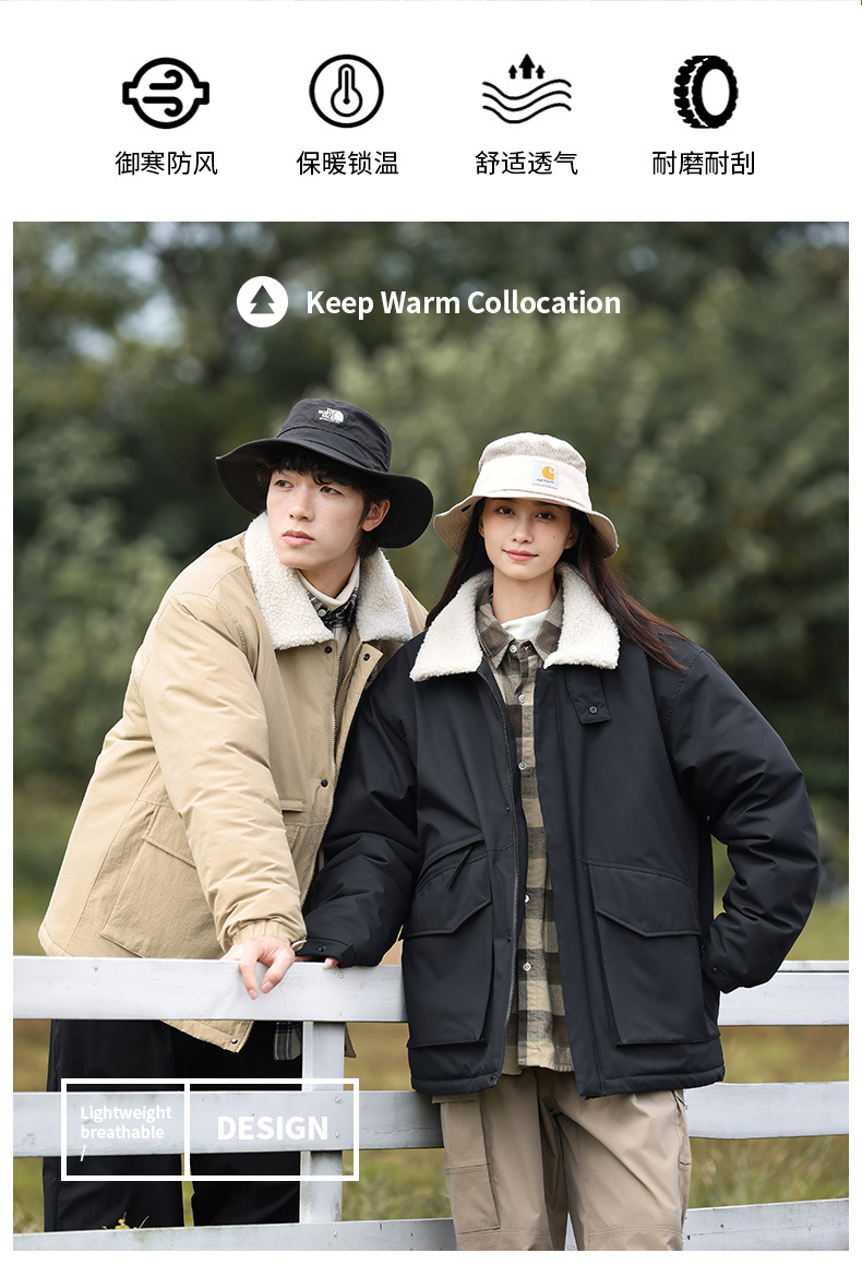 冬季棉衣男女情侣爆款潮牌纯色可二开印花翻领羊羔绒工装休闲棉服