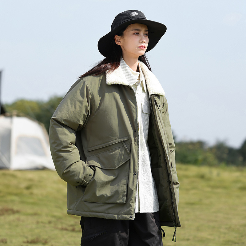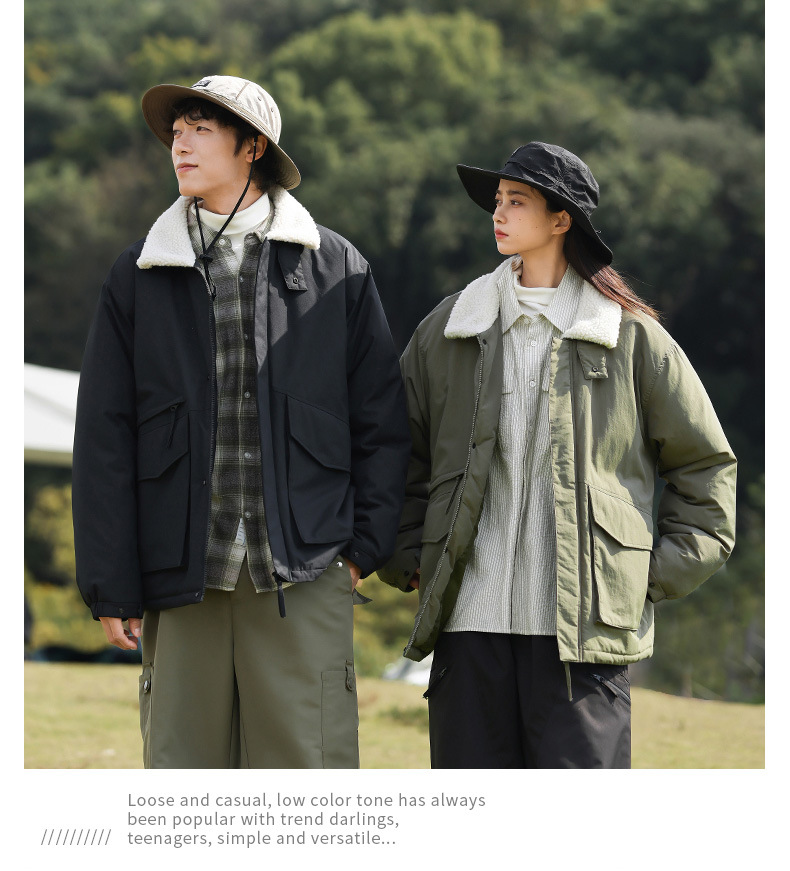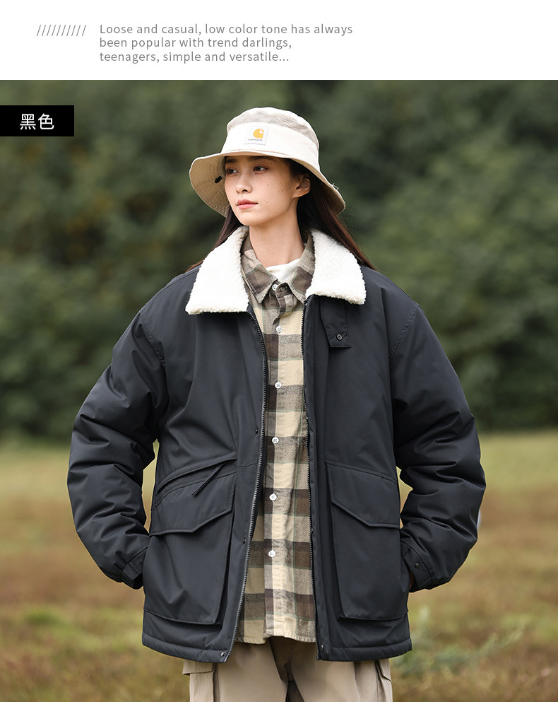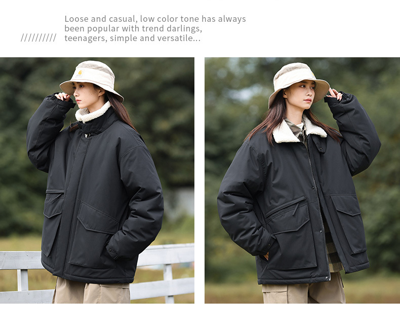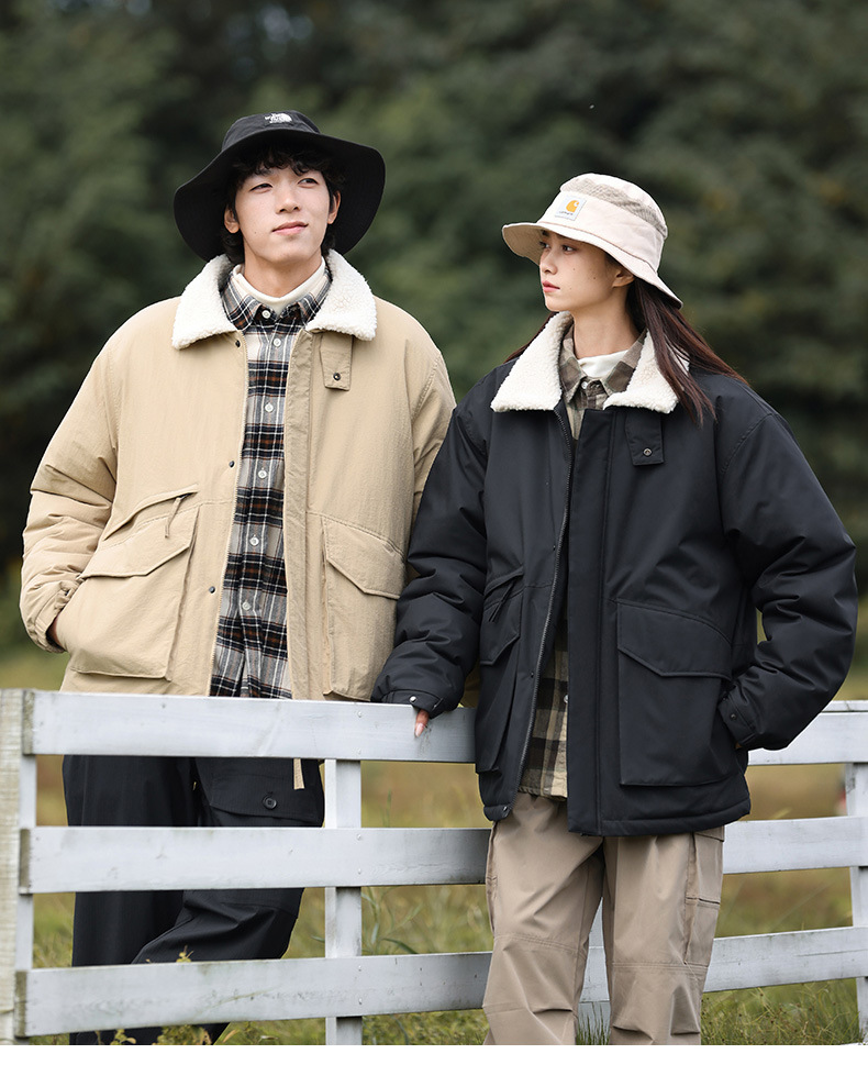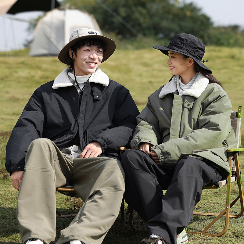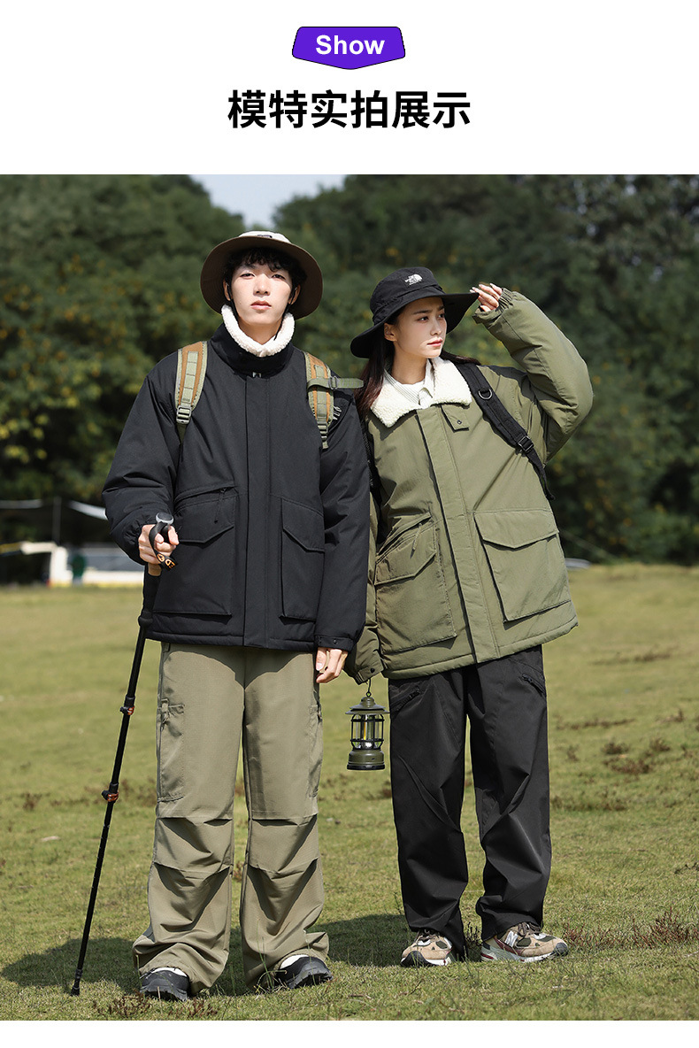 冬季棉衣男女情侣爆款潮牌纯色可二开印花翻领羊羔绒工装休闲棉服