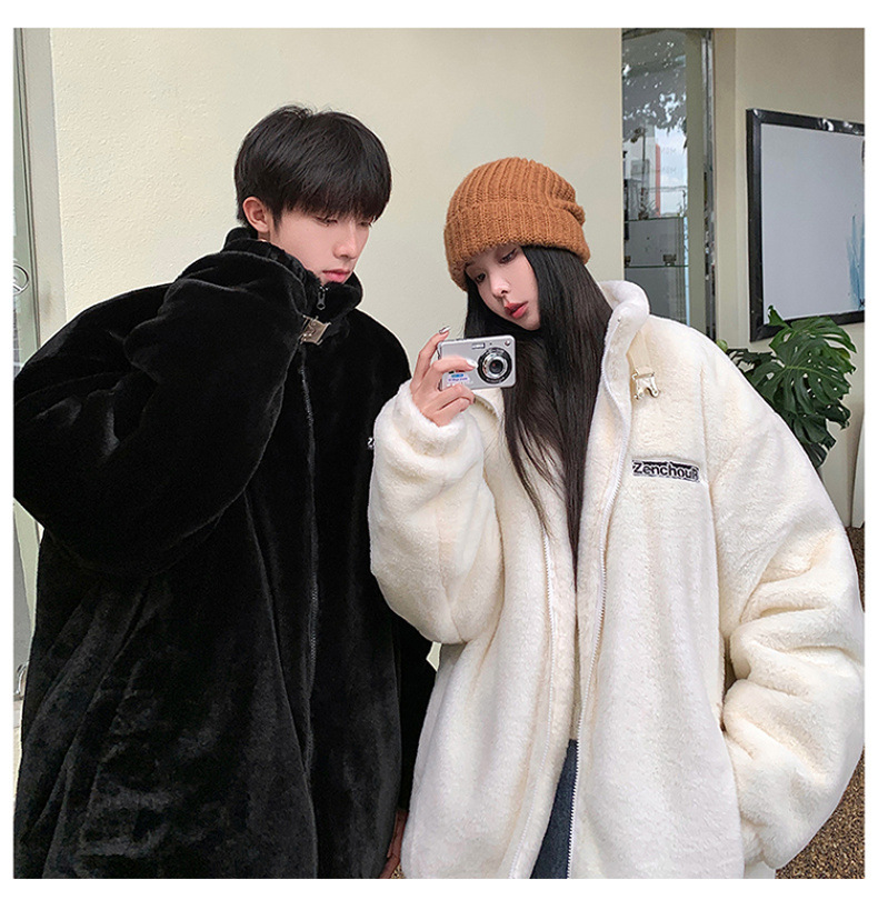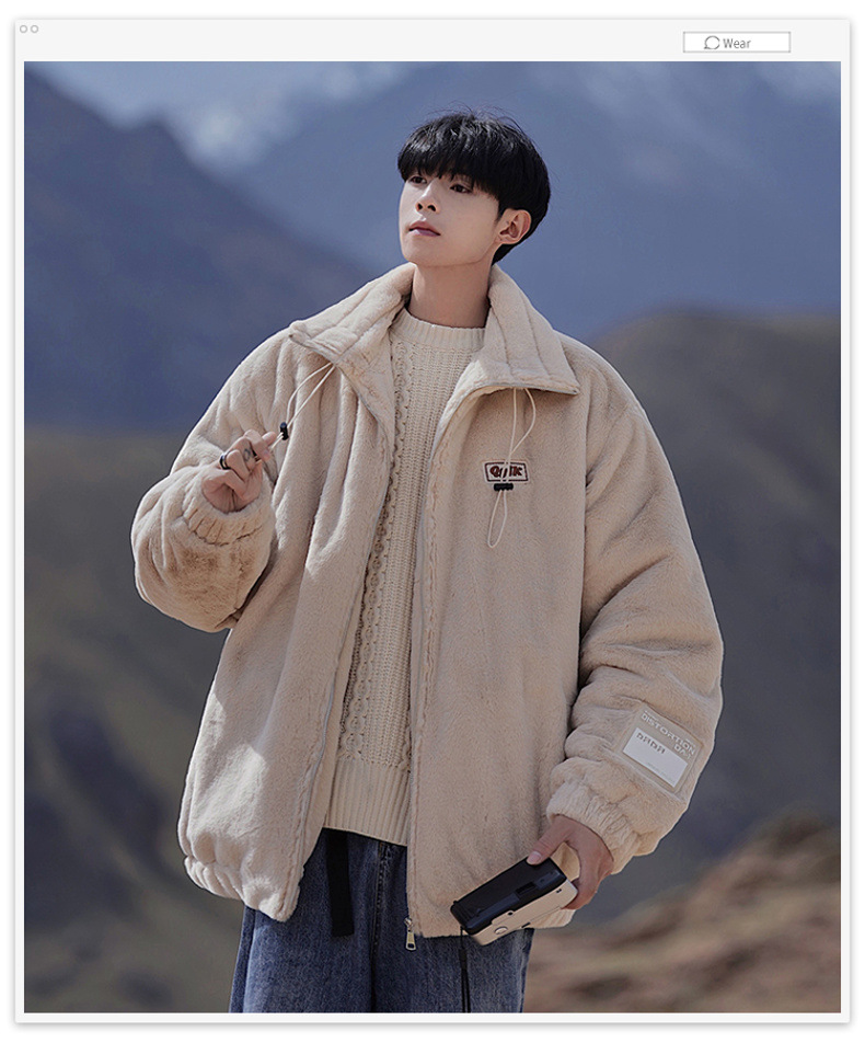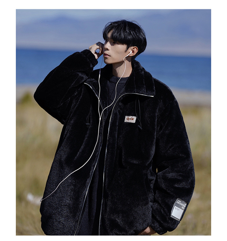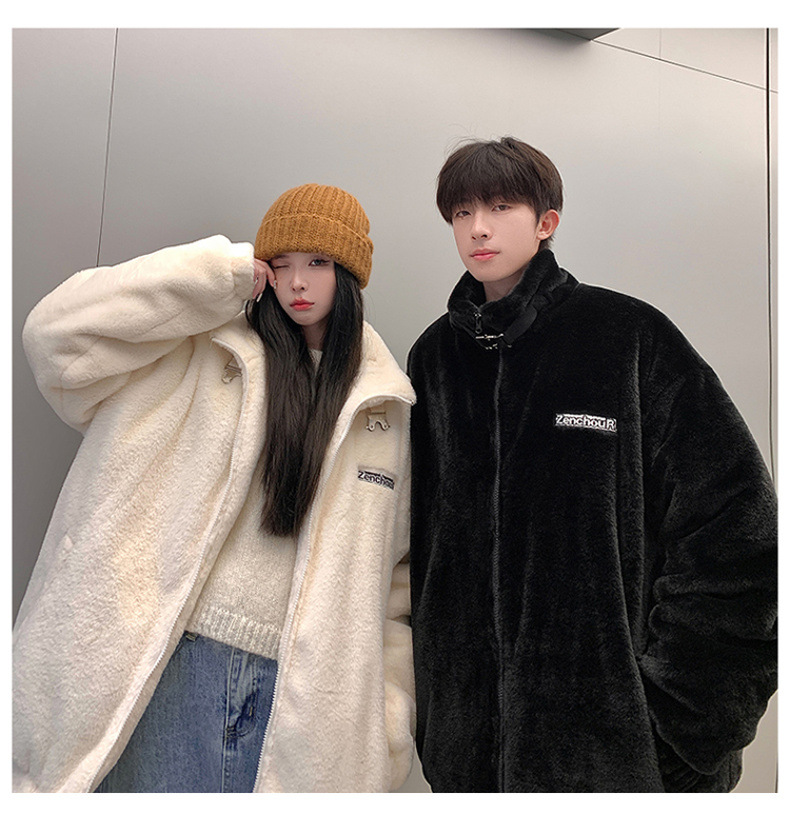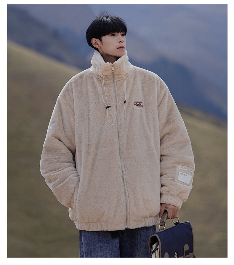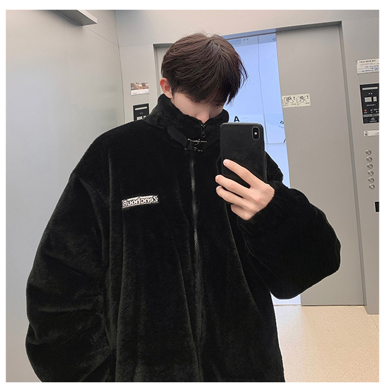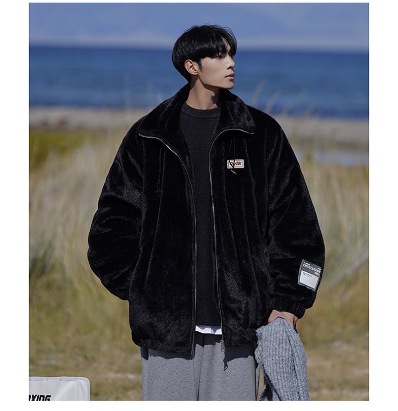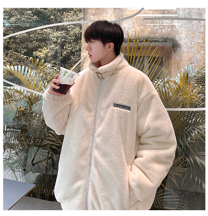 仿兔毛绒抓绒外套男2023冬季新款摇粒绒宽松休闲卫衣刺绣纯色棉服