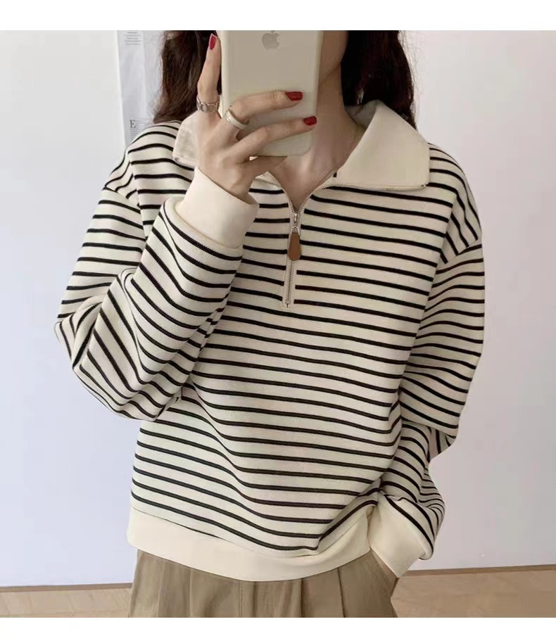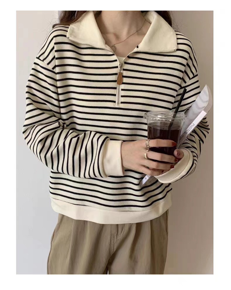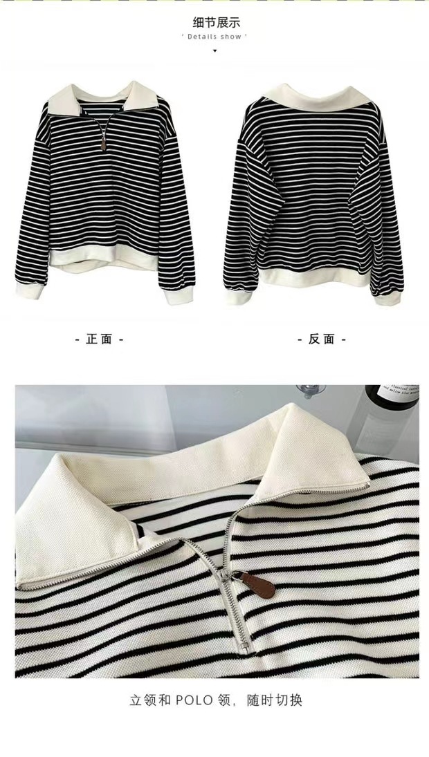 2023秋冬小个子拉链polo领复古卫衣女条纹短款上衣加绒加厚外套