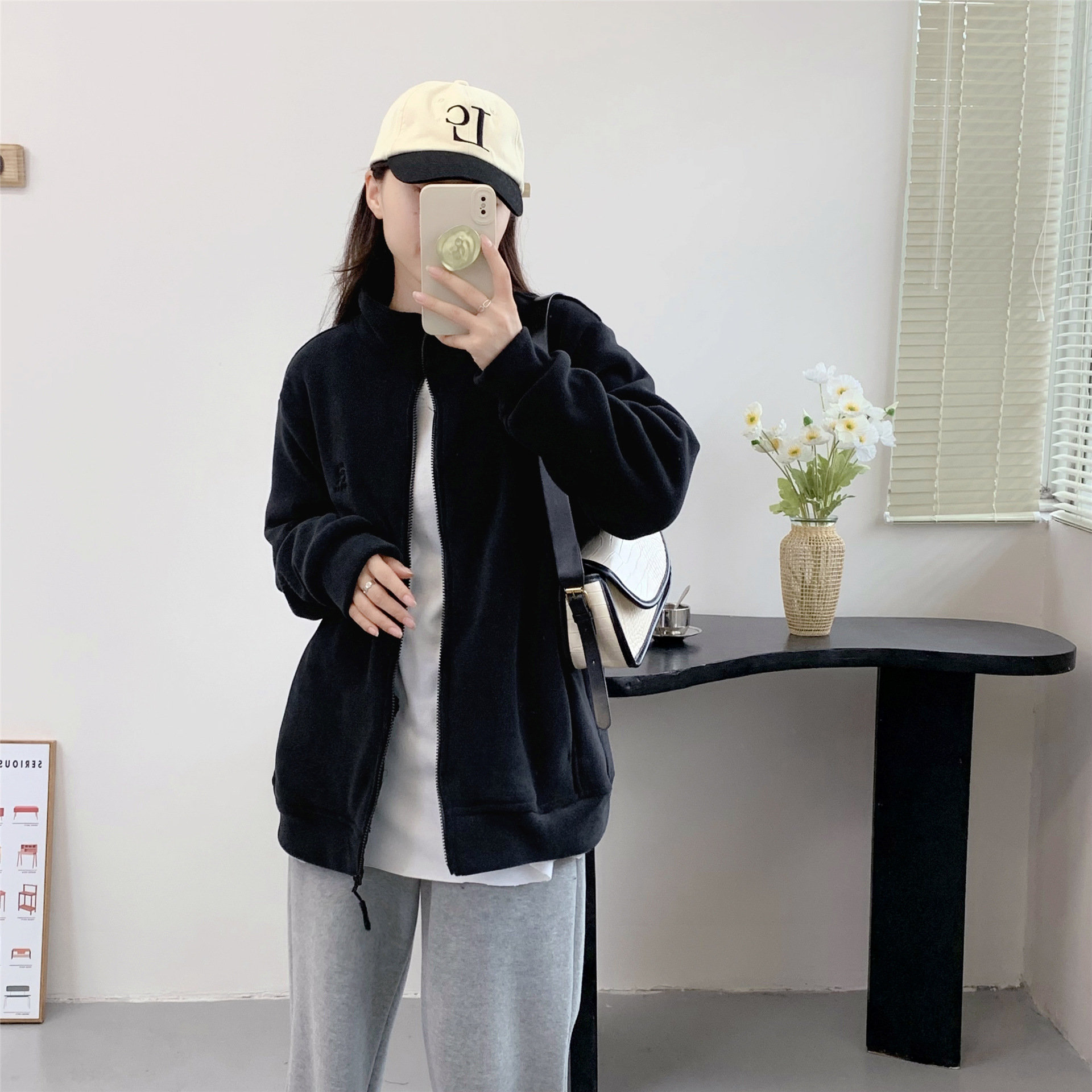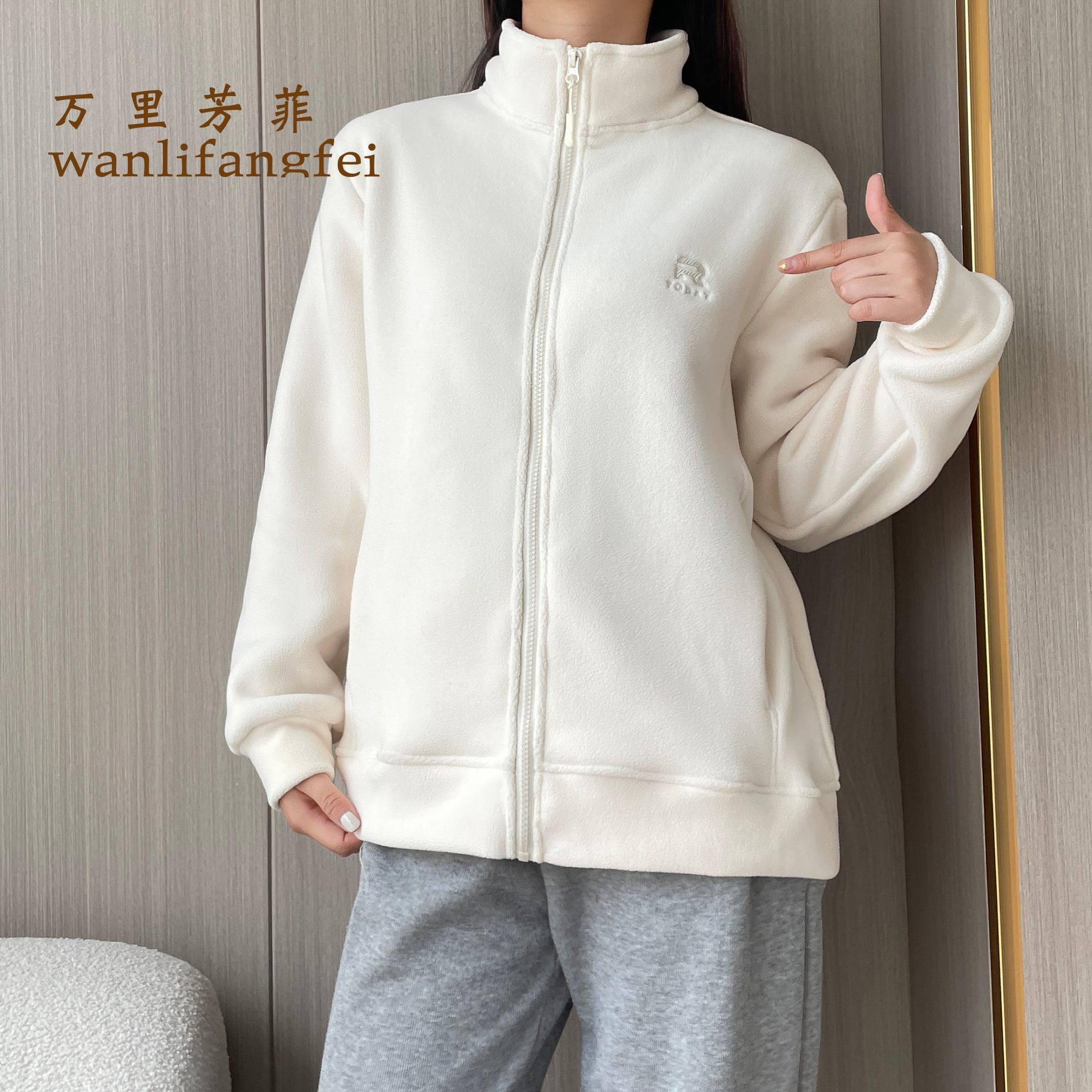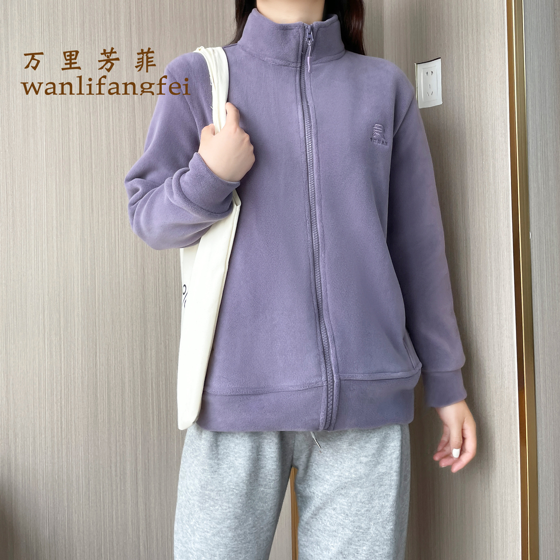 秋冬女装加厚卫衣奥利绒纯色绣花立领外穿拉链开衫男女同款外套