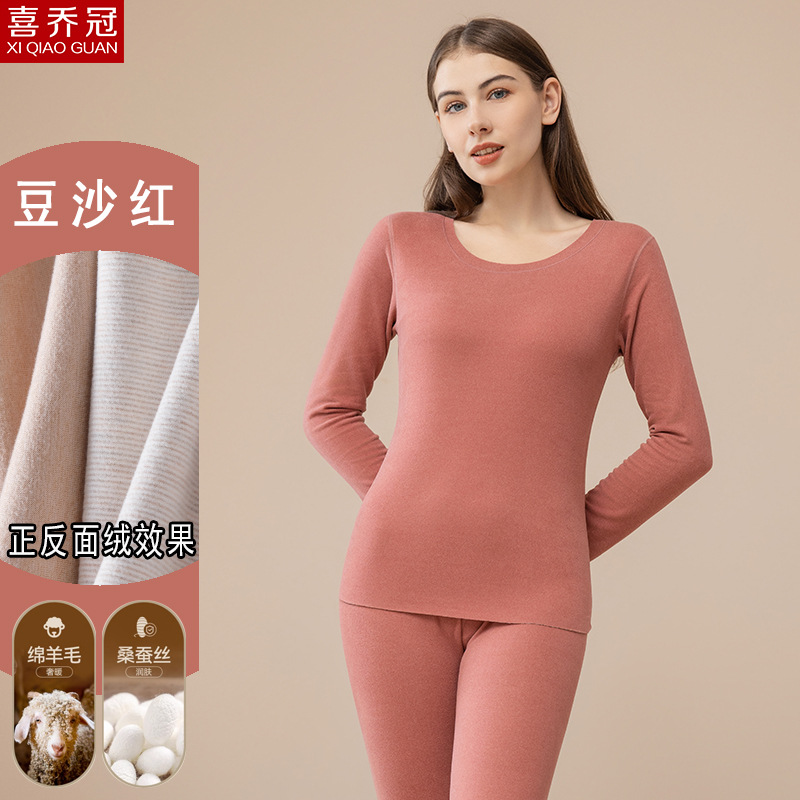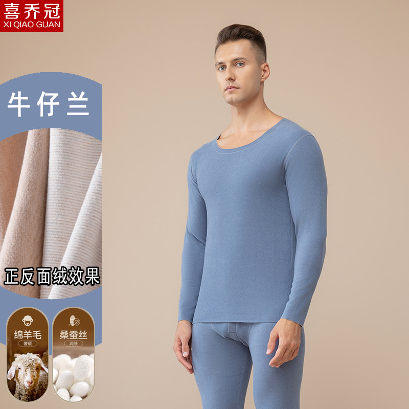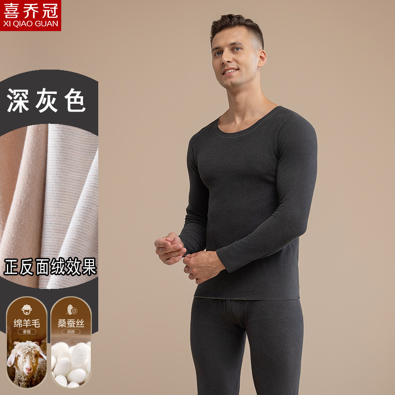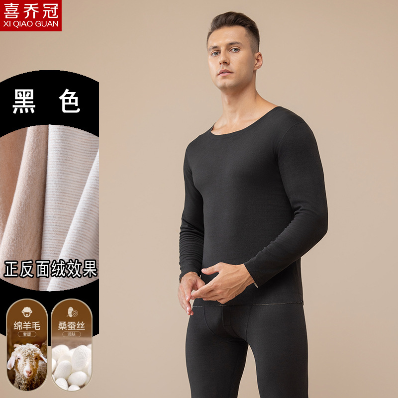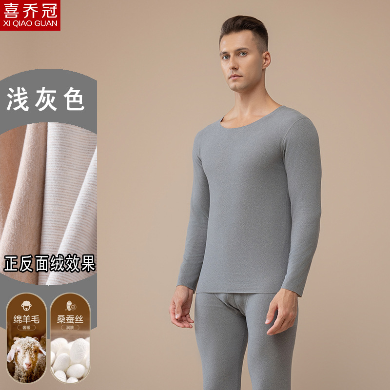 新款羊毛桑蚕丝男士保暖内衣套装无痕圆领双面绒女秋衣秋裤打底衫
