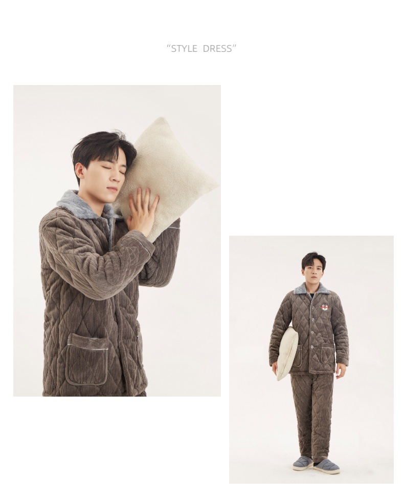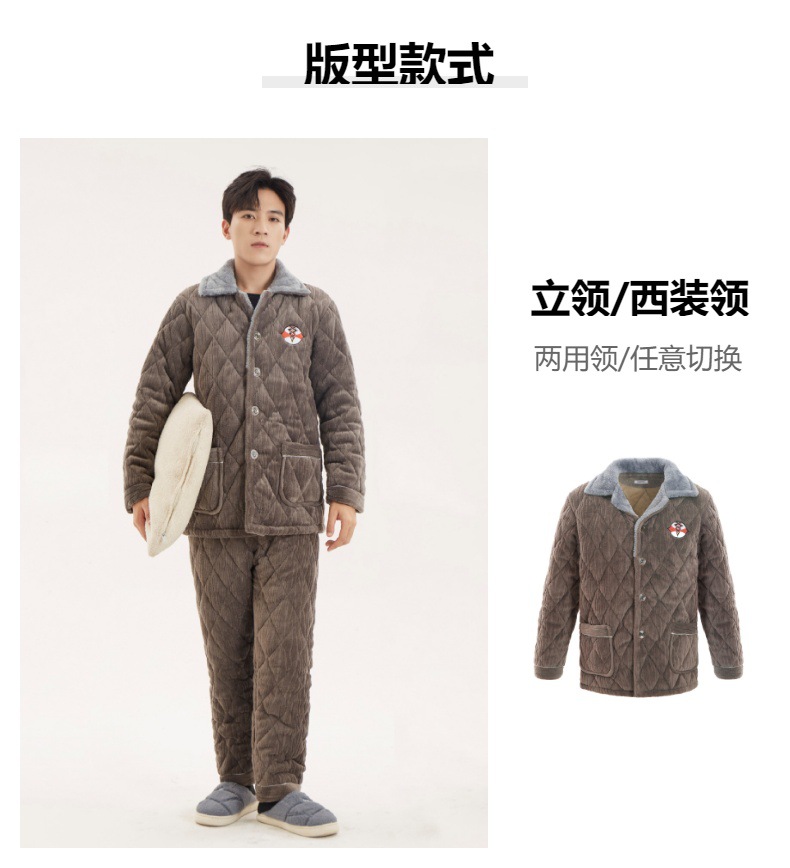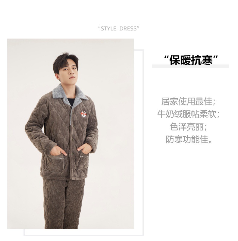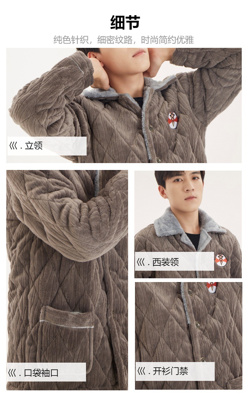 冬季男士新款加厚牛奶绒烂花三层夹棉保暖睡衣开衫两件套装可外穿