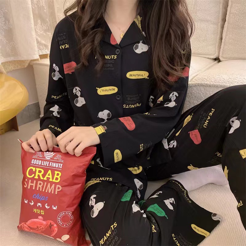 直播跨境外贸春秋翻领开扣长袖睡衣女开衫长裤时尚卡通家居服套装