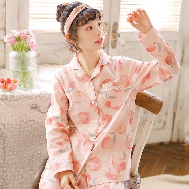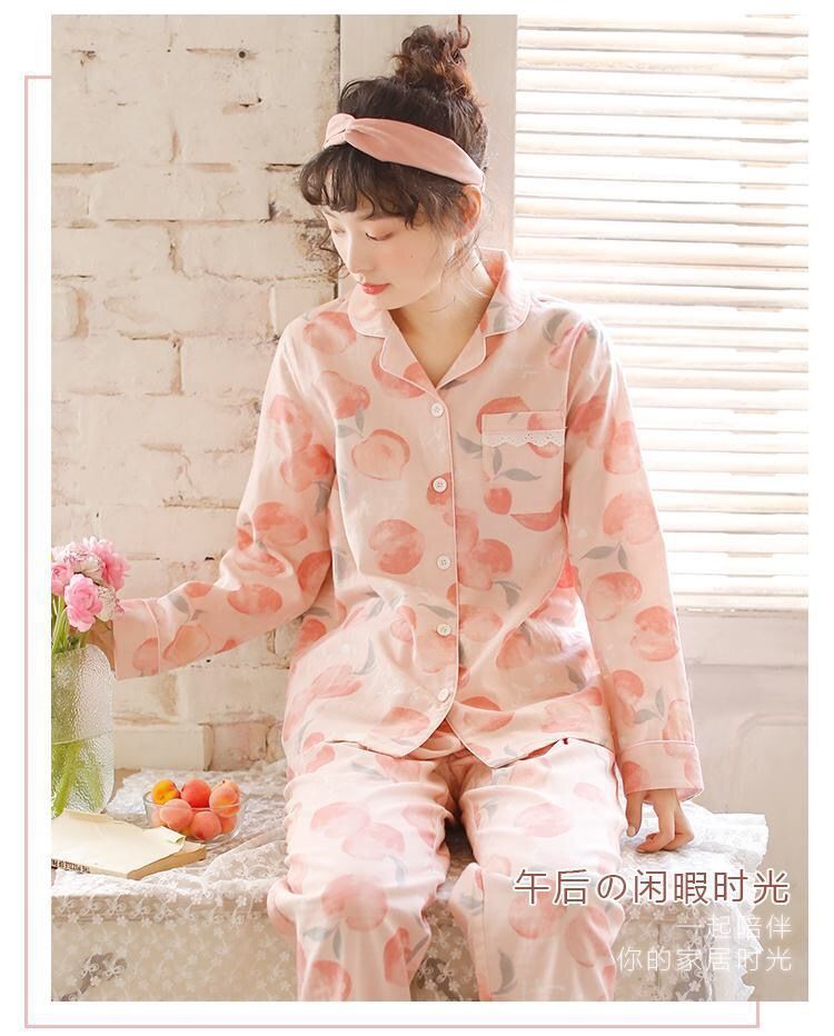 睡衣女纯棉睡衣女春秋季甜美水蜜桃翻领薄款学生大码可外穿家居服