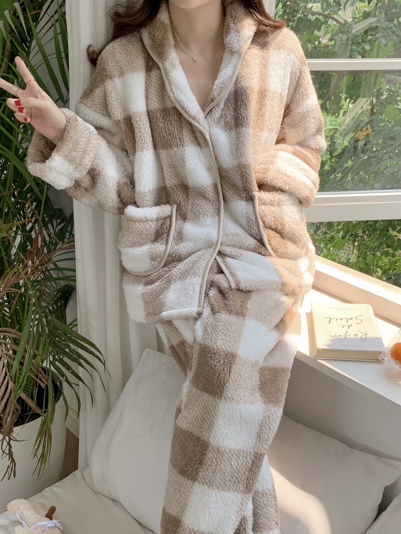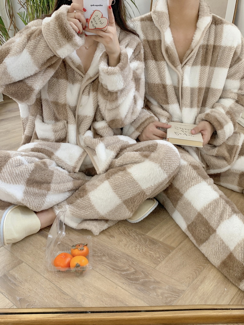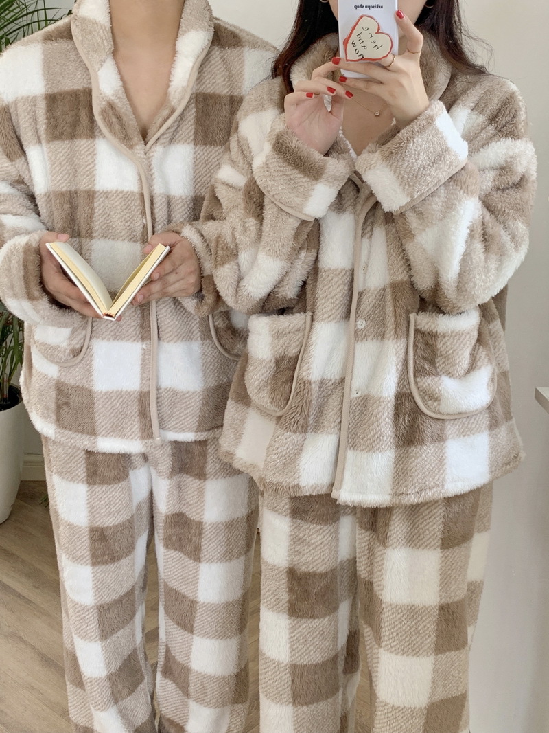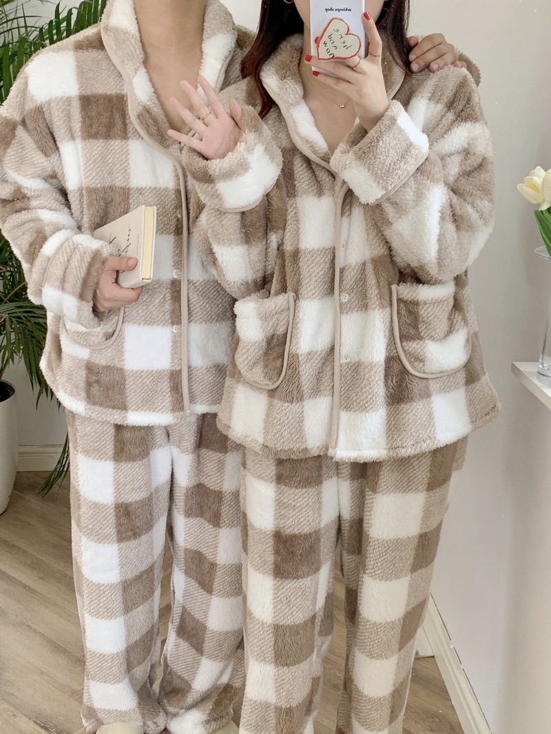 珊瑚绒情侣装大格子睡衣套装冬季长袖长裤两件套家居服韩国可外穿