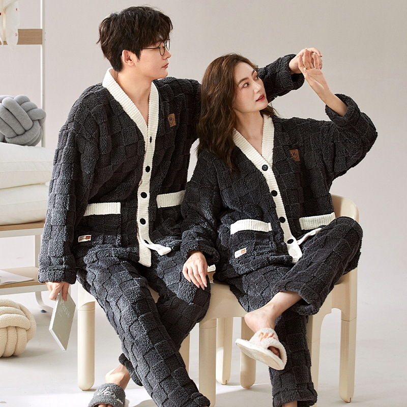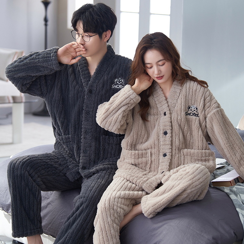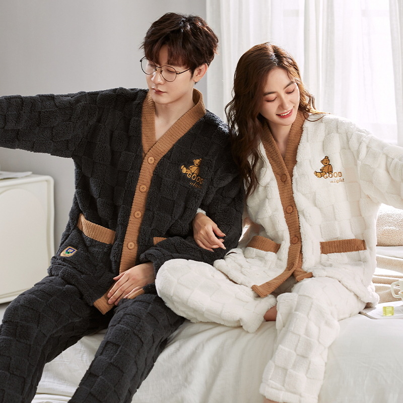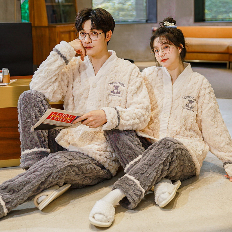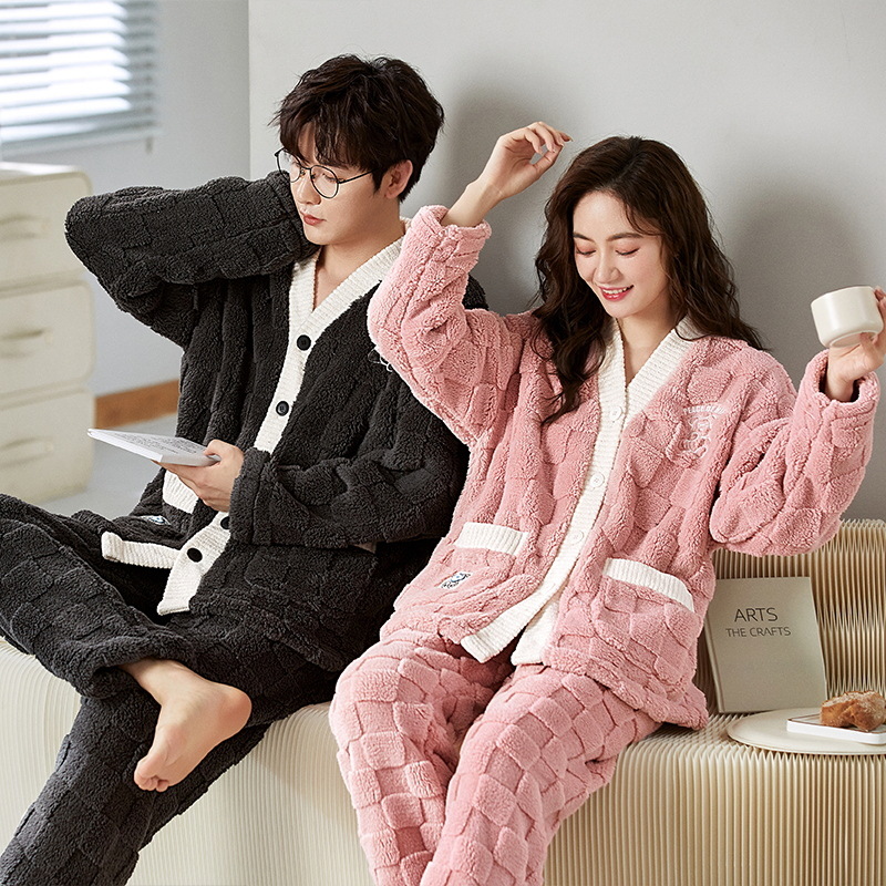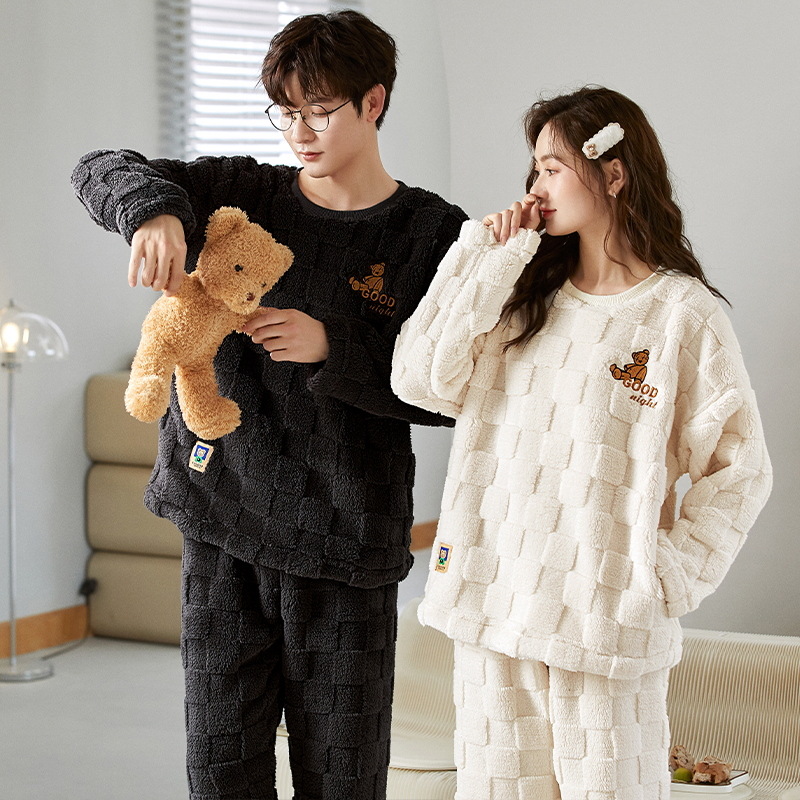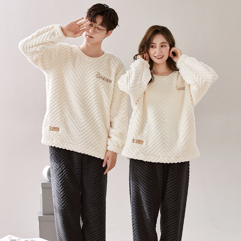 秋冬季新款情侣睡衣女珊瑚绒提花绒加绒加厚韩版可外穿男士家居服