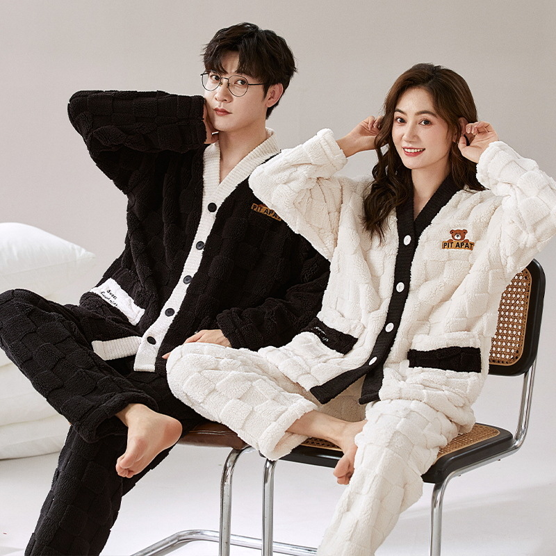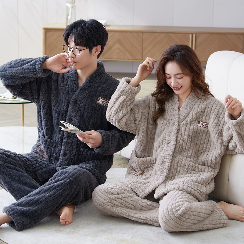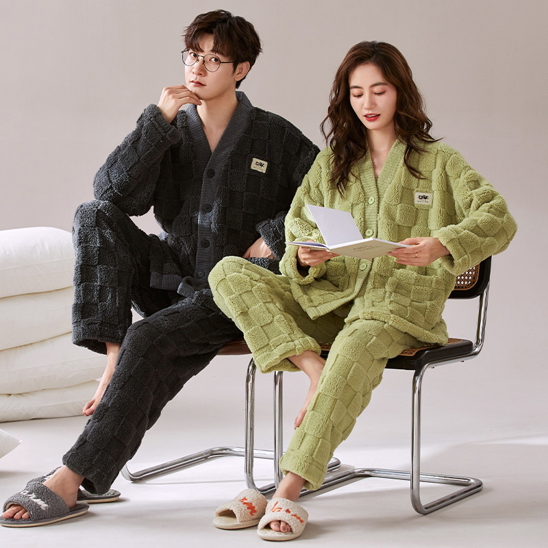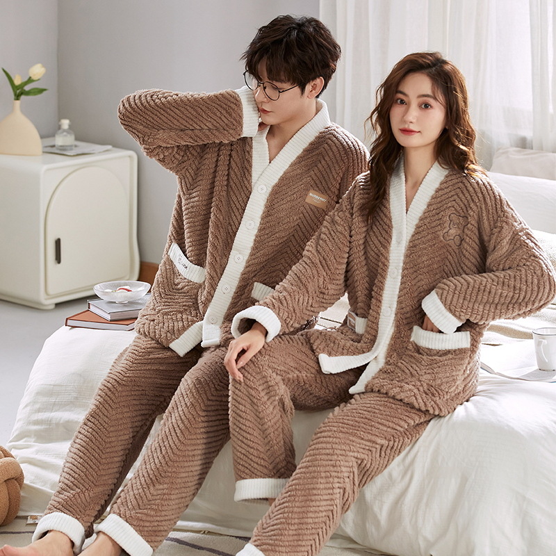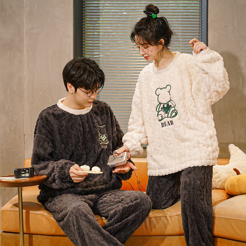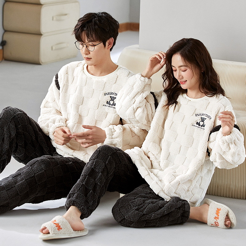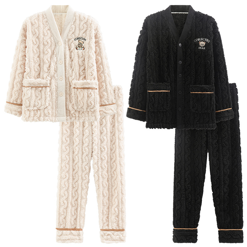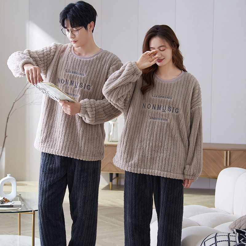 秋冬季新款情侣睡衣女珊瑚绒提花绒加绒加厚韩版可外穿男士家居服