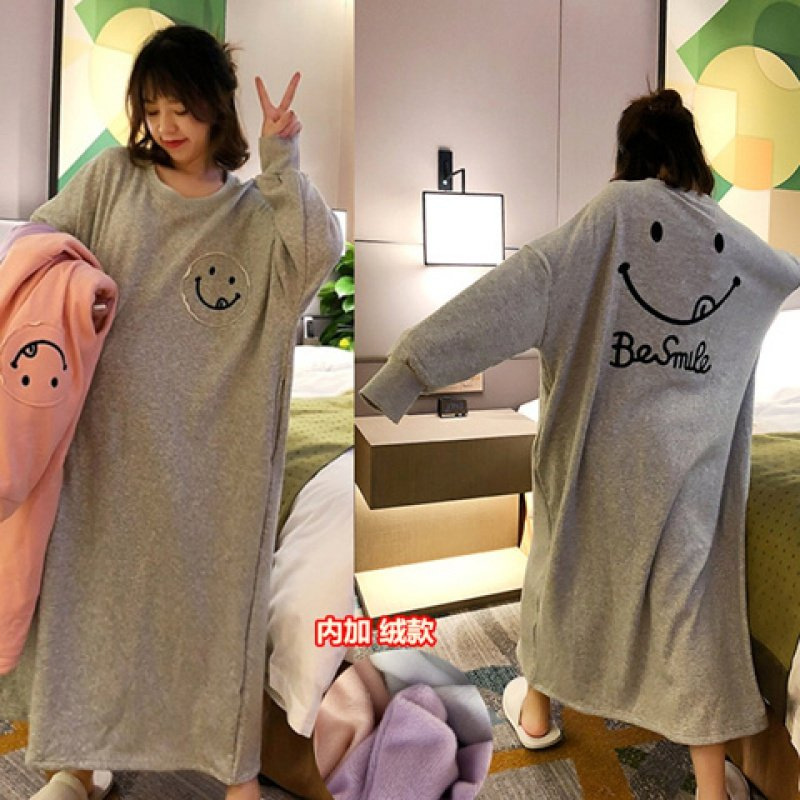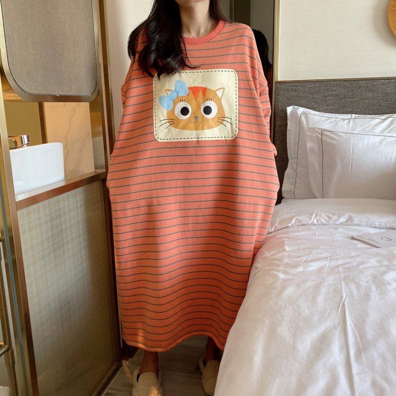 秋冬季睡裙女长袖针织棉加厚加绒保暖卡通可爱可外穿女士家居睡裙