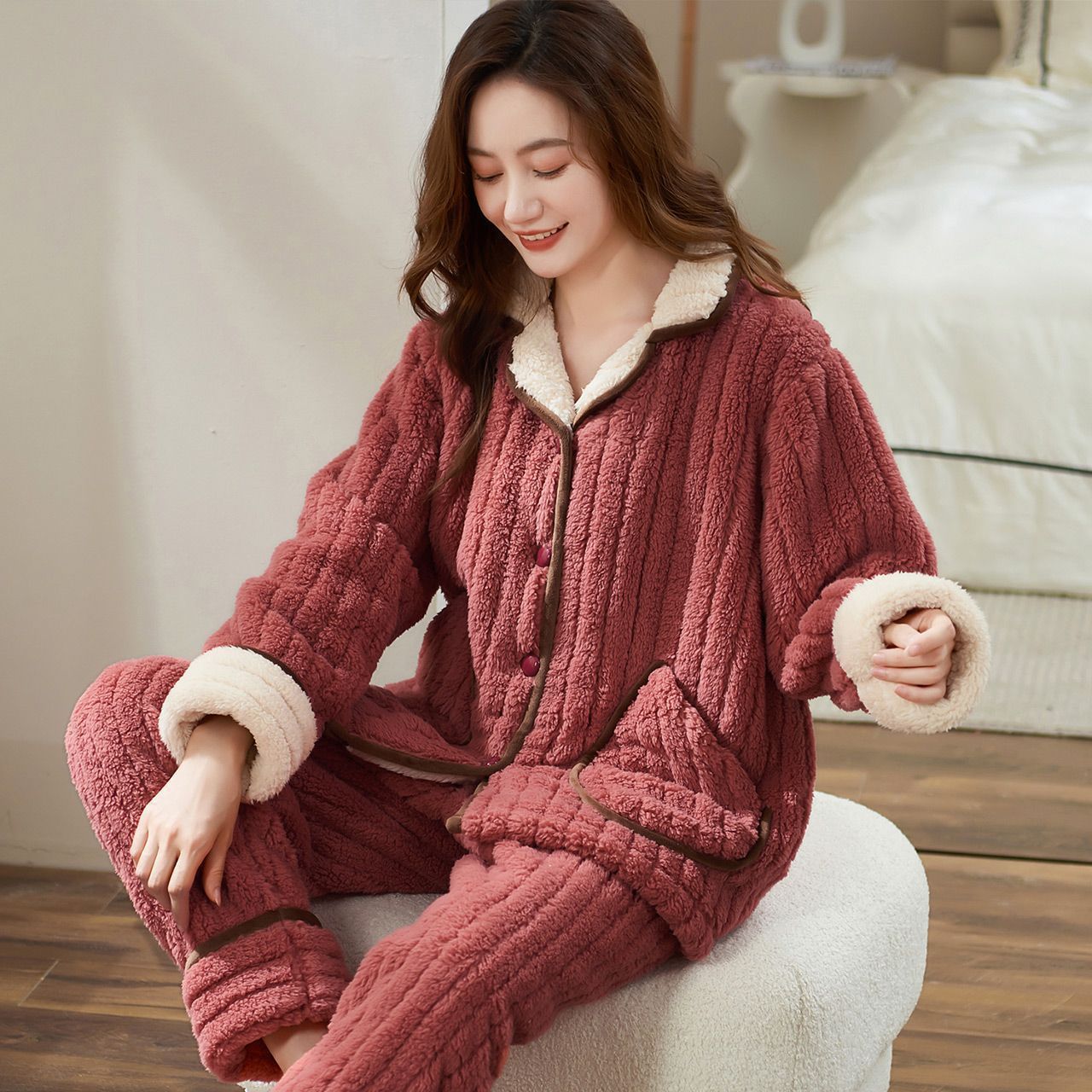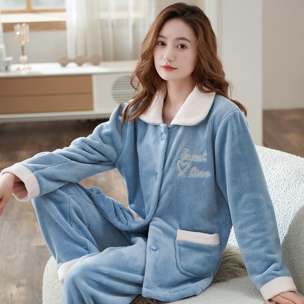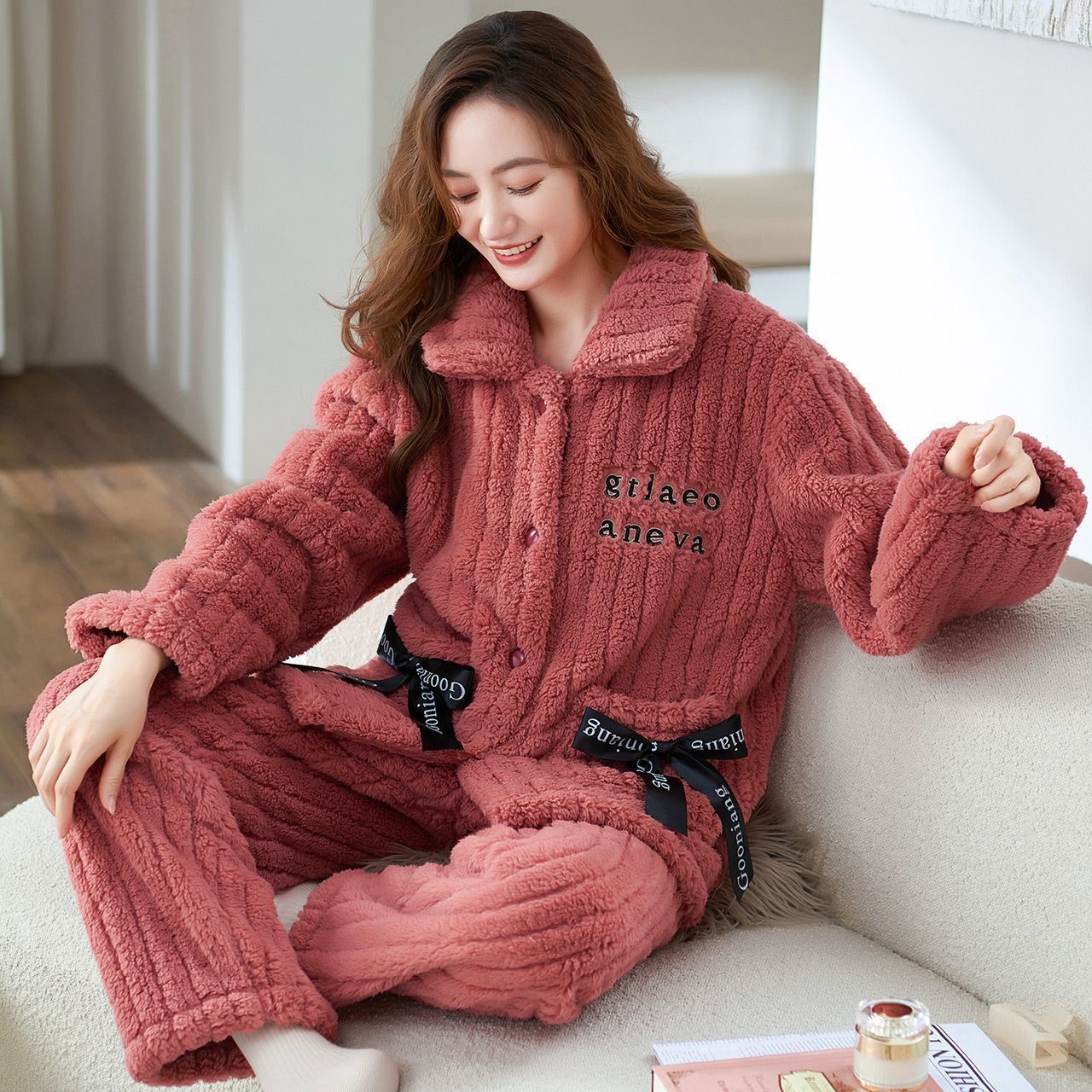 秋冬款睡衣女加厚加绒法兰绒长袖大码宽松珊瑚绒甜美家居服两件套