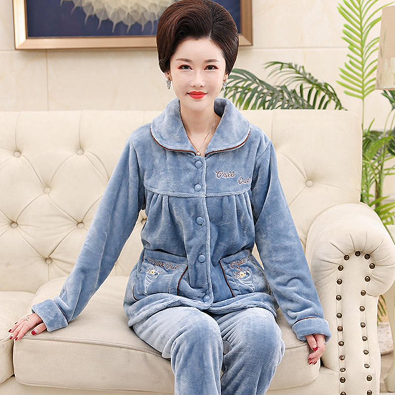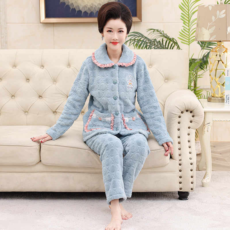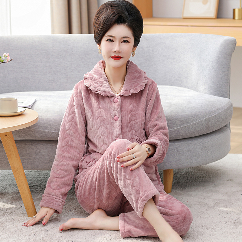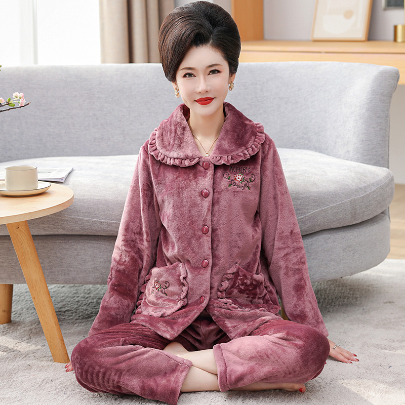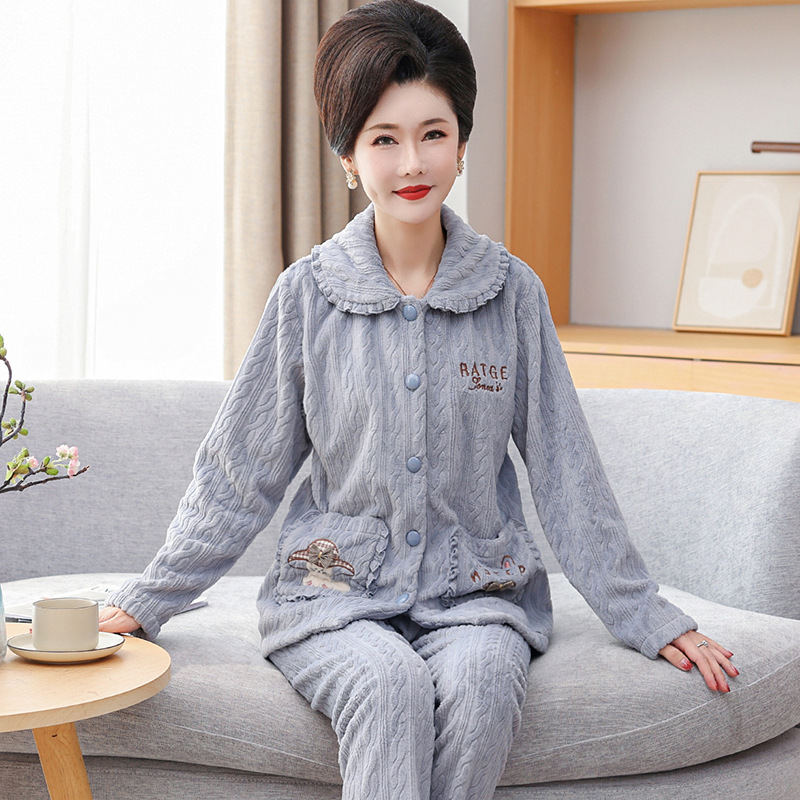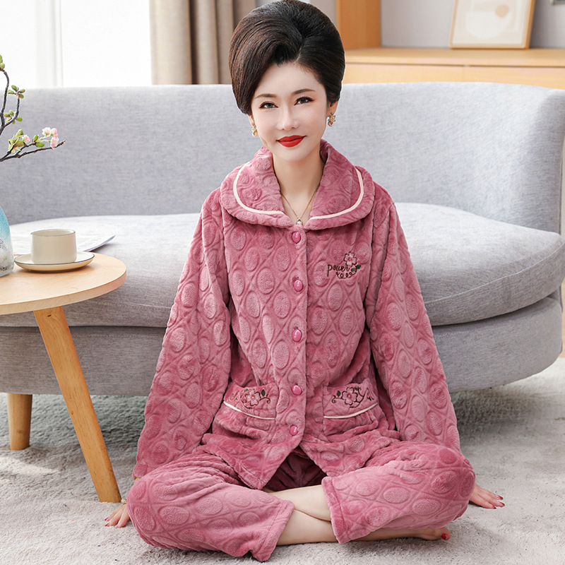 中老年妈妈睡衣冬季长袖开衫珊瑚绒剪花保暖大码女士法兰绒睡衣