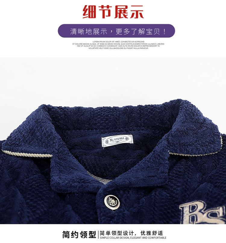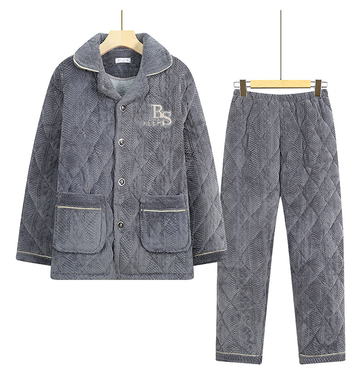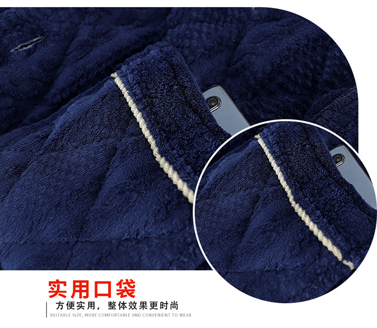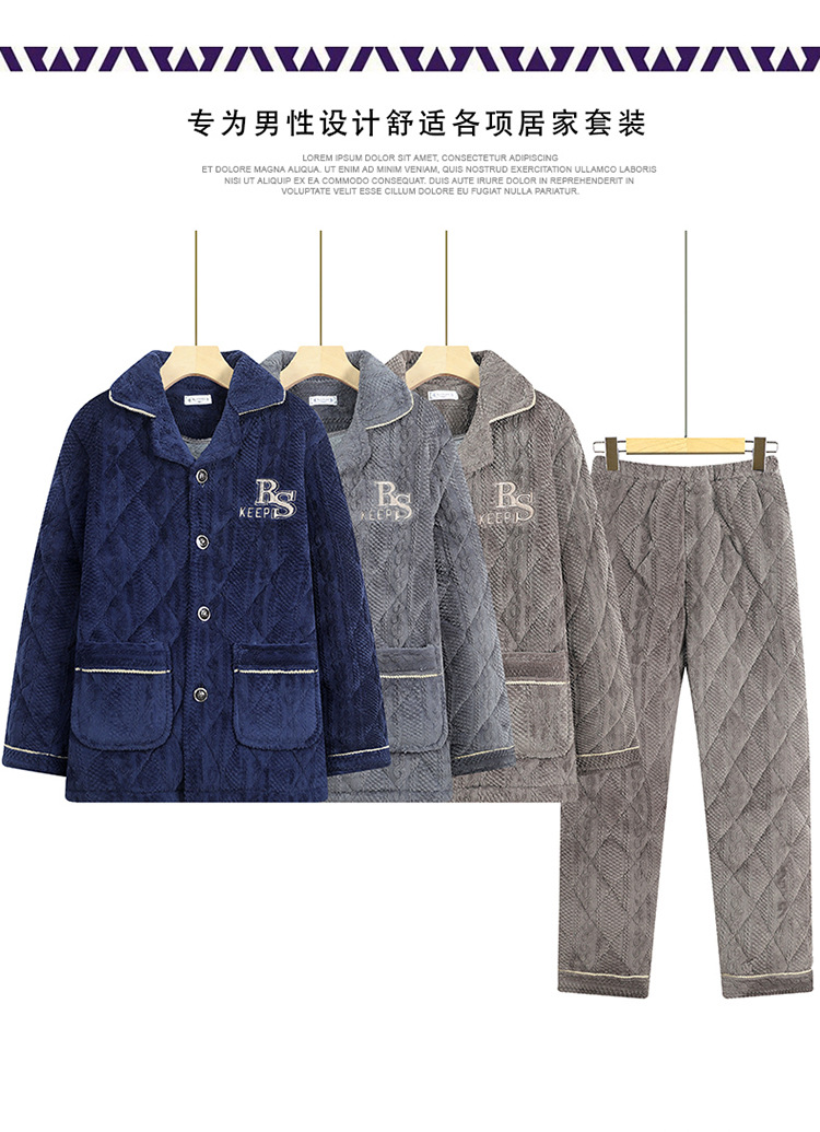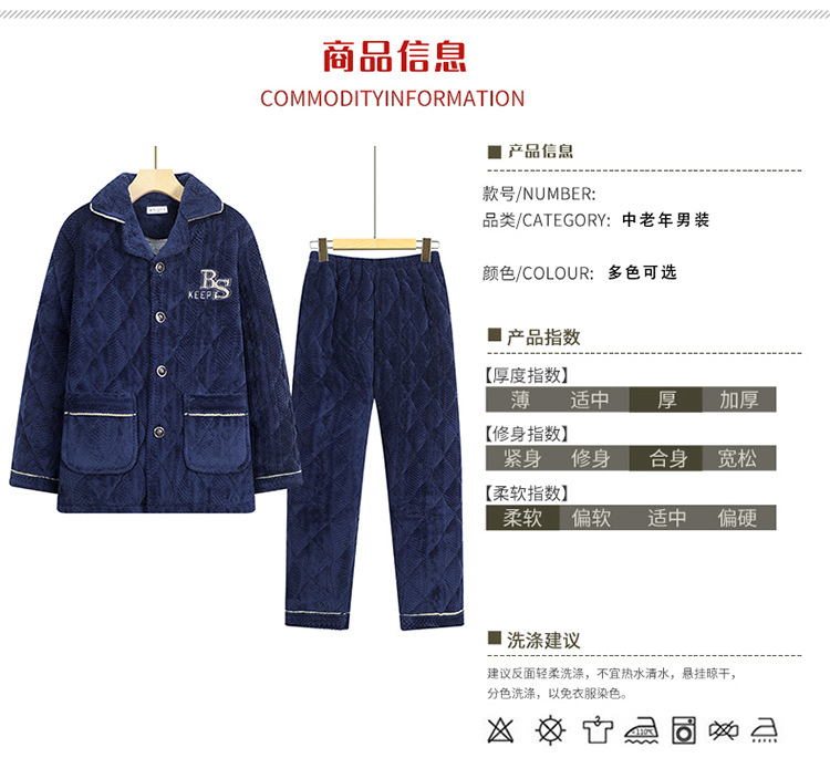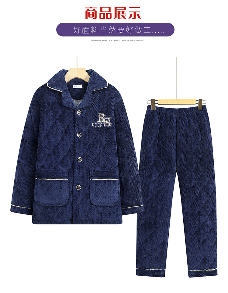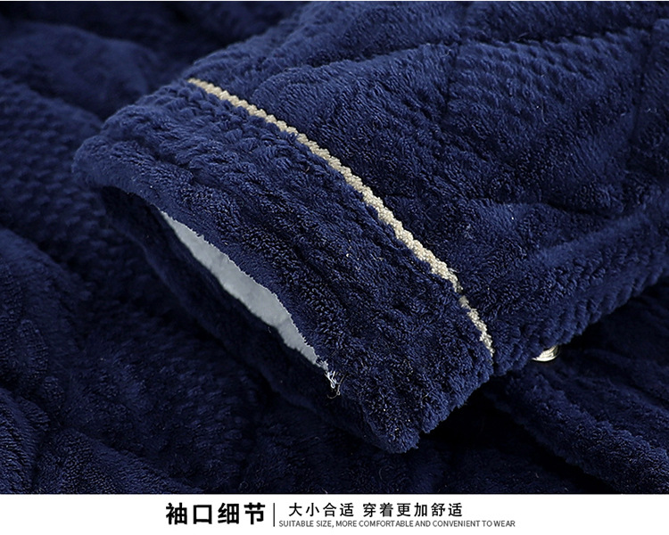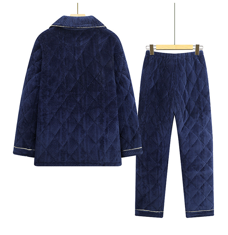 男士睡衣冬季三层夹棉加厚加绒保暖家居服中老年爸爸法兰绒套装
