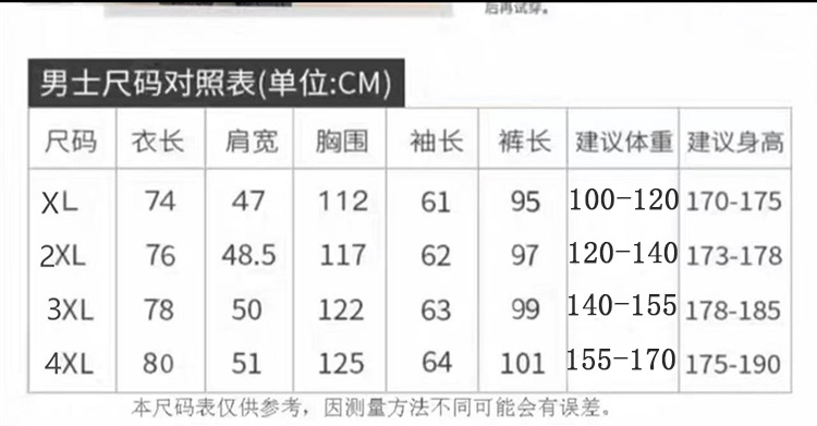 | 4xl (recommended 85.00 kg-95.00 kg(4XL(建议170-190斤)) | USD $0.0 | 280 set available |