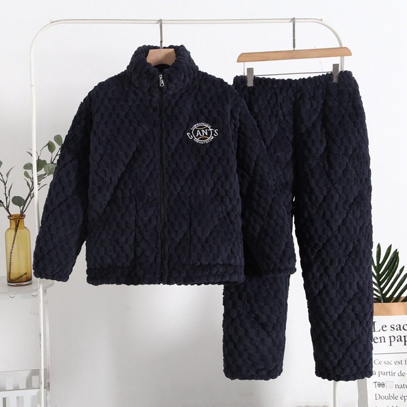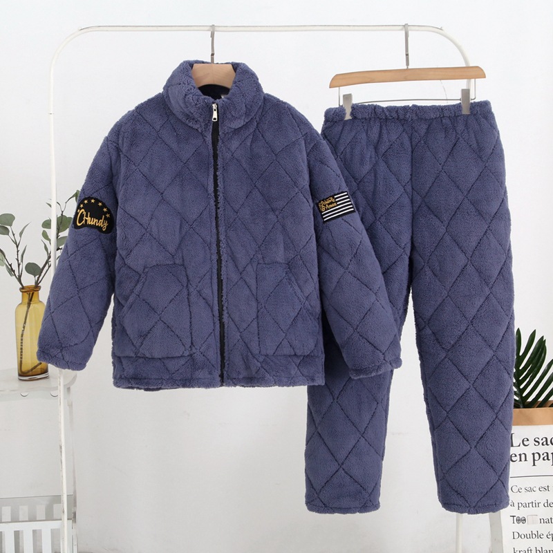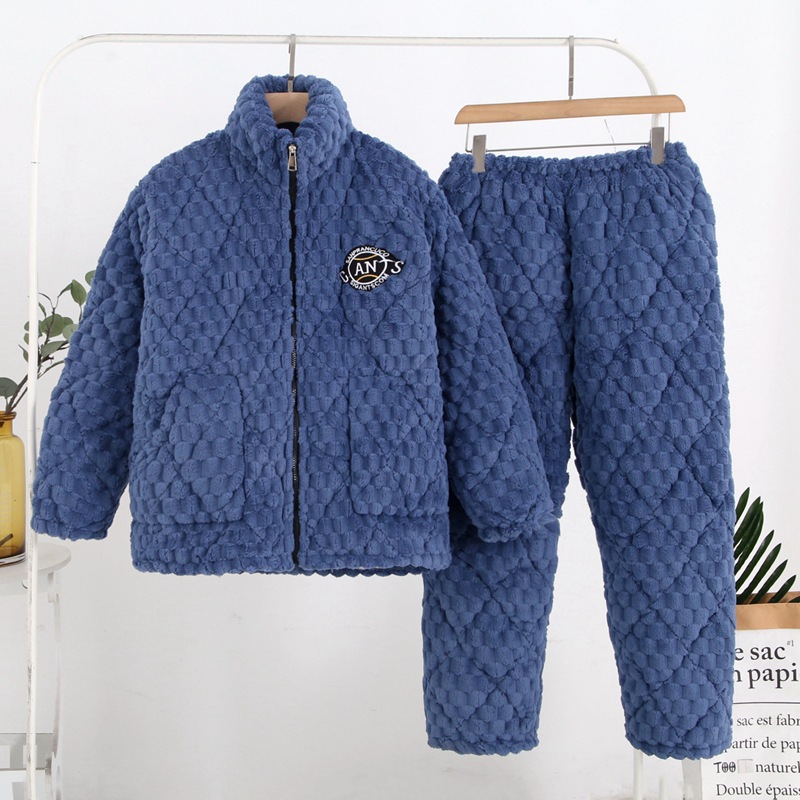 冬季男士法兰绒睡衣 中老年三层夹棉加厚加绒家居服珊瑚绒棉袄秋
