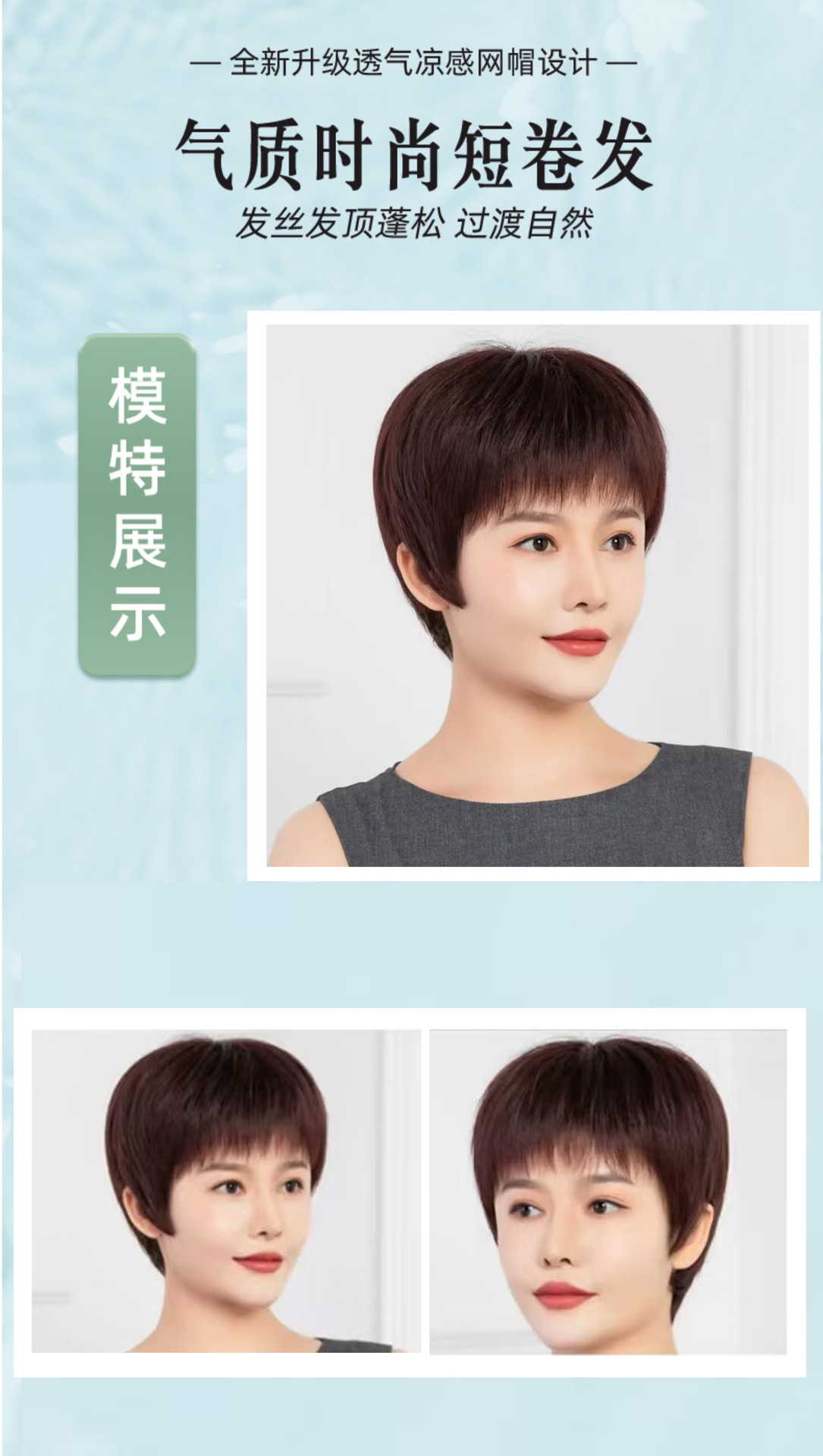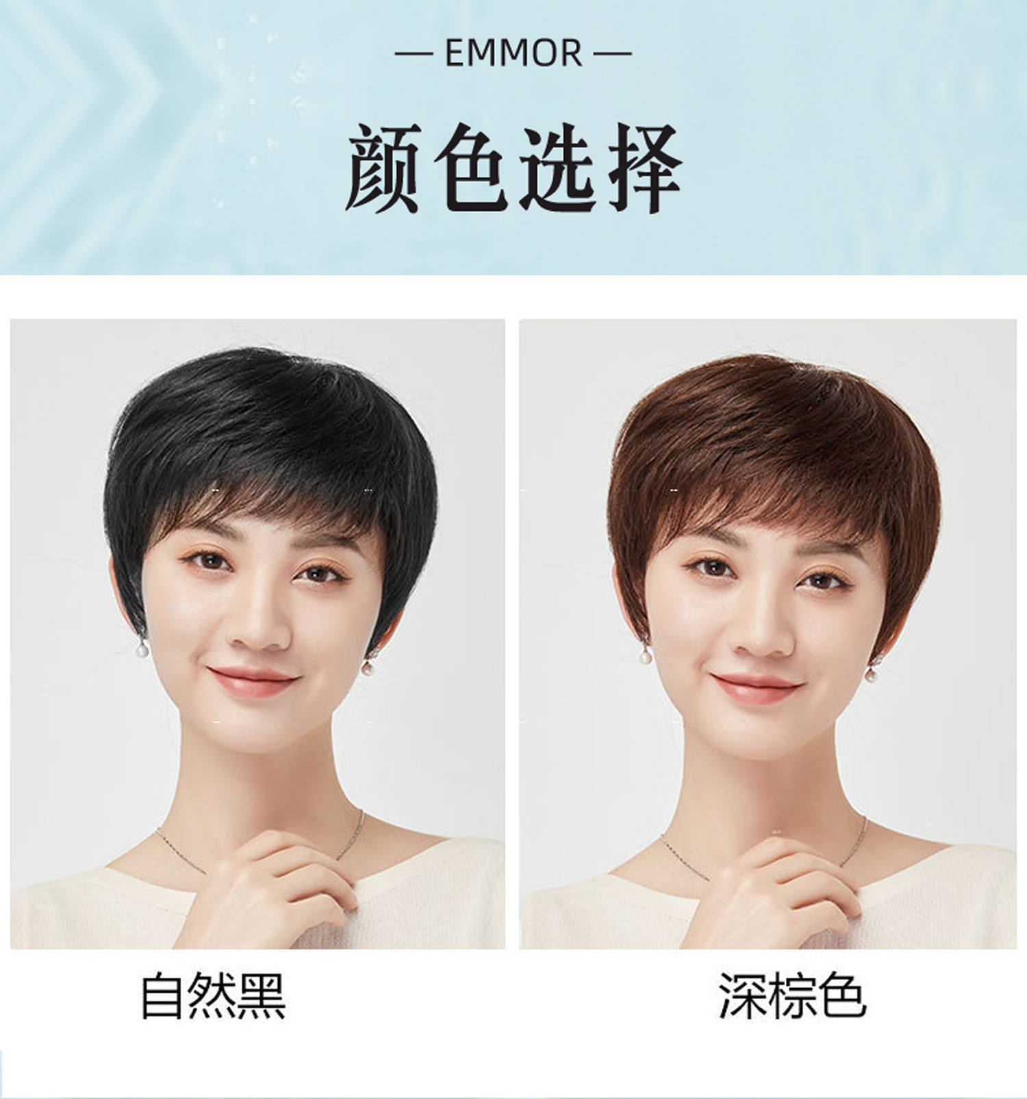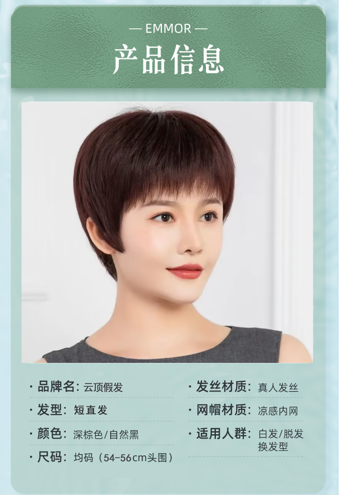 全手织假发女短发全头套真人发丝短直发中老年女士自然妈妈假发套