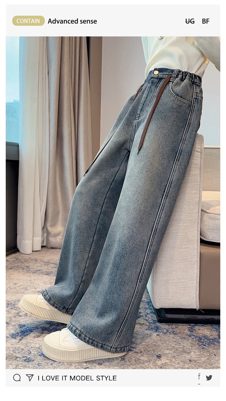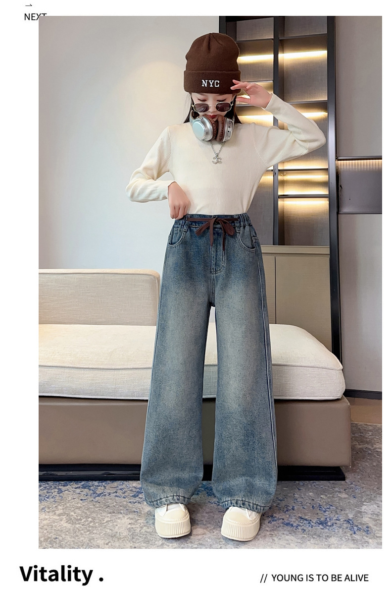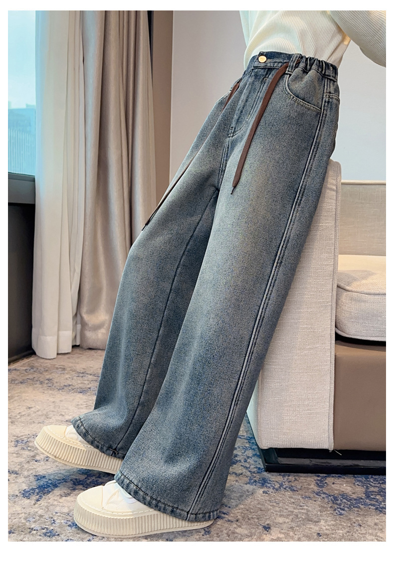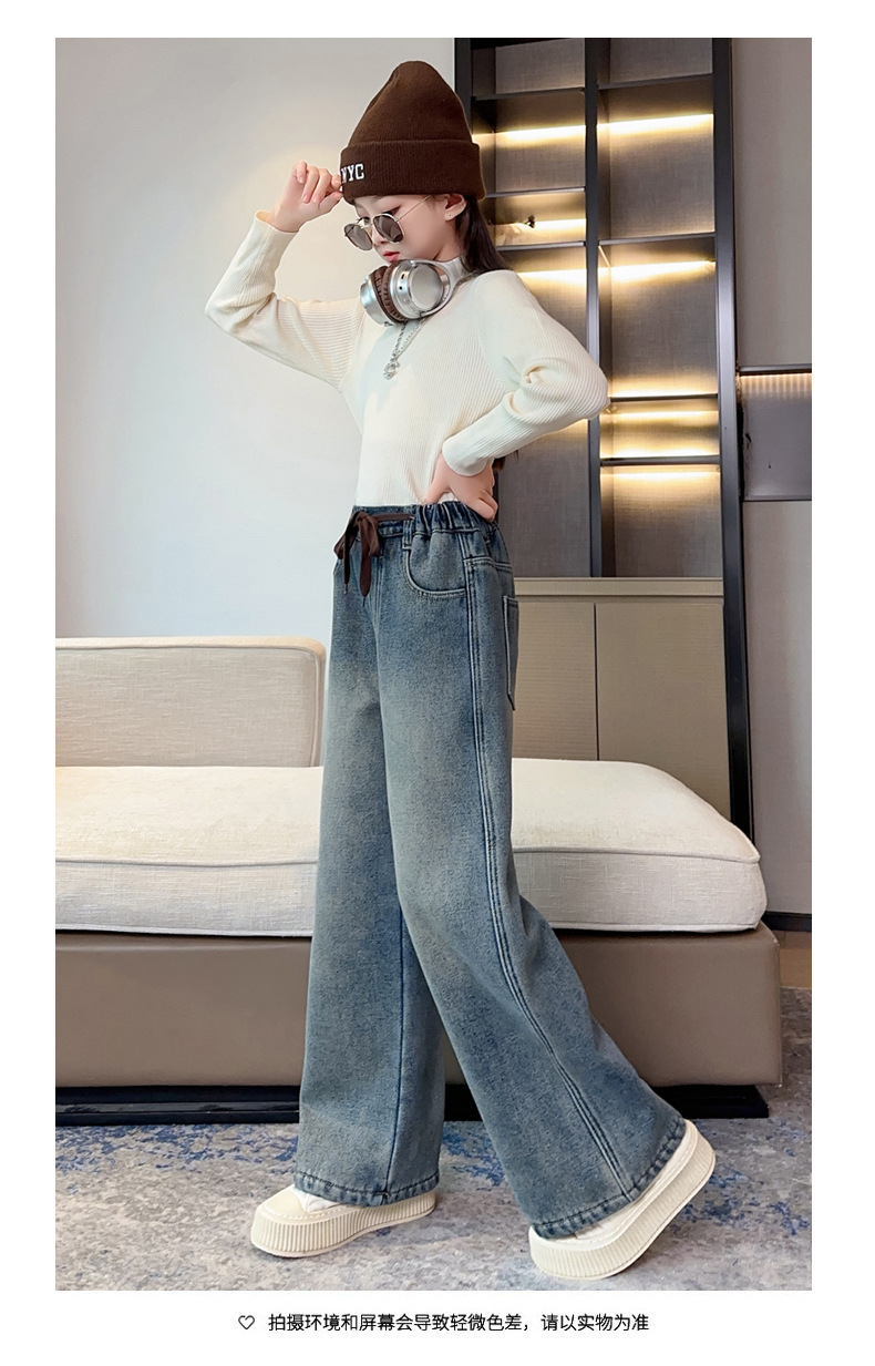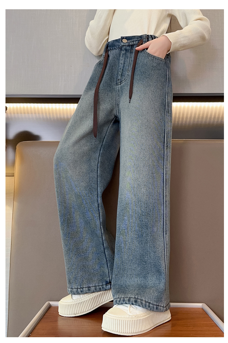 女童牛仔裤加绒加厚2023冬季新款中大童宽松直筒百搭一体绒长裤子