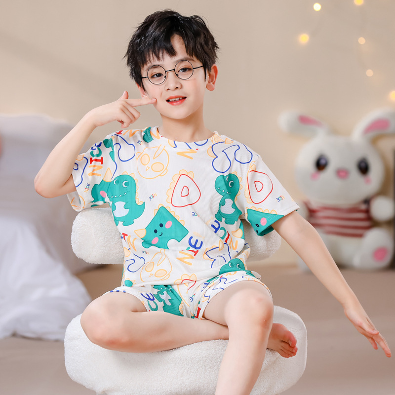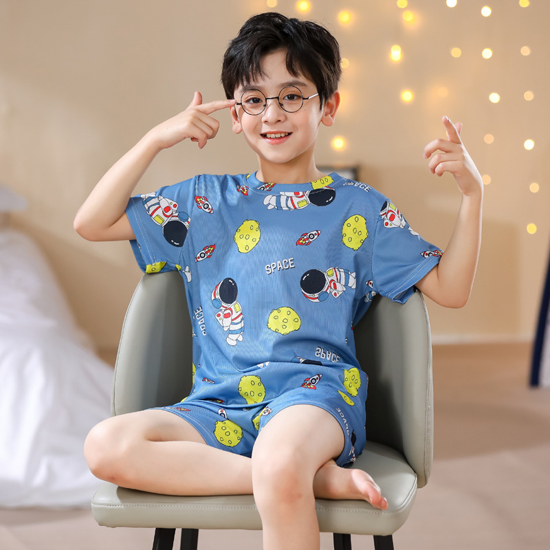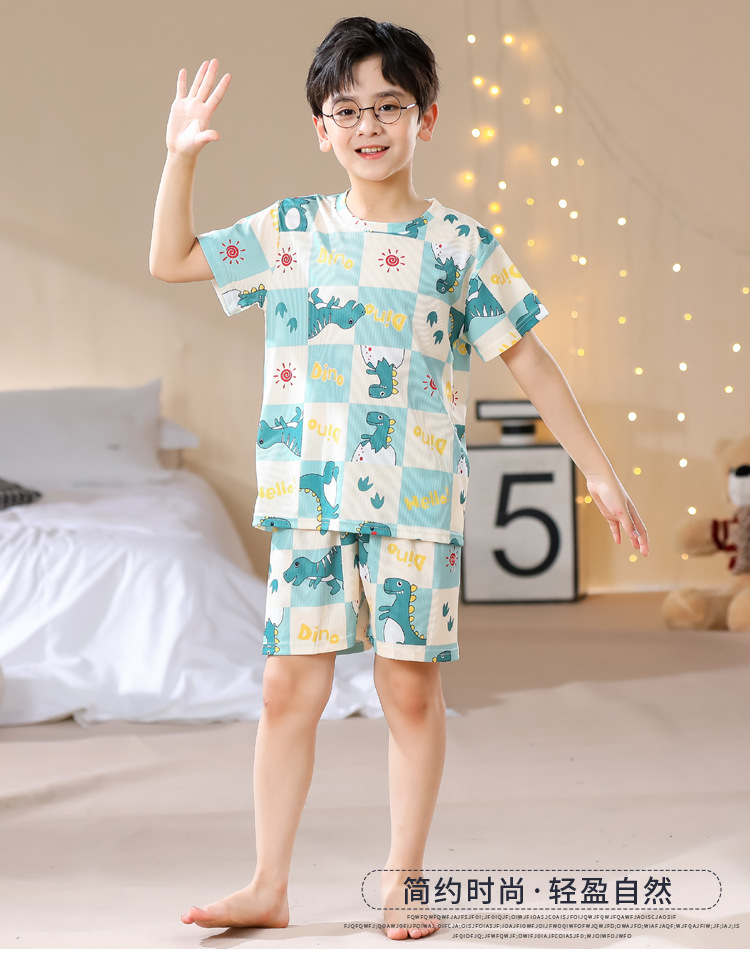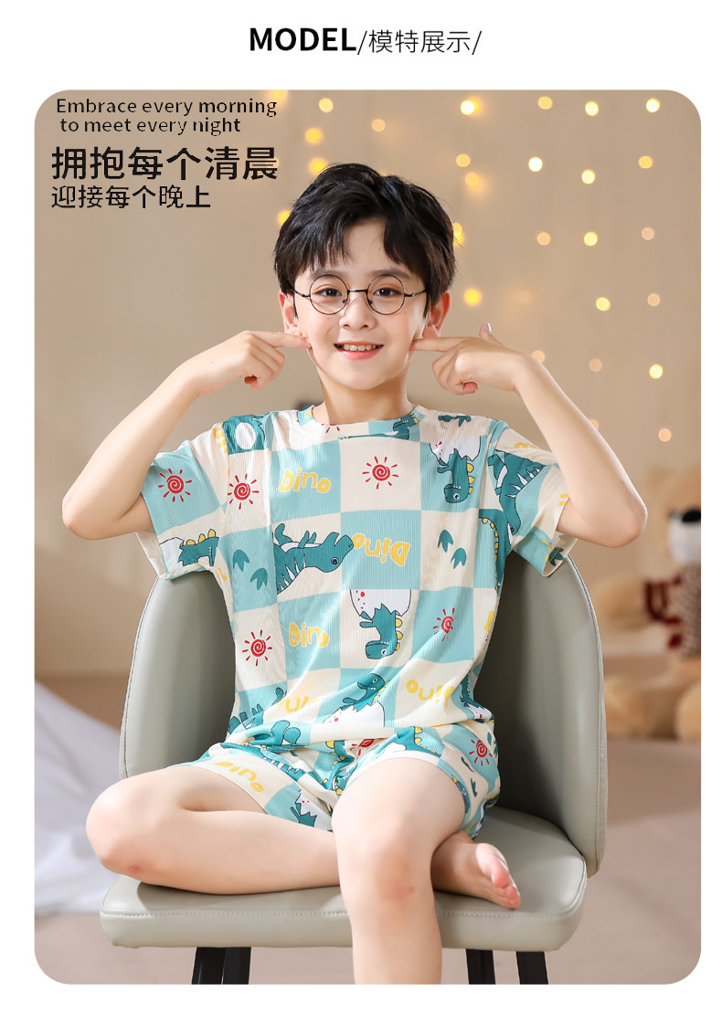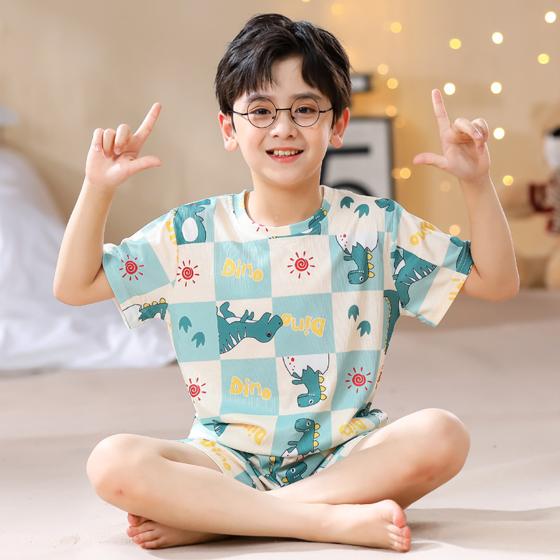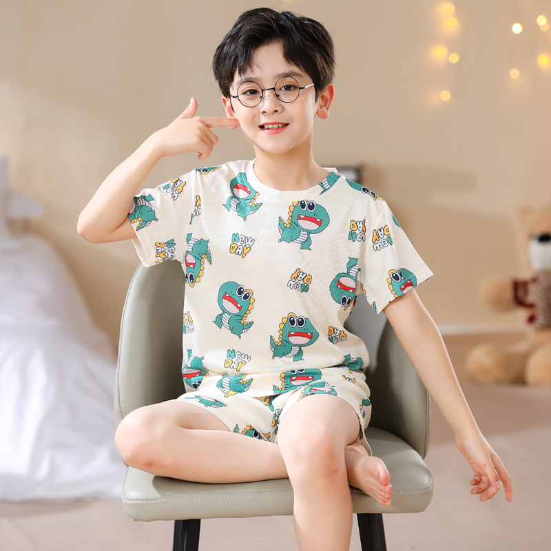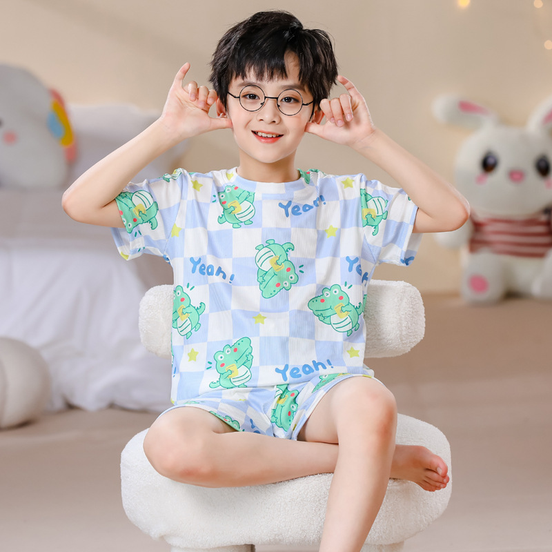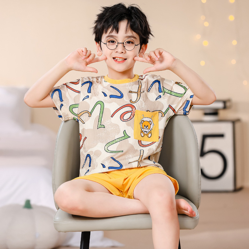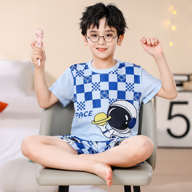 2023夏季儿童睡衣男童冰丝棉坑条韩版家居服中大男孩短袖女孩套装