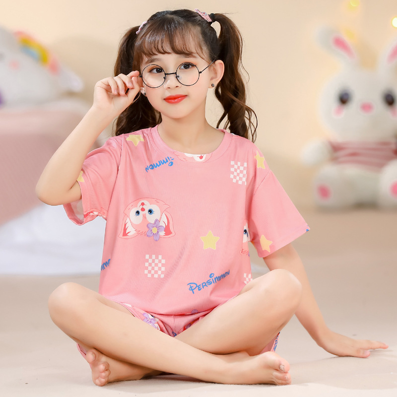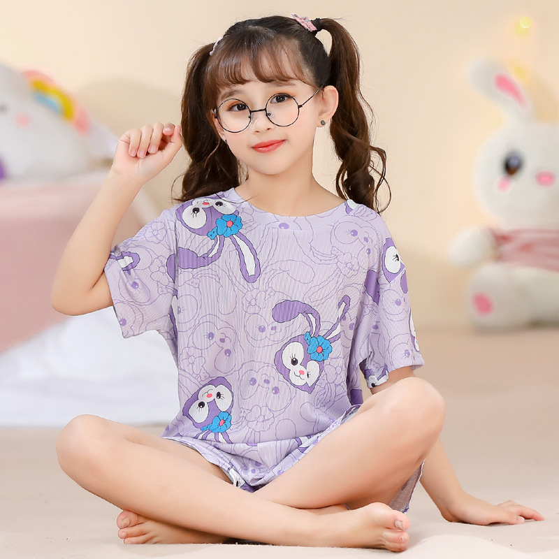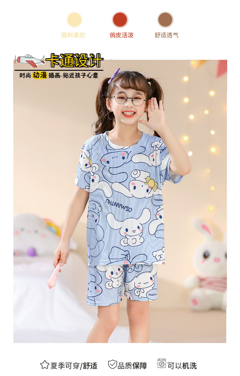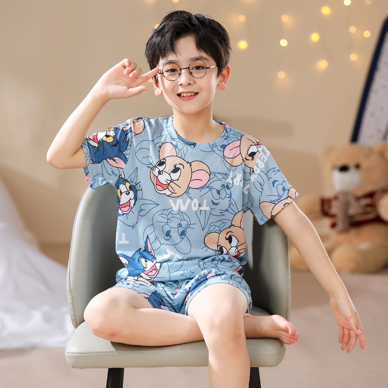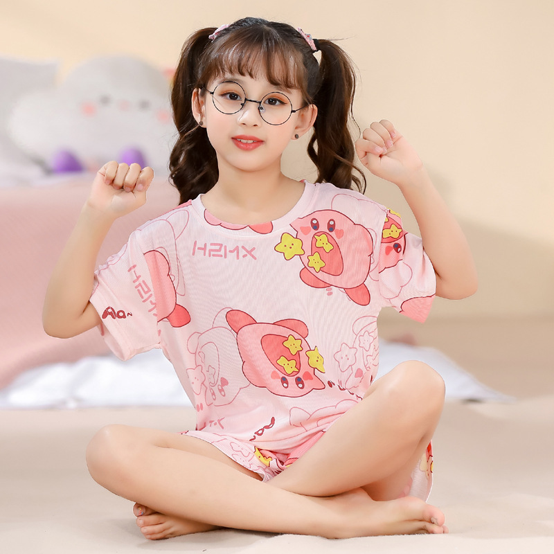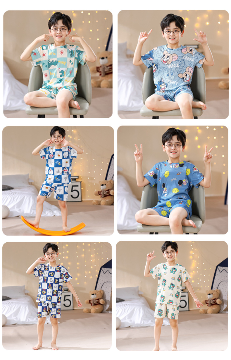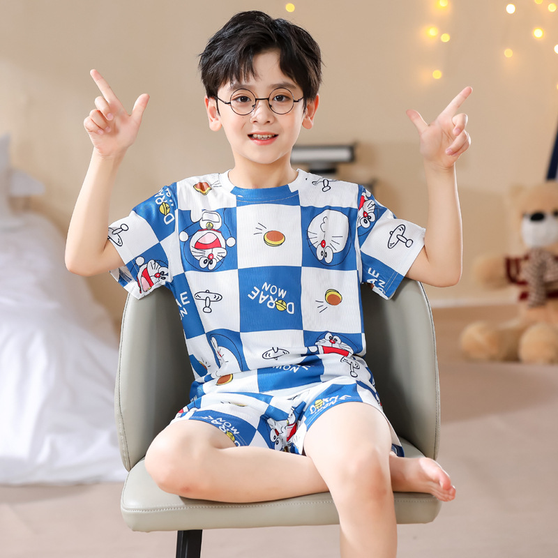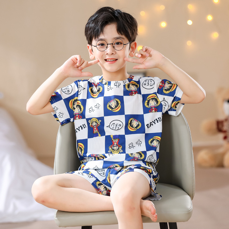 2023夏季儿童睡衣男童冰丝棉坑条韩版家居服中大男孩短袖女孩套装