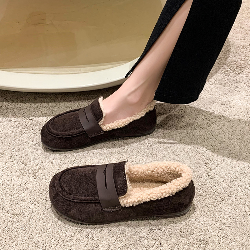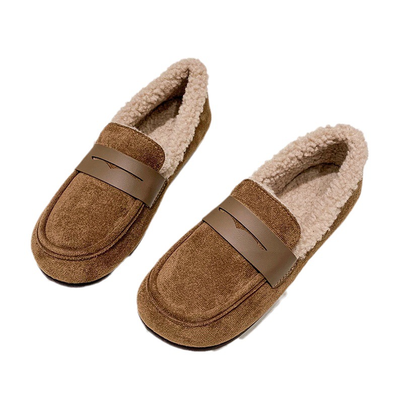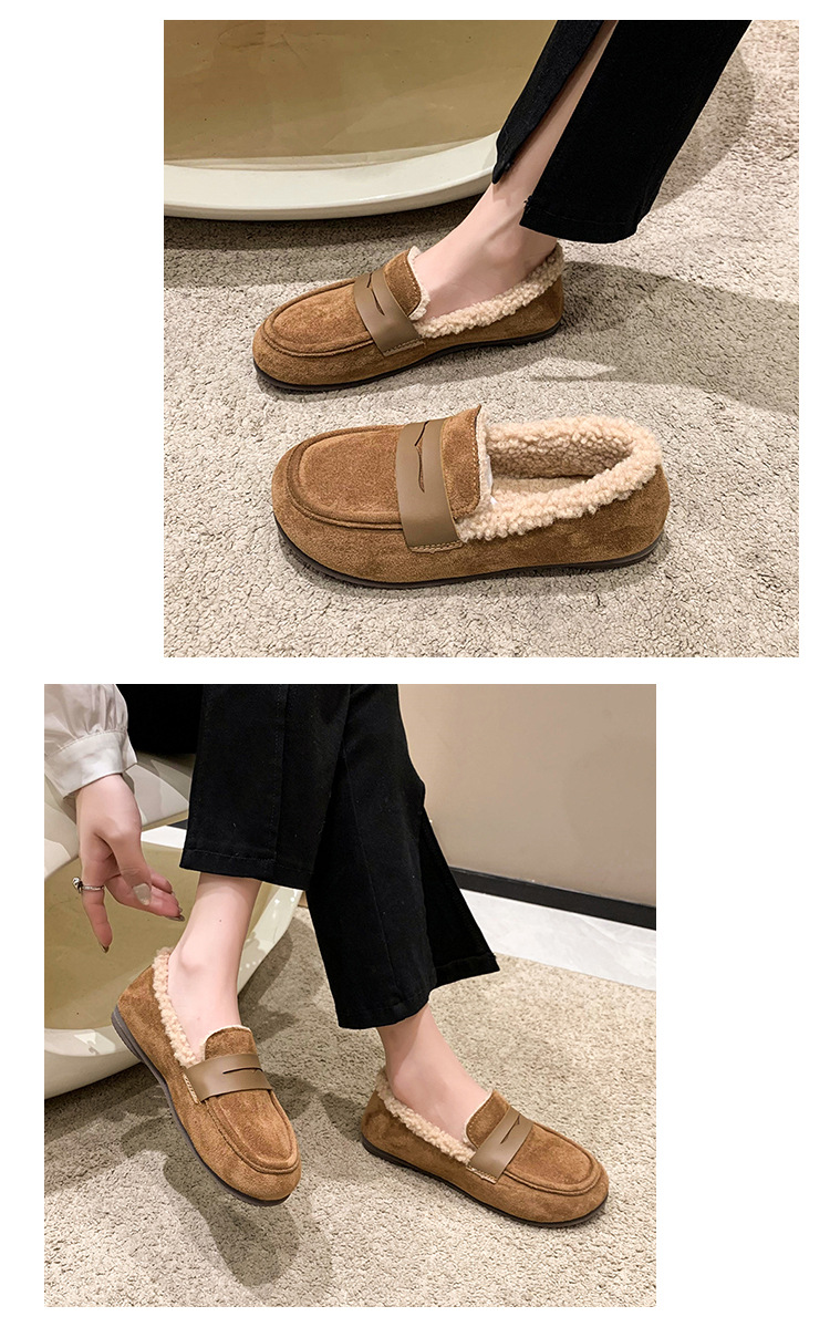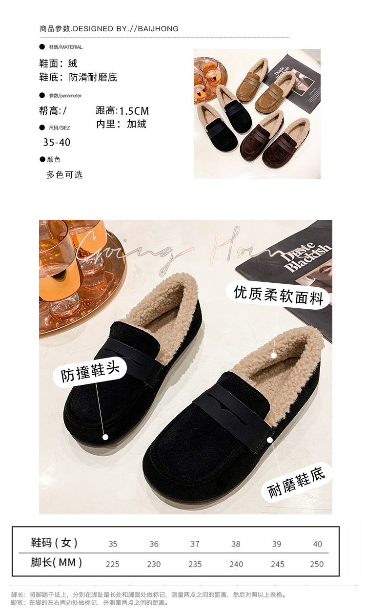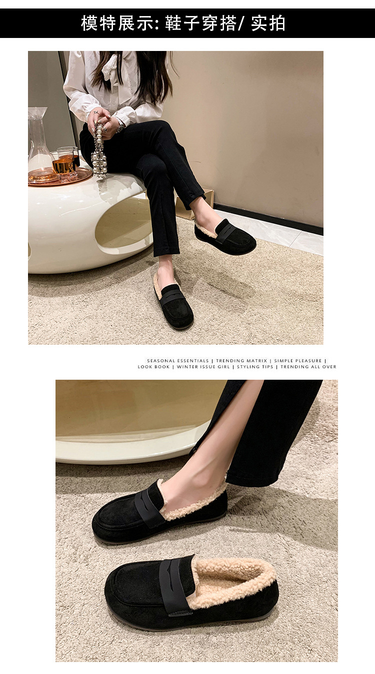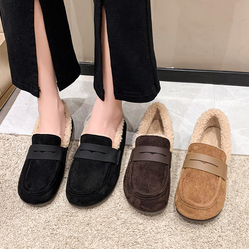 软底软皮加绒保暖小皮鞋女2023秋冬新款平底圆头孕妇一脚蹬豆豆鞋