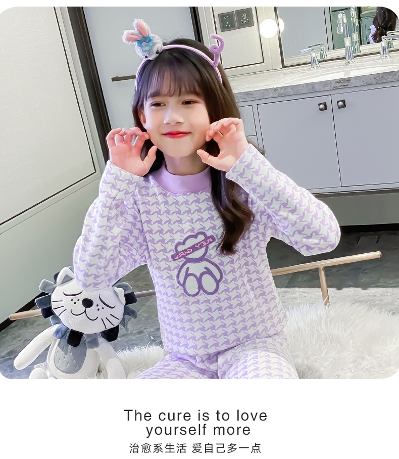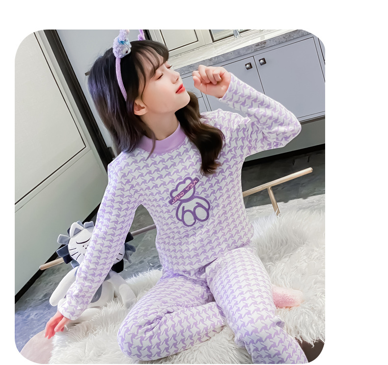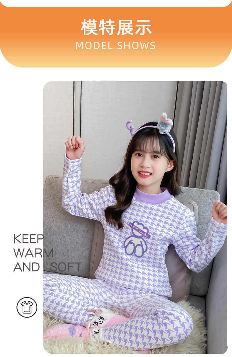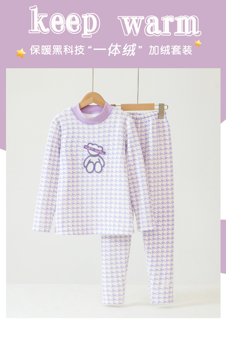 A类一体绒圆领保暖内衣套装 儿童千鸟格熊23秋冬新款女童加绒内衣