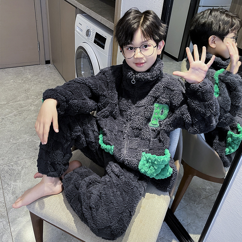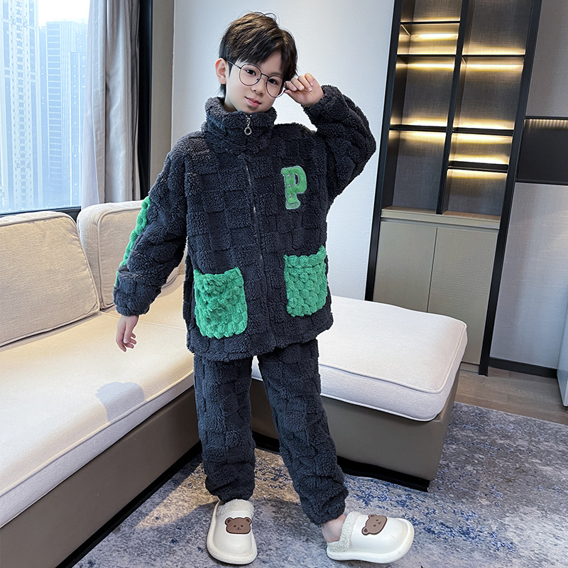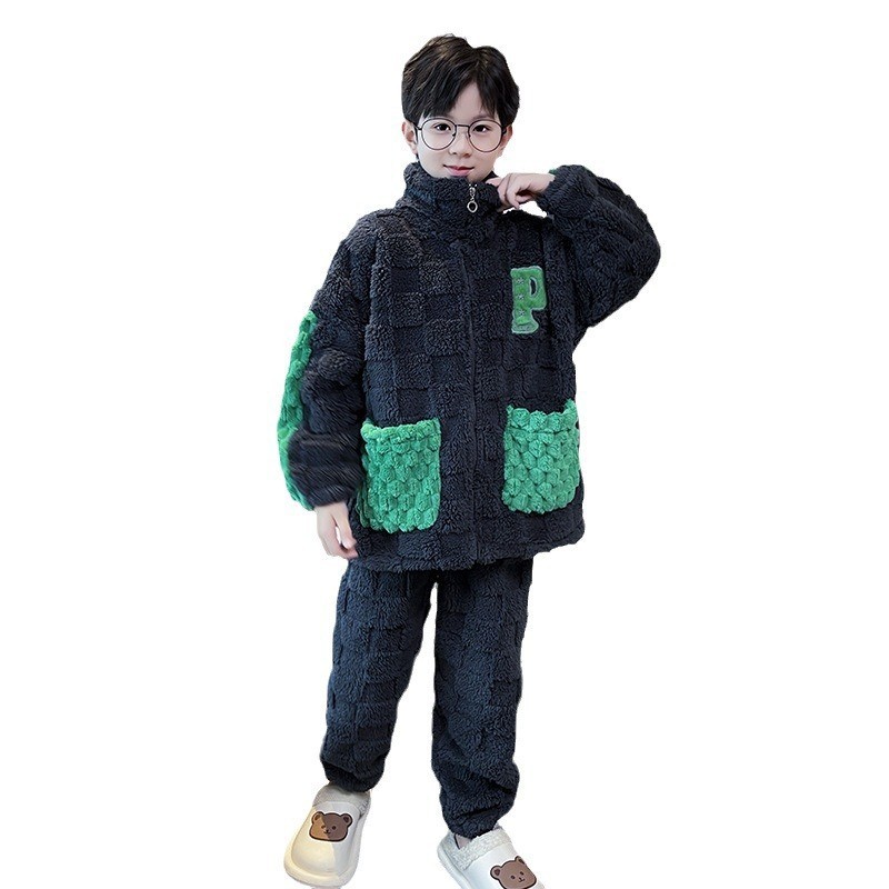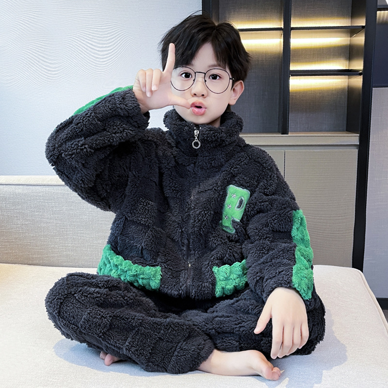 儿童学生中大童字母A类开衫睡衣2023年冬季黑拼绿方块法兰绒睡衣