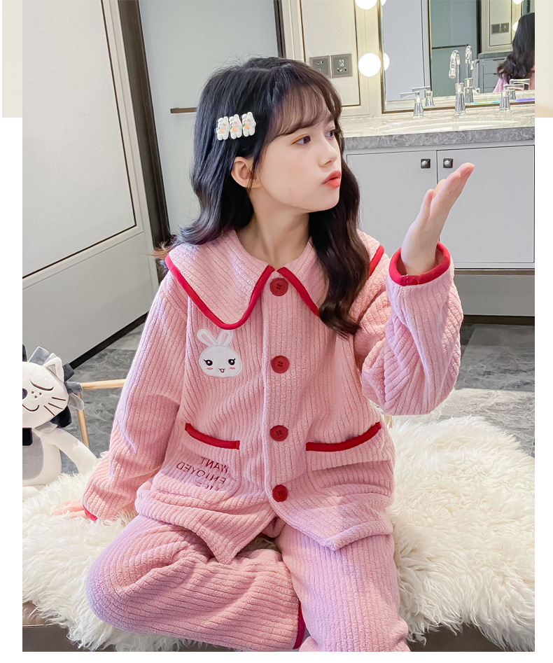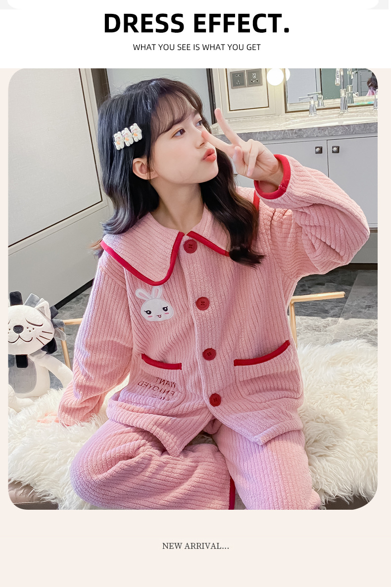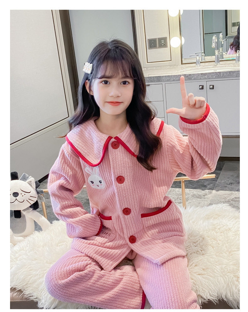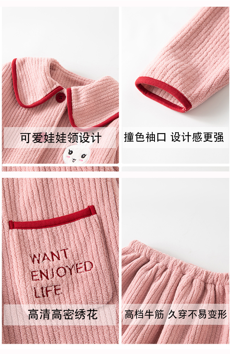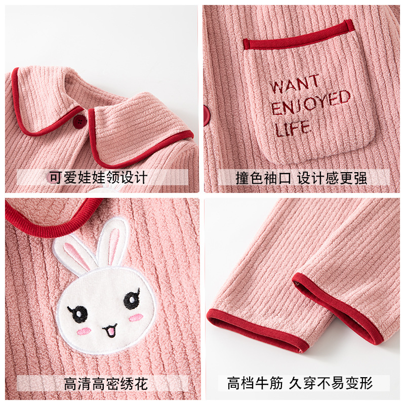 儿童家居服亲子坑条暖绒拼色粉兔2023秋冬新款法兰绒女童套装A类