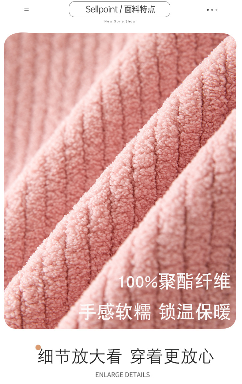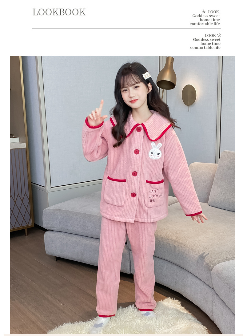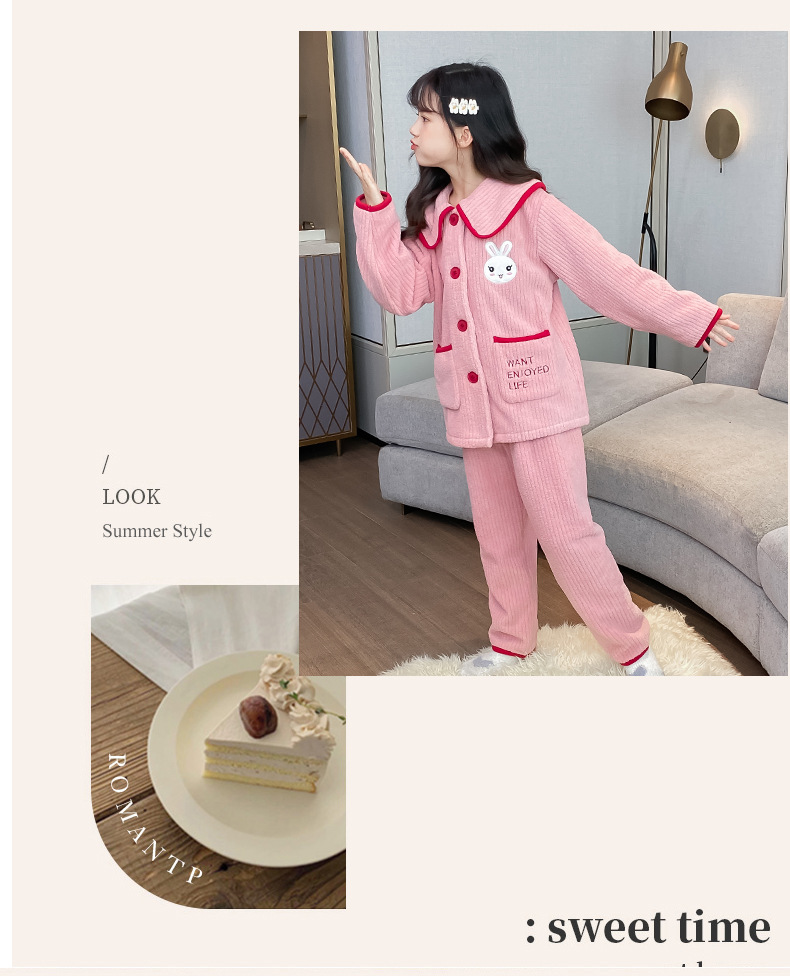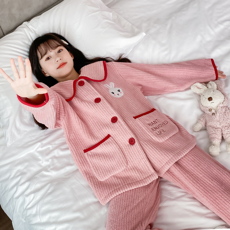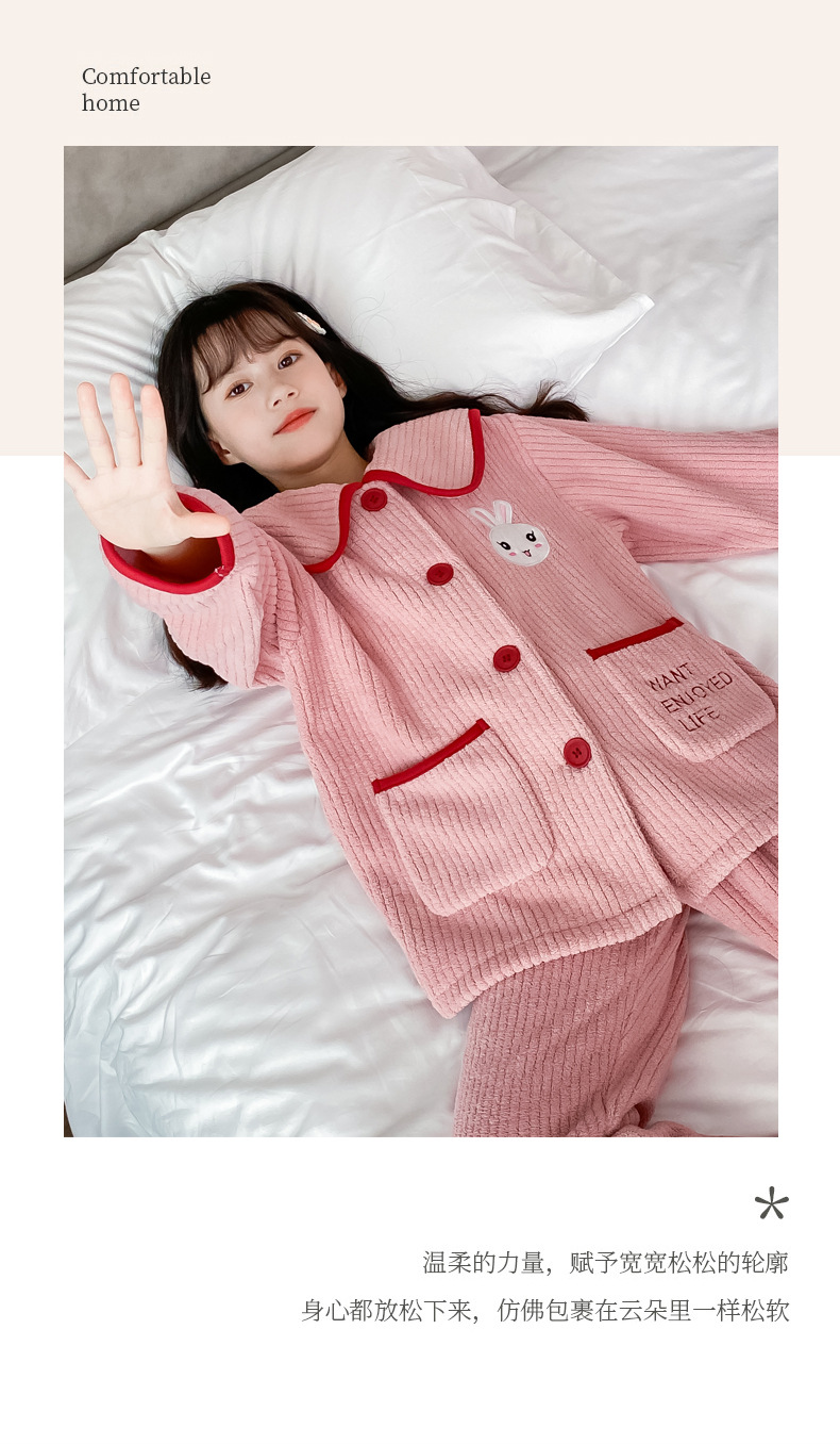 儿童家居服亲子坑条暖绒拼色粉兔2023秋冬新款法兰绒女童套装A类