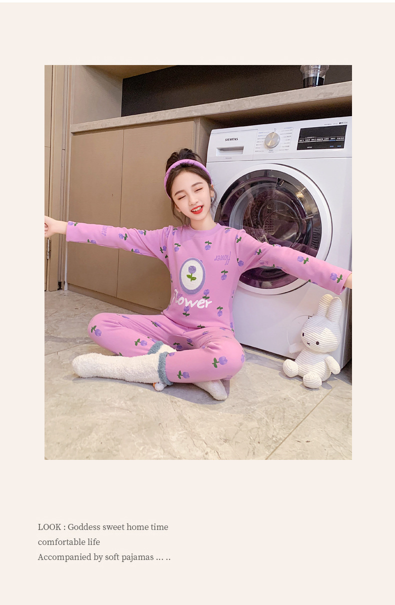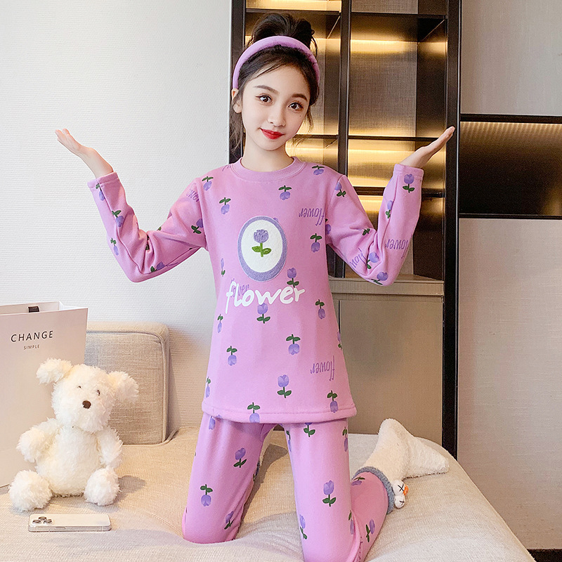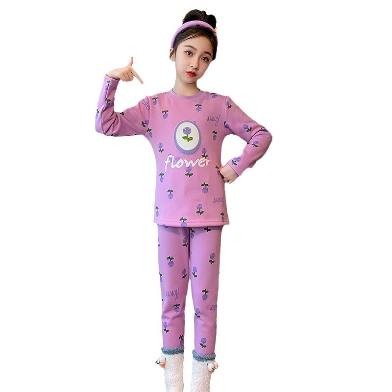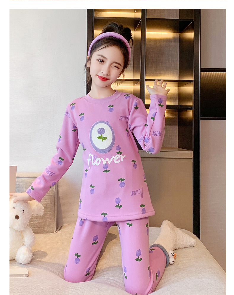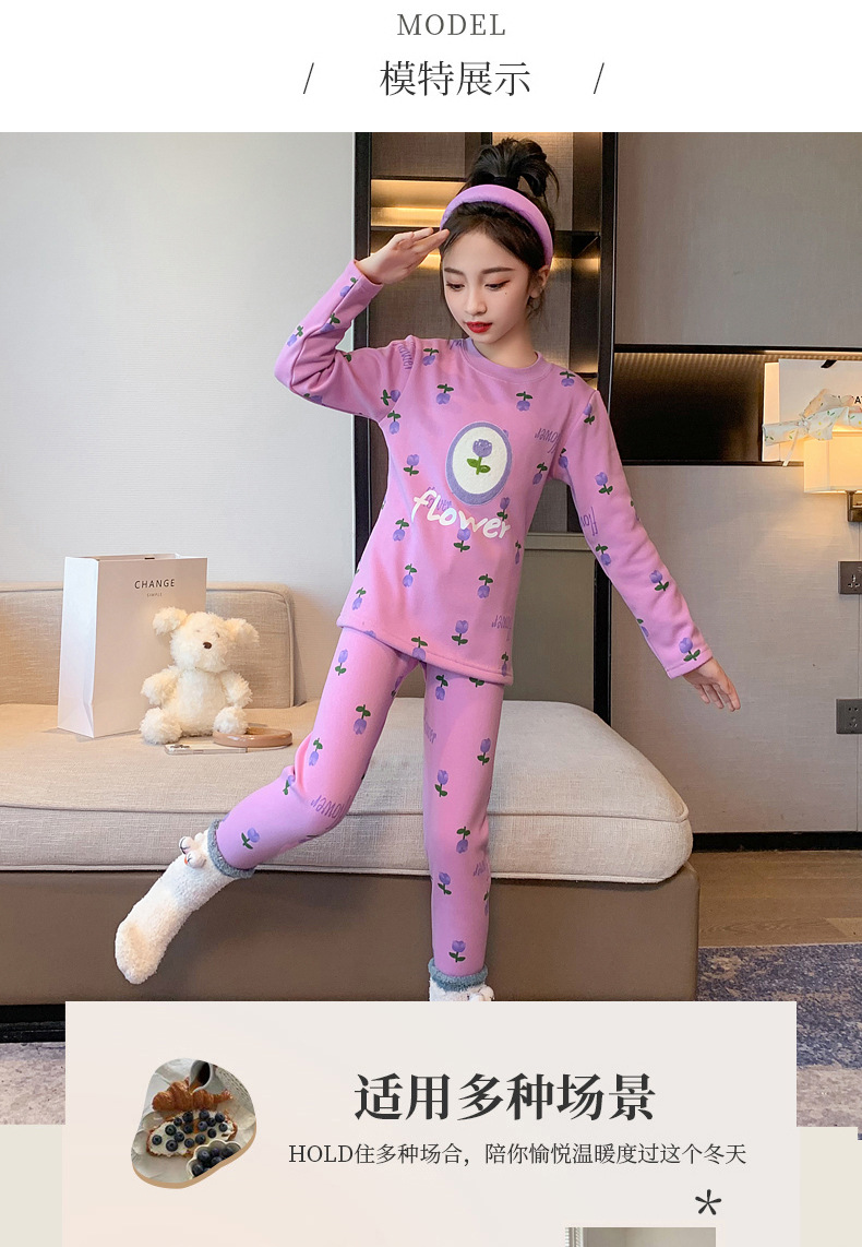 2023秋冬新款女童A类一体绒圆领保暖内衣套装 儿童郁金香加绒内衣