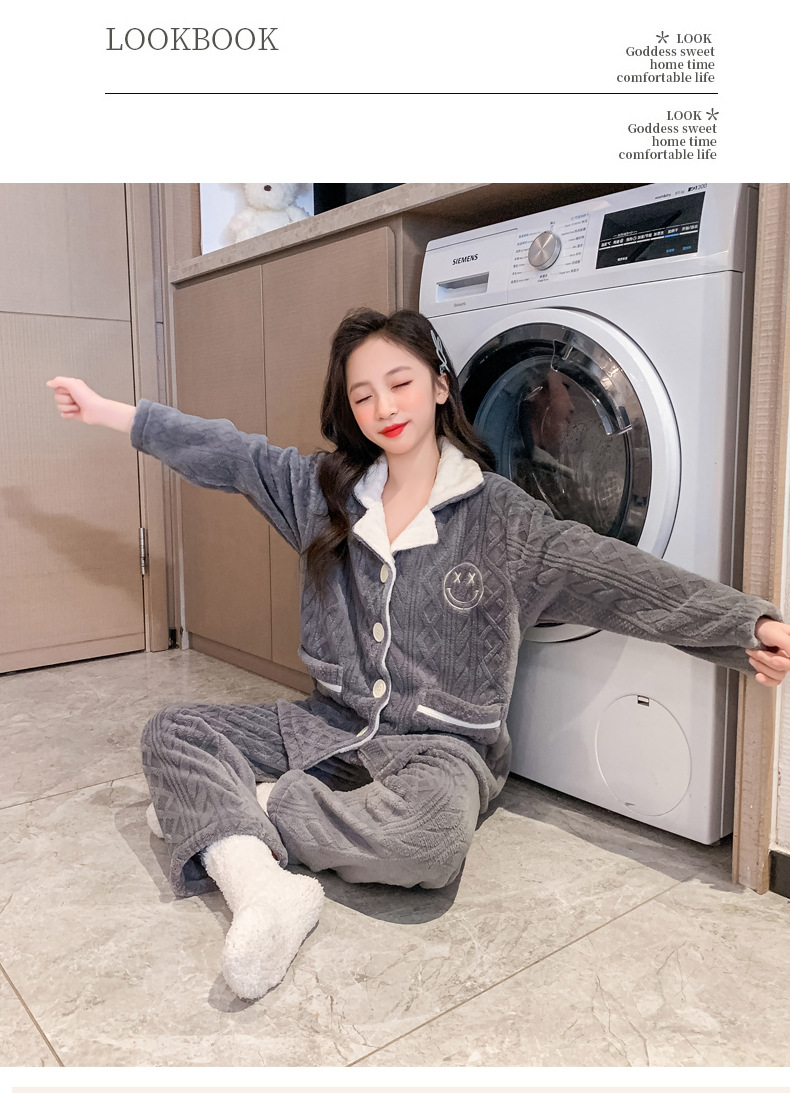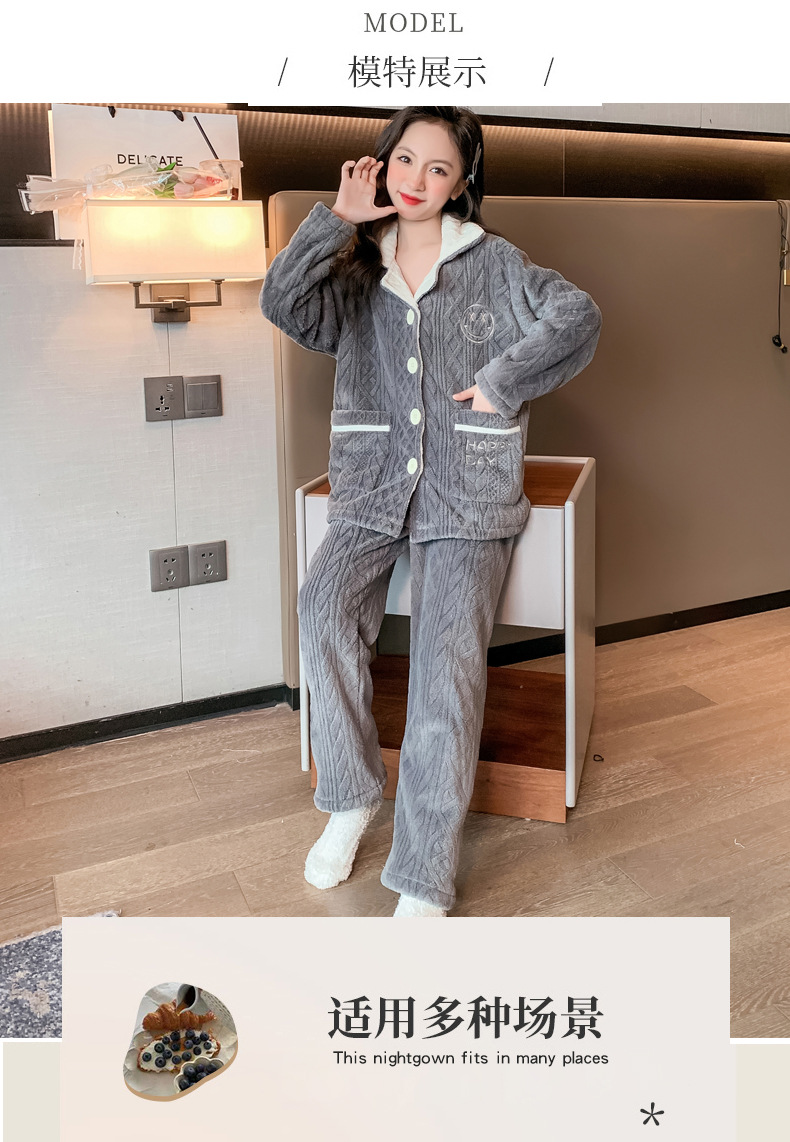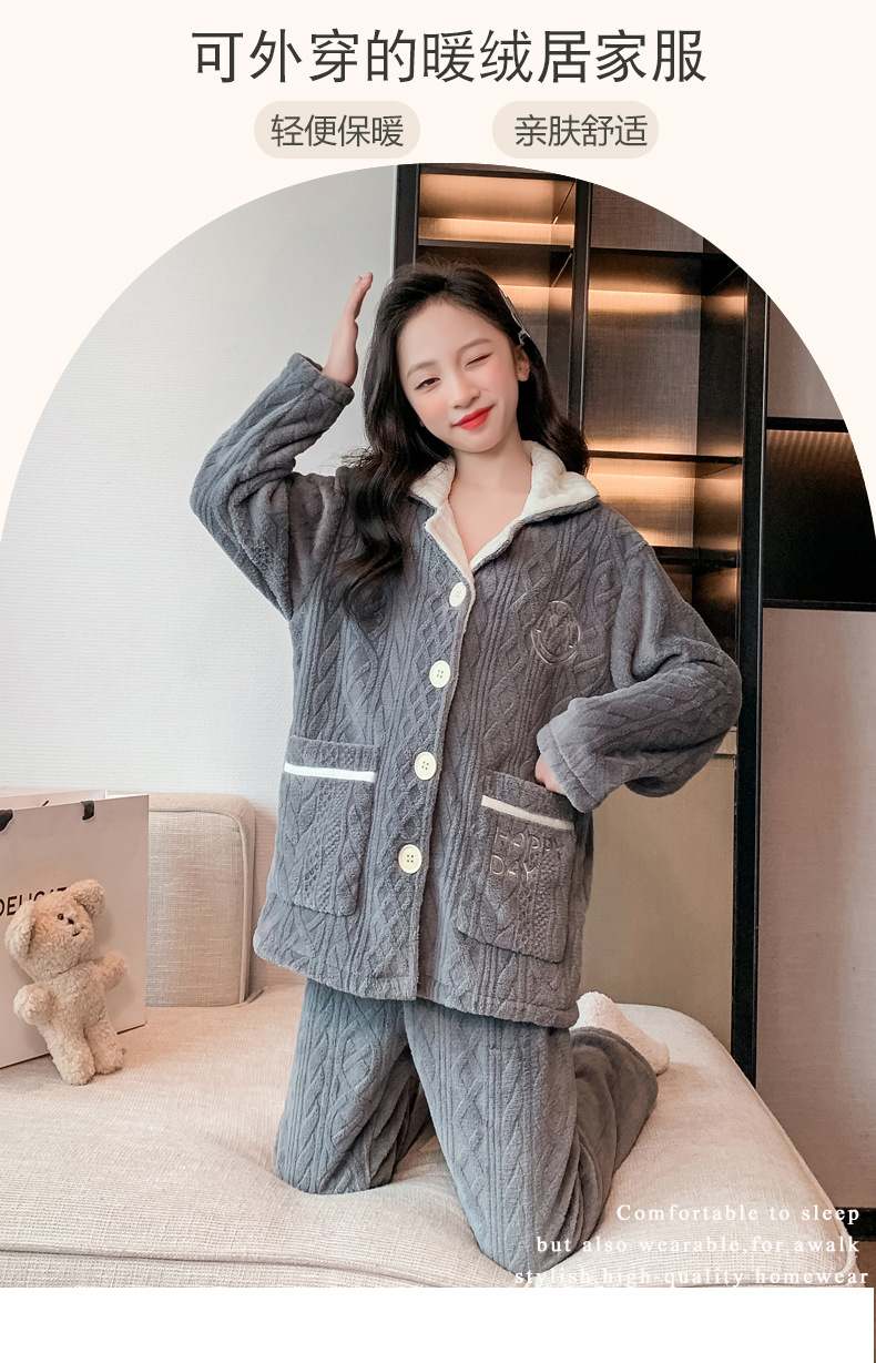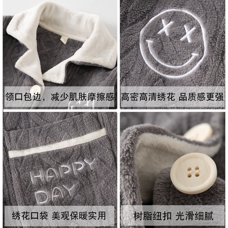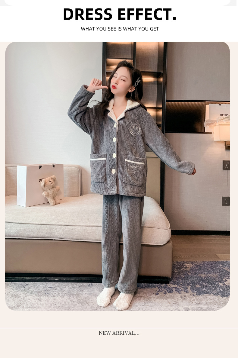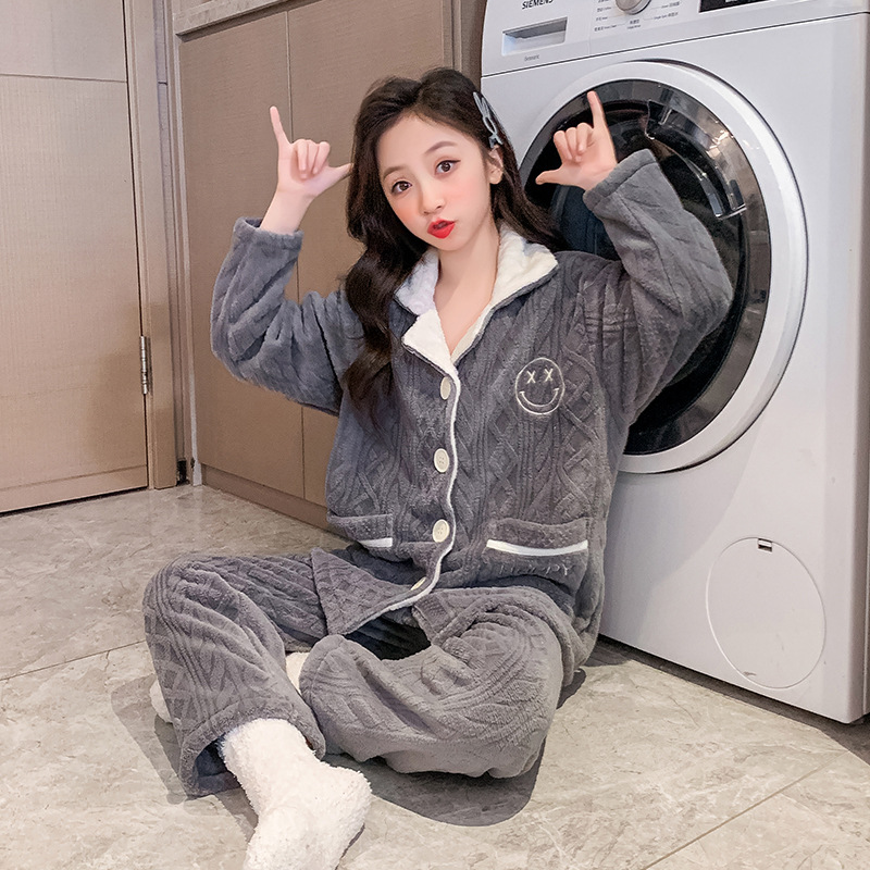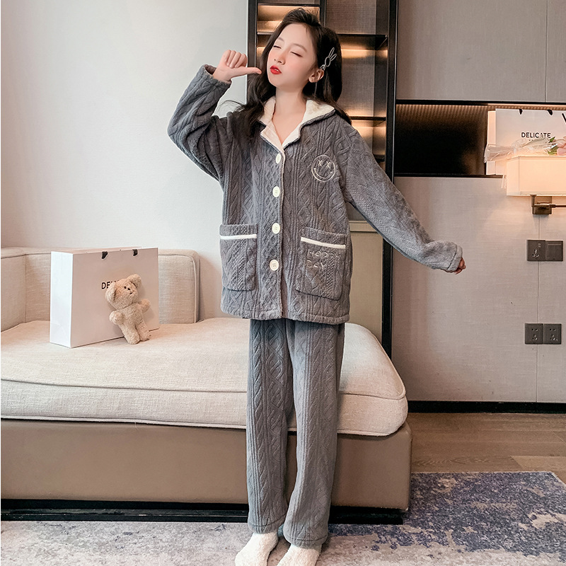 A类儿童家居服提花灰绒翻领笑脸2023秋冬新款法兰绒女童睡衣套装