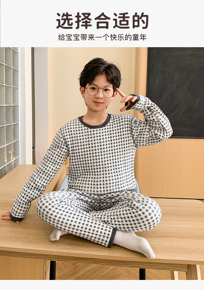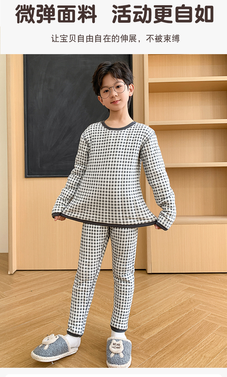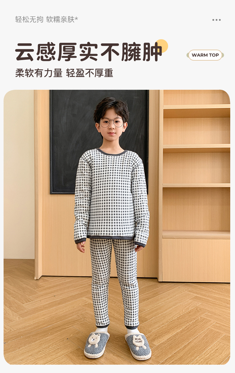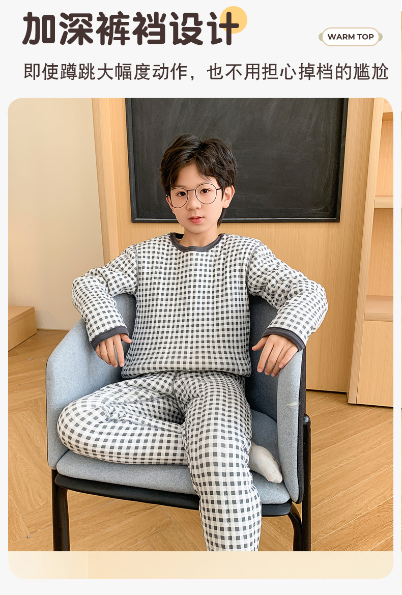 加厚2023新款校服神器格子套装冬季男童 三层夹棉保暖格子睡衣A类