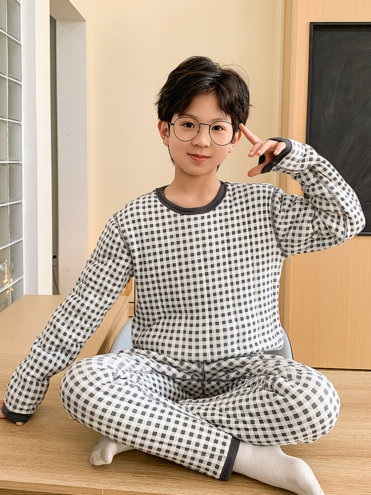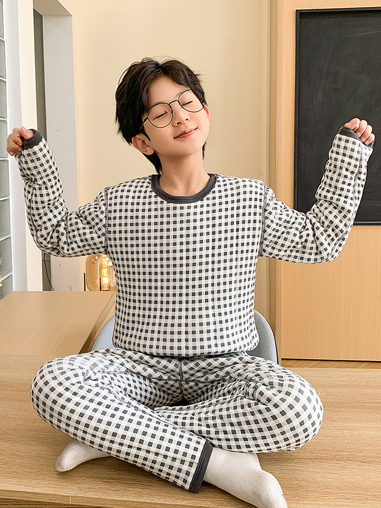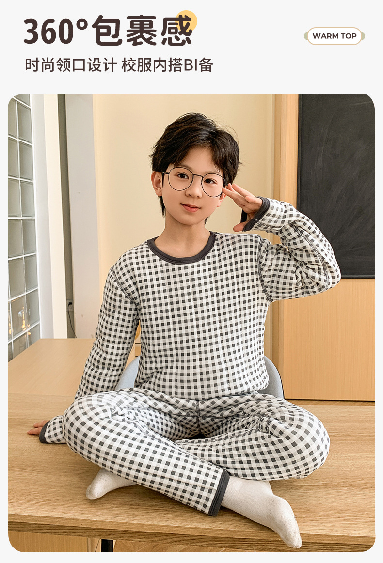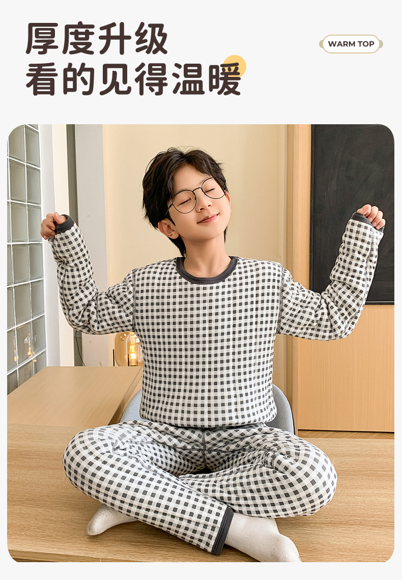 加厚2023新款校服神器格子套装冬季男童 三层夹棉保暖格子睡衣A类