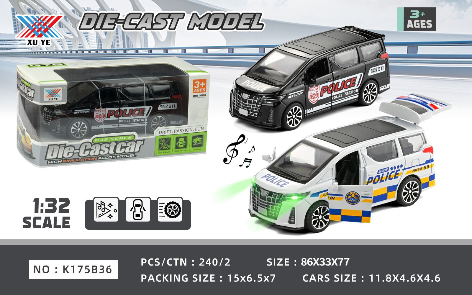1:32仿真合金埃尔法警车模型 回力灯光音乐摆件收藏男孩玩具车