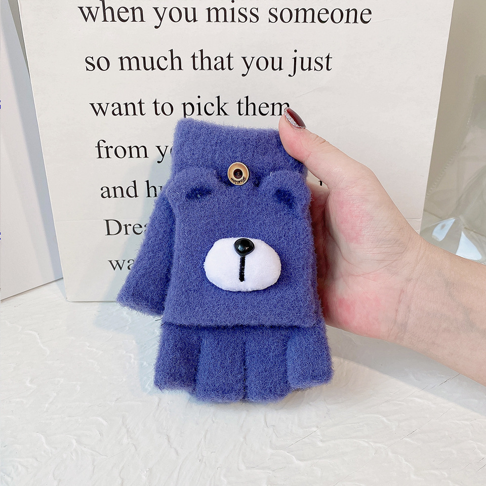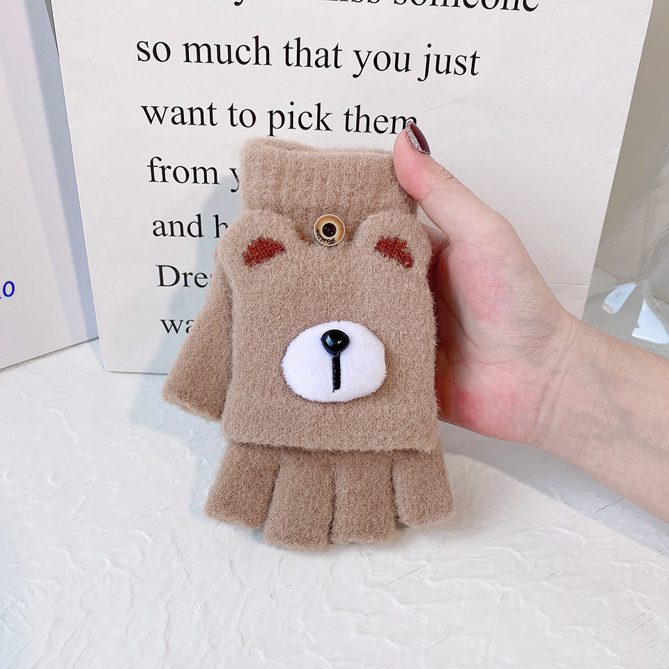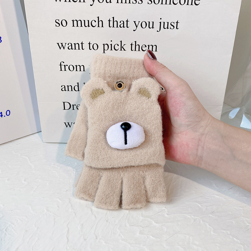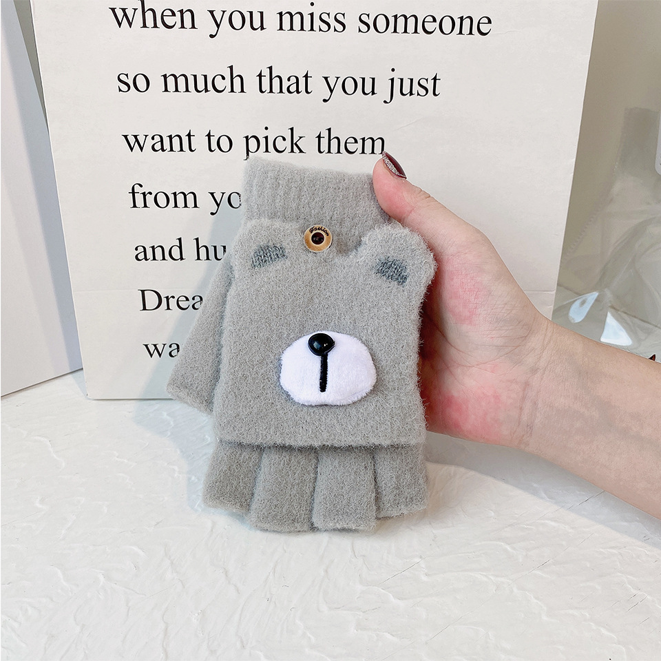 韩版成人毛绒保暖女士冬季防寒加厚半指翻盖卡通小熊办公露指手套