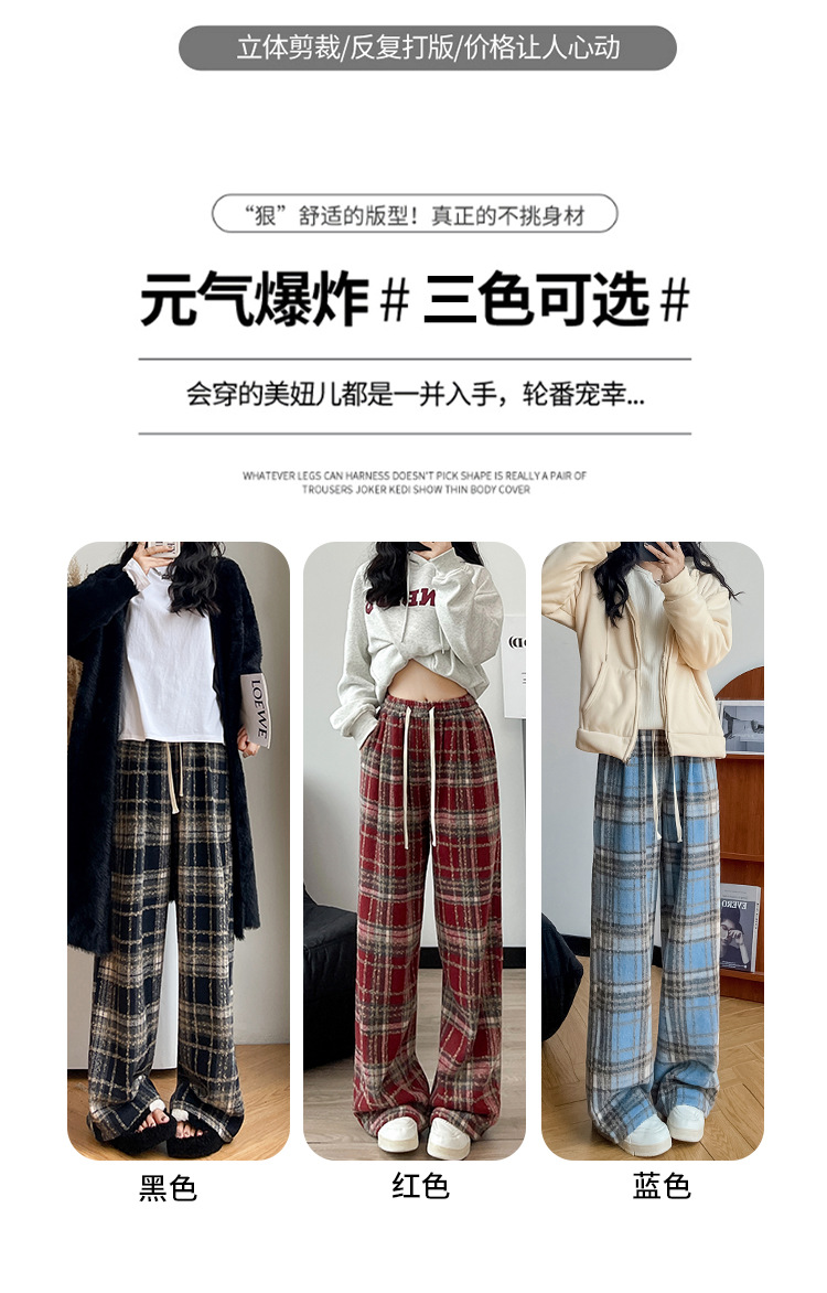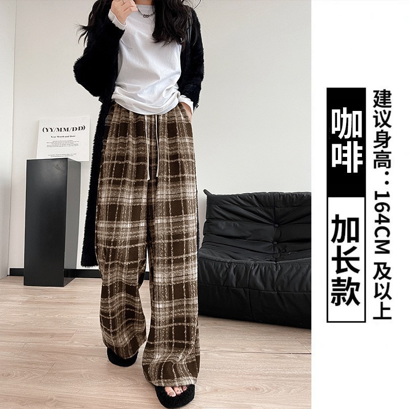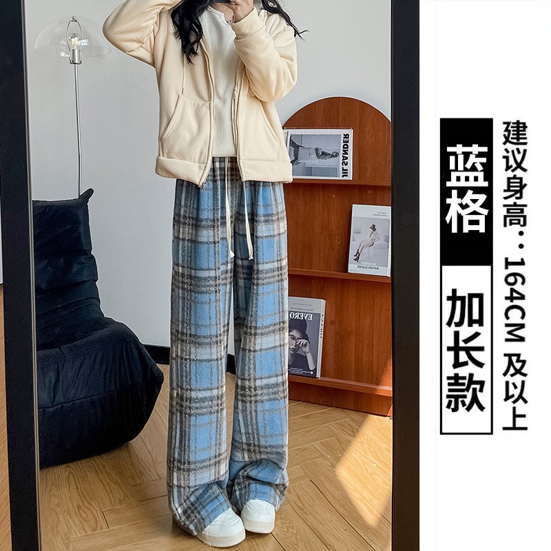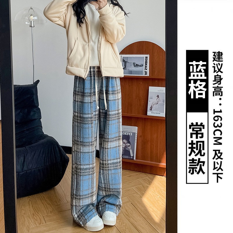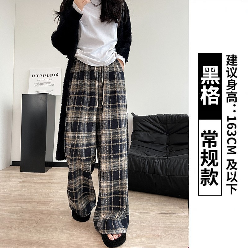 山本毛呢格子裤女秋冬加绒裤子高腰复古休闲直筒裤显瘦拖地阔腿裤